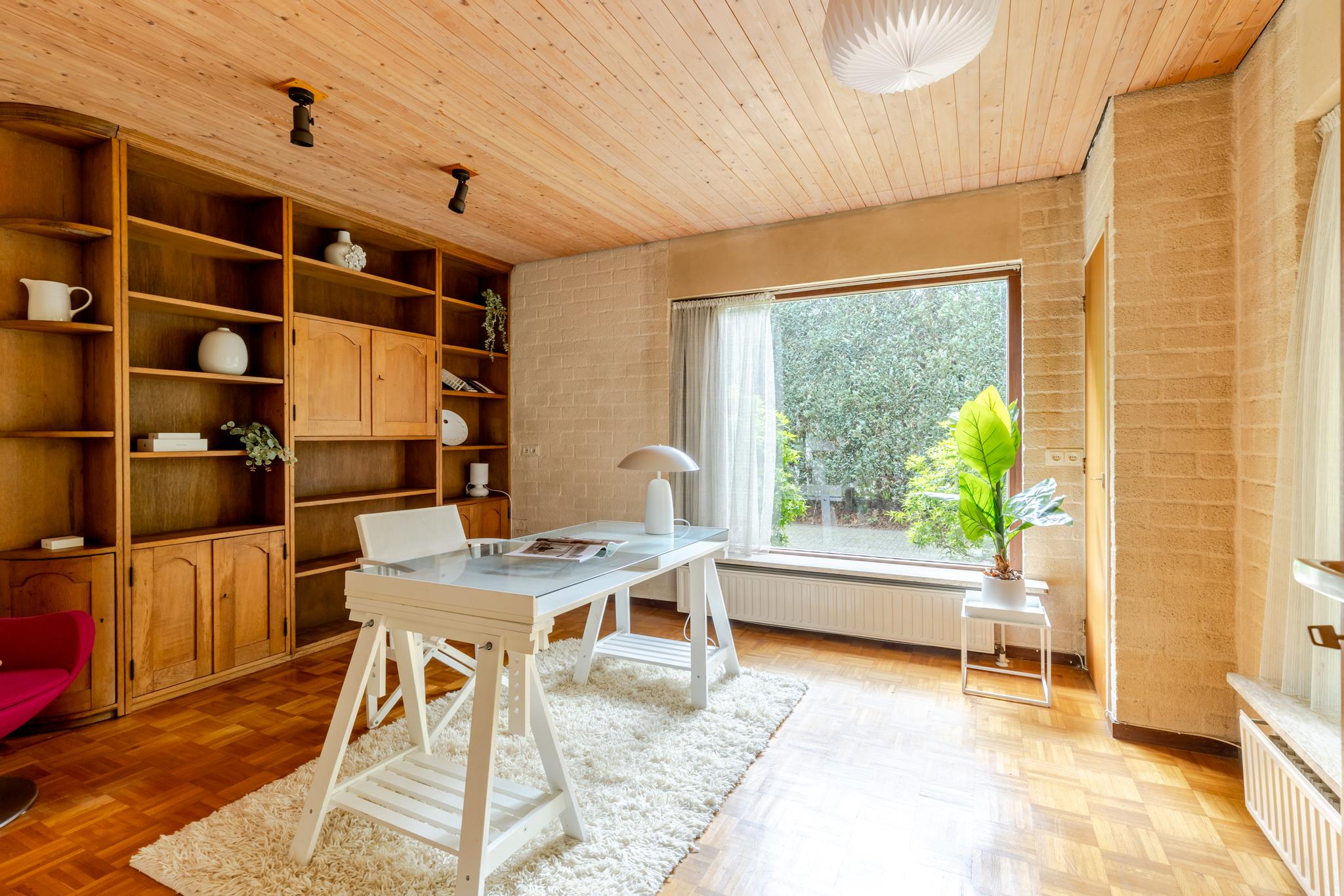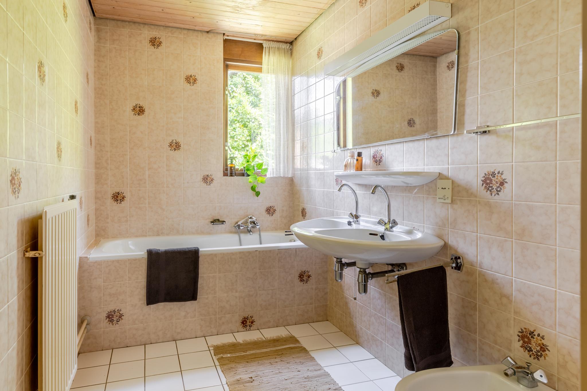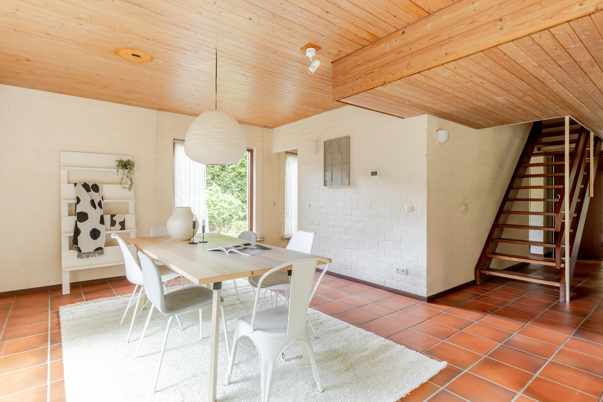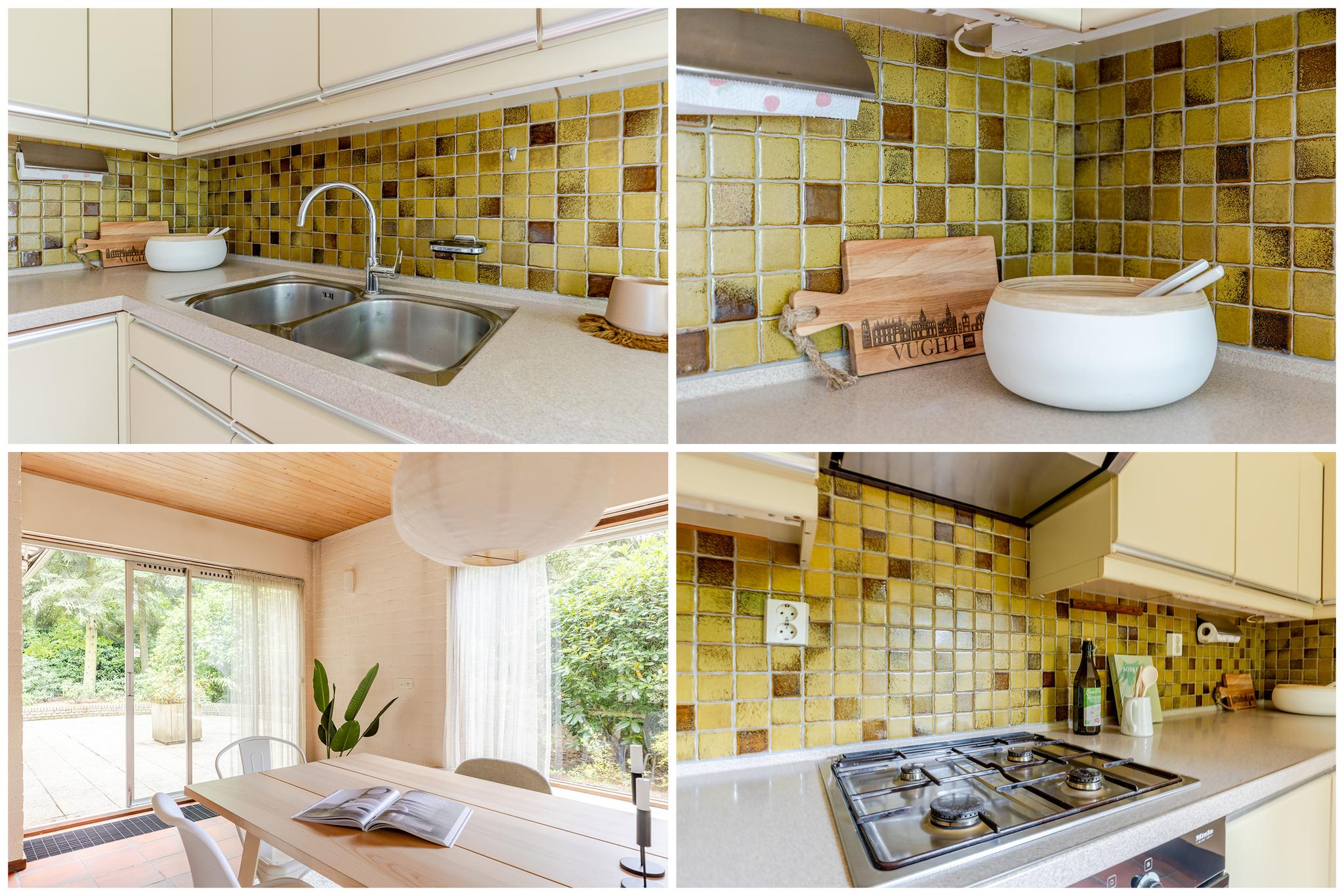 Omringd door het groen ligt deze charmante woning. Via een diepe en brede oprit rijd je het perceel op, hier is meer dan genoeg ruimte voor meerdere auto's. De woning betreed je via de entreehal met tochtportaal, waar je toegang krijgt tot een toilet met fonteintje, een (slaap)kamer en de woonkamer. De extra kamer, die nu dienst doet als werkkamer, kan eenvoudig worden ingericht als slaapkamer, waardoor levensloopbestendig wonen dus ook mogelijk is. In deze kamer vind je ook de meterkast. De woonkamer is royaal en flexibel in te delen met voldoende plek voor een apart zitgedeelte en een eetkamer. Dankzij de grote raampartijen valt het daglicht naar binnen wat de ruimte niet alleen lichter, maar ook warmer en uitnodigender maakt. Het zitgedeelte biedt moeiteloos plek aan een hoekbank, fauteuils en andere meubels. Hier vind je ook nog een sfeervolle haard, ideaal voor de winteravonden en in de eethoek is er meer dan genoeg ruimte voor een royale tafel. Zowel vanuit het zitgedeelte als vanuit de eetkamer loop je via twee schuifpuien zo de tuin in, binnen en buiten lopen hier naadloos in elkaar over. De half open keuken is voorzien van oven, gaskookplaat, koelkast, vriezer en spoelbak. De keuken grenst aan een praktische bijkeuken met aansluiting voor de wasmachine. Vanuit de bijkeuken heb je direct toegang tot de ruime inpandige garage, handig voor je fietsen, auto of als hobbyruimte.