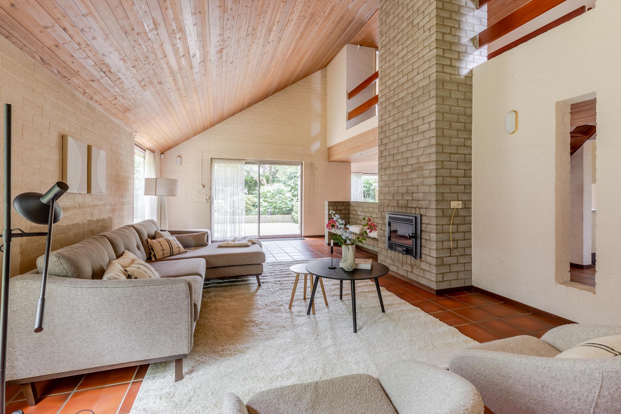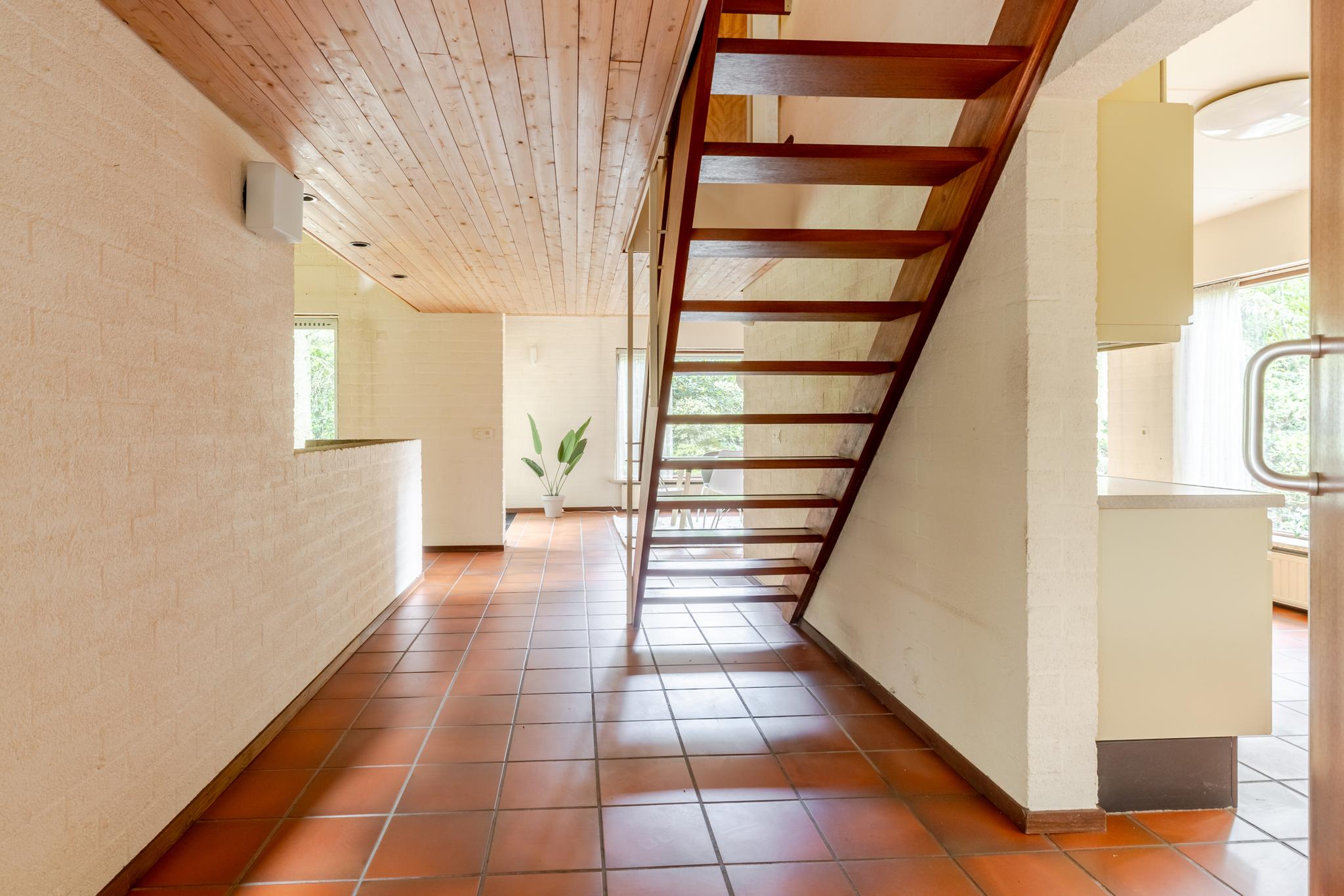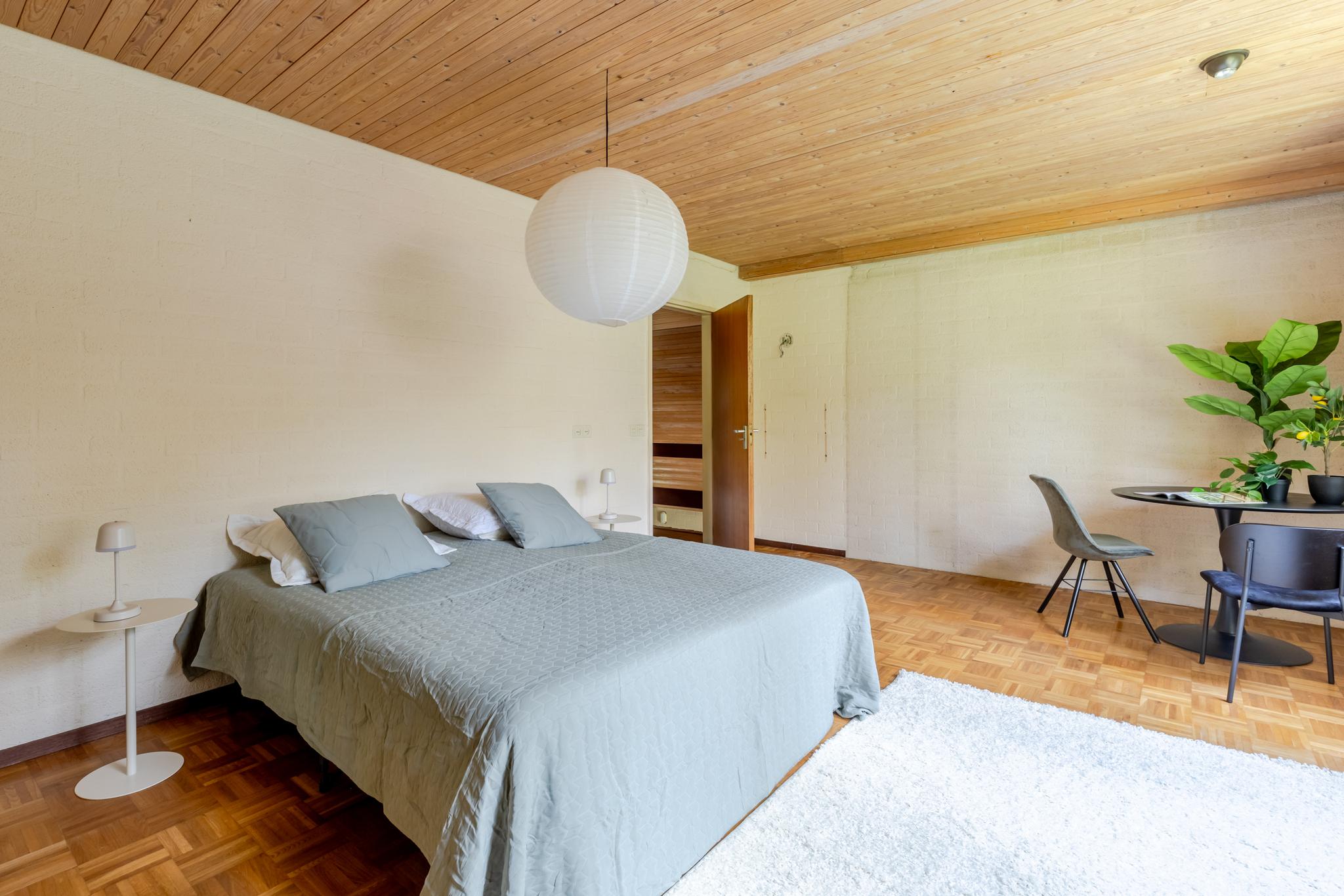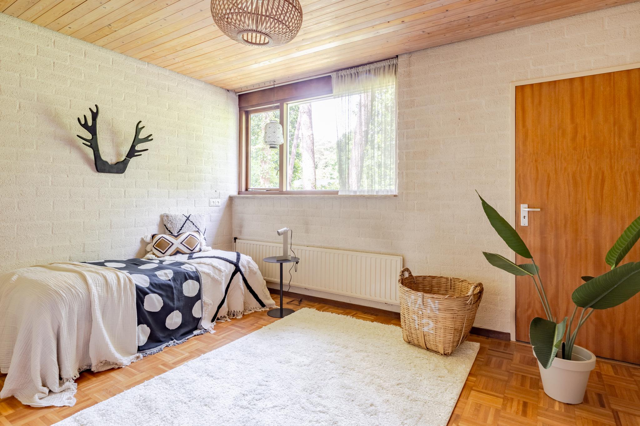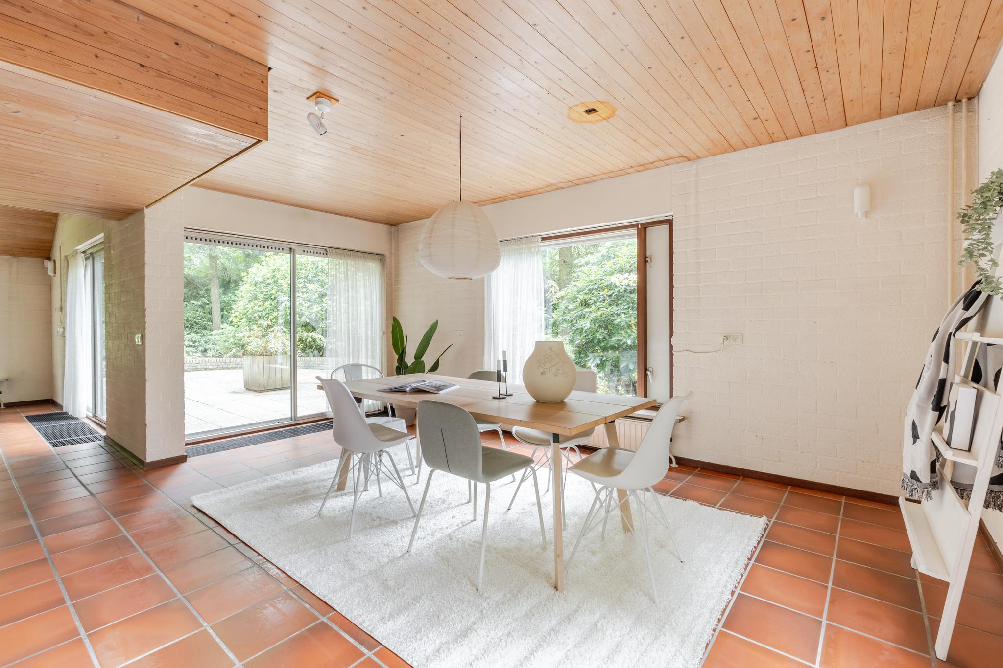 Omringd door het groen ligt deze charmante woning. Via een diepe en brede oprit rijd je het perceel op, hier is meer dan genoeg ruimte voor meerdere auto's. De woning betreed je via de entreehal met tochtportaal, waar je toegang krijgt tot een toilet met fonteintje, een (slaap)kamer en de woonkamer. De extra kamer, die nu dienst doet als werkkamer, kan eenvoudig worden ingericht als slaapkamer, waardoor levensloopbestendig wonen dus ook mogelijk is. In deze kamer vind je ook de meterkast. De woonkamer is royaal en flexibel in te delen met voldoende plek voor een apart zitgedeelte en een eetkamer. Dankzij de grote raampartijen valt het daglicht naar binnen wat de ruimte niet alleen lichter, maar ook warmer en uitnodigender maakt. Het zitgedeelte biedt moeiteloos plek aan een hoekbank, fauteuils en andere meubels. Hier vind je ook nog een sfeervolle haard, ideaal voor de winteravonden en in de eethoek is er meer dan genoeg ruimte voor een royale tafel. Zowel vanuit het zitgedeelte als vanuit de eetkamer loop je via twee schuifpuien zo de tuin in, binnen en buiten lopen hier naadloos in elkaar over. De half open keuken is voorzien van oven, gaskookplaat, koelkast, vriezer en spoelbak. De keuken grenst aan een praktische bijkeuken met aansluiting voor de wasmachine. Vanuit de bijkeuken heb je direct toegang tot de ruime inpandige garage, handig voor je fietsen, auto of als hobbyruimte.