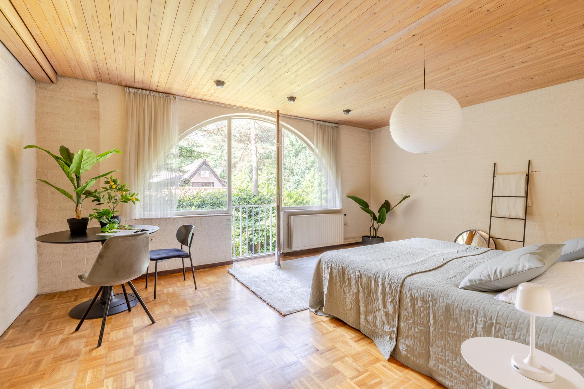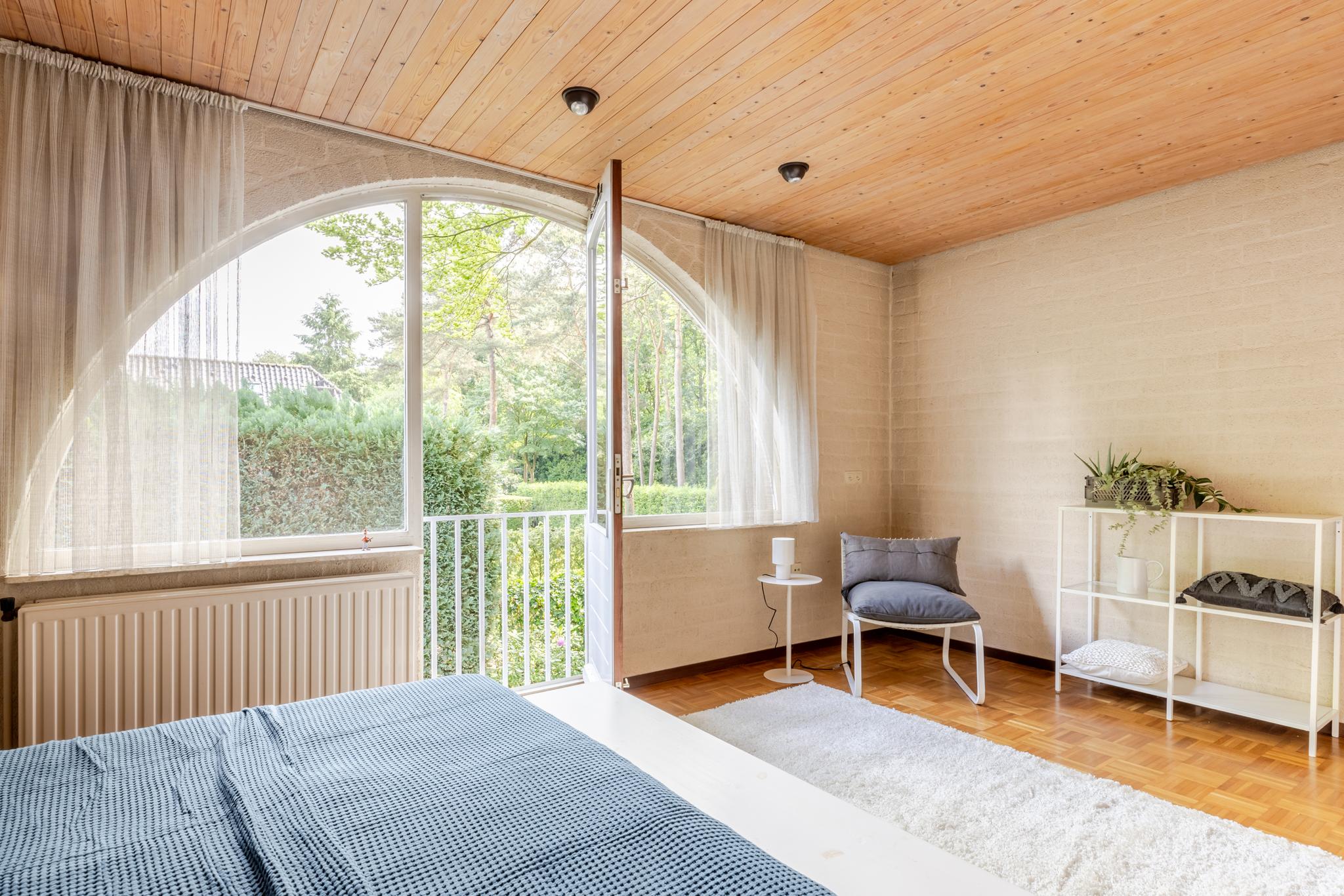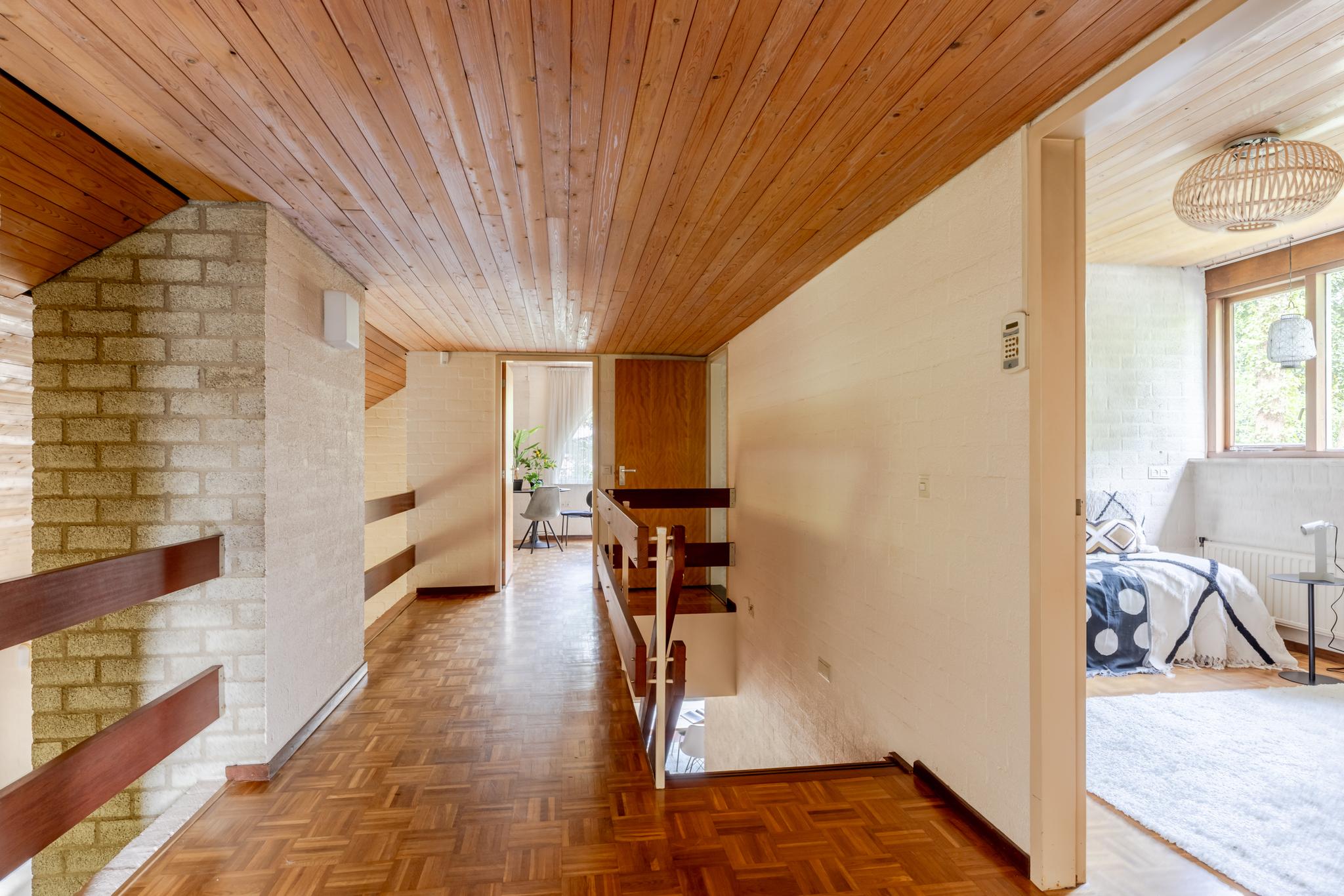 Op de eerste verdieping kom je uit op een ruime overloop met vide die een doorkijk biedt naar de woonkamer beneden. Over de gehele verdieping is een tijdloze parketvloer gelegd. Het open karakter geeft de verdieping een ruimtelijk en luchtig gevoel, een fijne binnenkomer op deze slaapkamer. Vanaf de overloop heb je toegang tot drie ruime slaapkamers en twee badkamers. De drie slaapkamers zijn royaal genoeg voor een tweepersoonsbed, een kledingkast en eventueel een bureau of extra meubelstuk. Twee kamers beschikken bovendien over een Frans balkon, een elegant detail dat zorgt voor extra licht, frisse lucht en een charmant uitzicht op het groen rondom de woning. Vanuit een slaapkamer heb je toegang tot een praktische berging voorzien van dakraam en volop opbergruimte. De twee badkamers bieden ieder hun eigen comfort. De eerste badkamer is uitgerust met ligbad, dubbele wastafel en toilet. De tweede badkamer beschikt over een inloopdouche, wastafel en toilet.