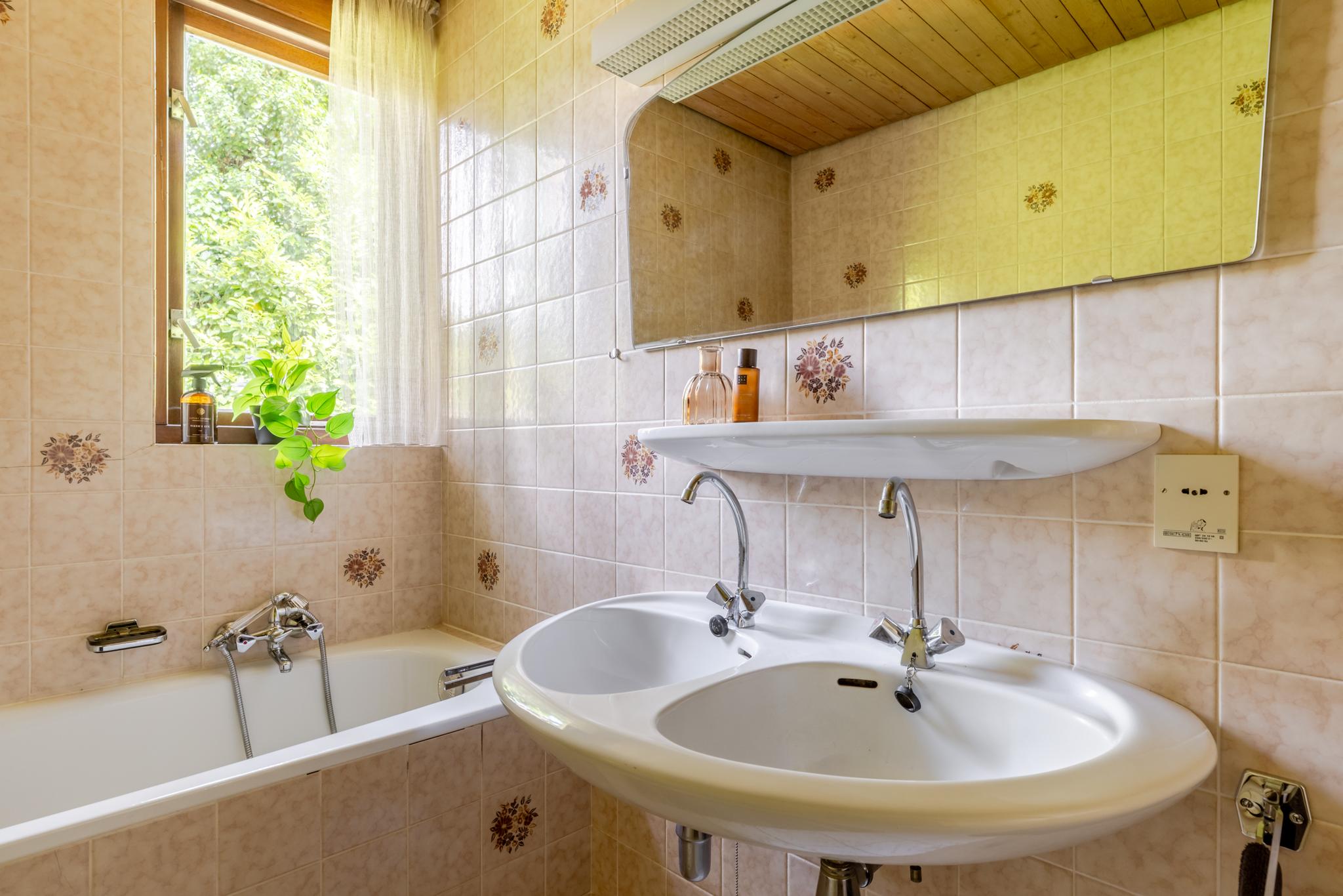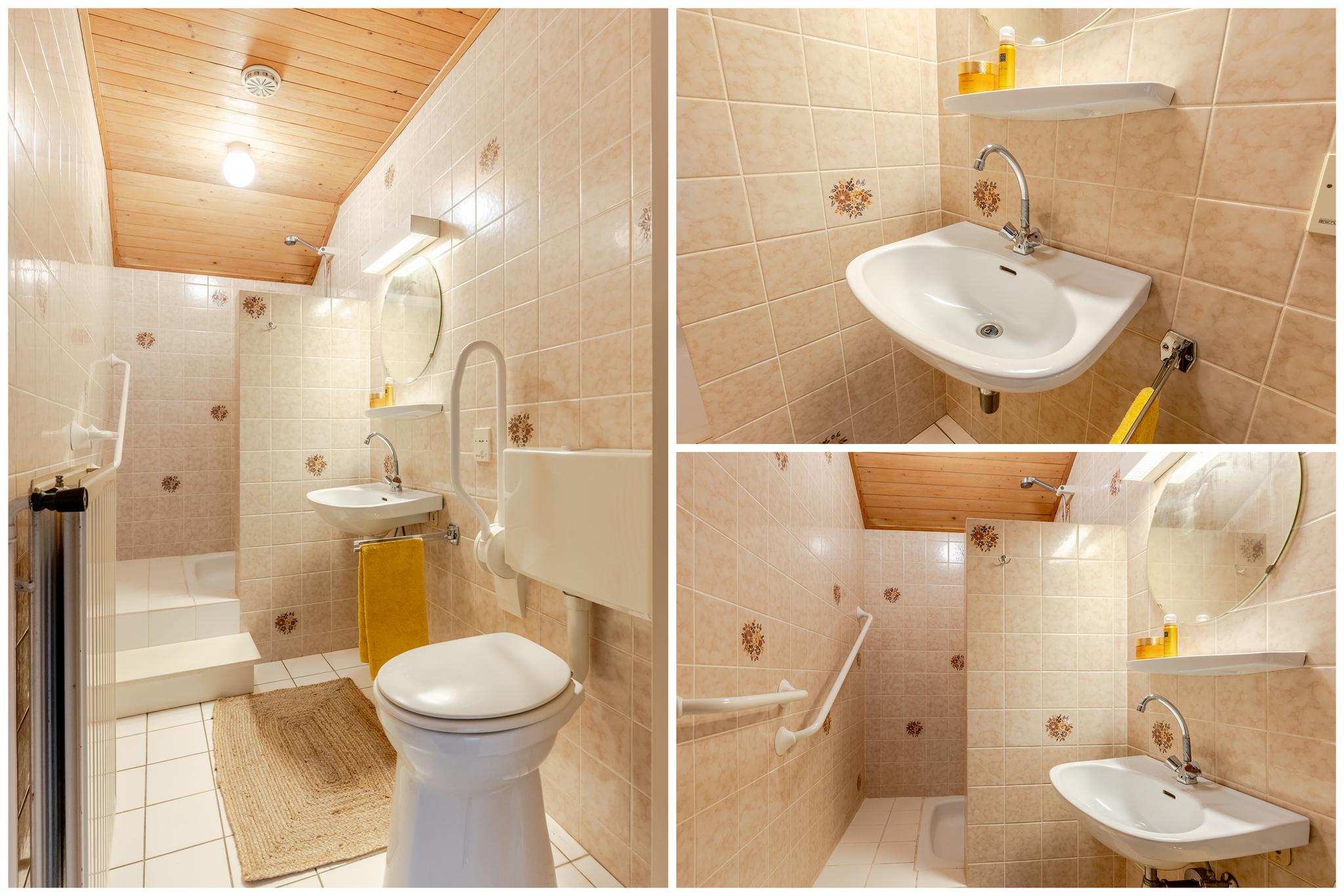 - Ligbad, toilet, dubbele wastafel, wastafel en inloopdouche