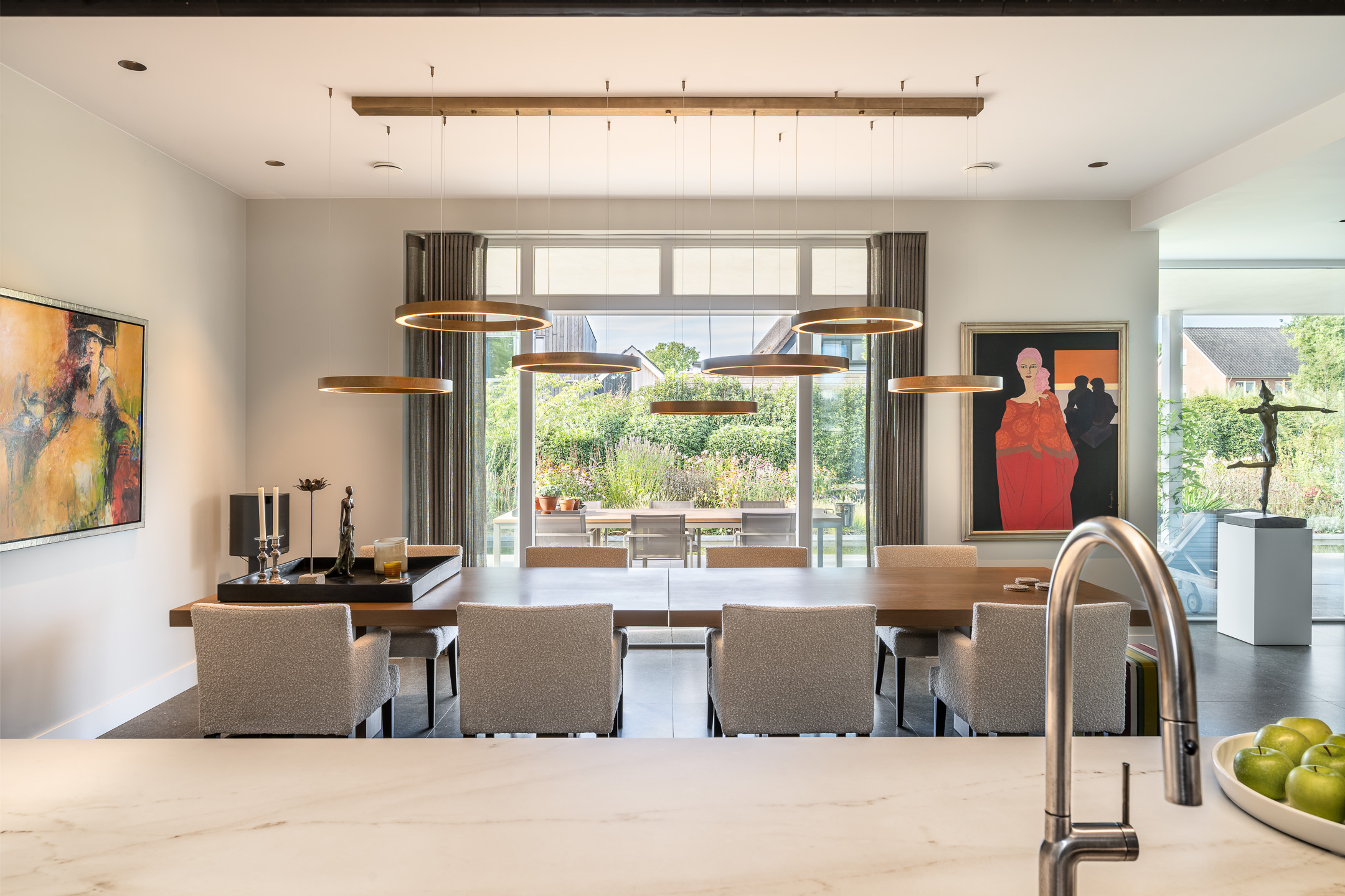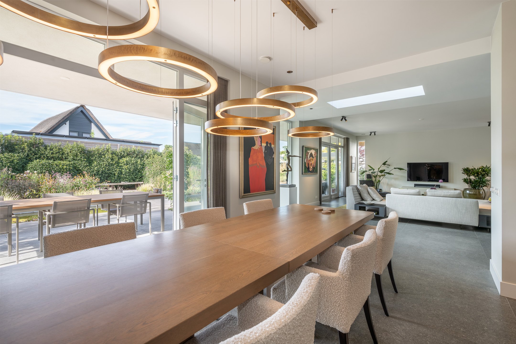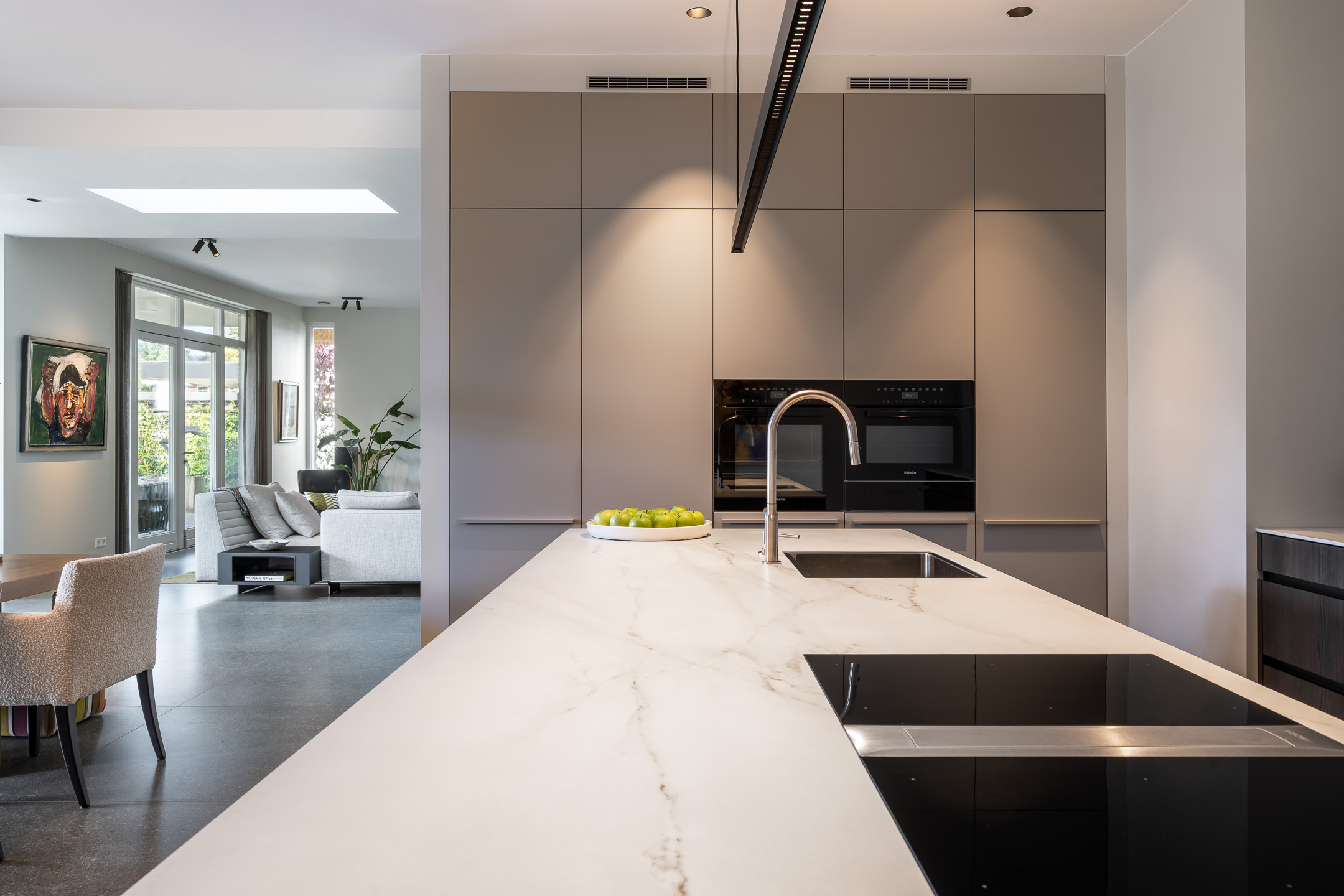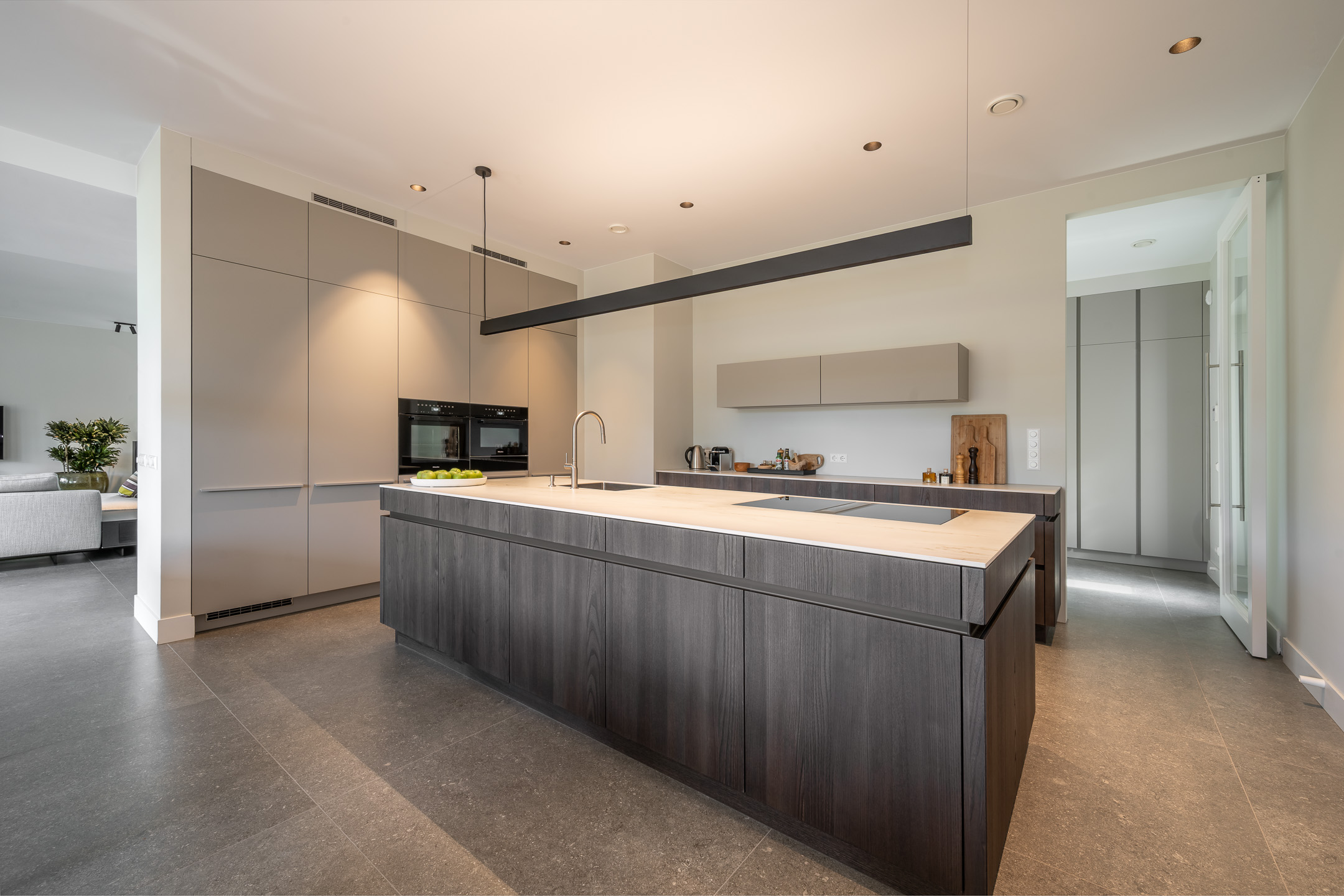 Aan de andere zijde van de living bevindt zich de luxe woonkeuken met openslaande deuren naar het overdekte terras. Voorzien van luxe keukenopstelling met kookeiland en Dekton werkbladen en van hoogwaardige inbouwapparatuur zoals een Bora inductiekookplaat met geïntegreerde afzuiging, koelkast, vrieskast, oven, een combi-magnetron/oven en vaatwasser. Het geheel is stijlvol afgewerkt en biedt volop werk- en kastruimte.