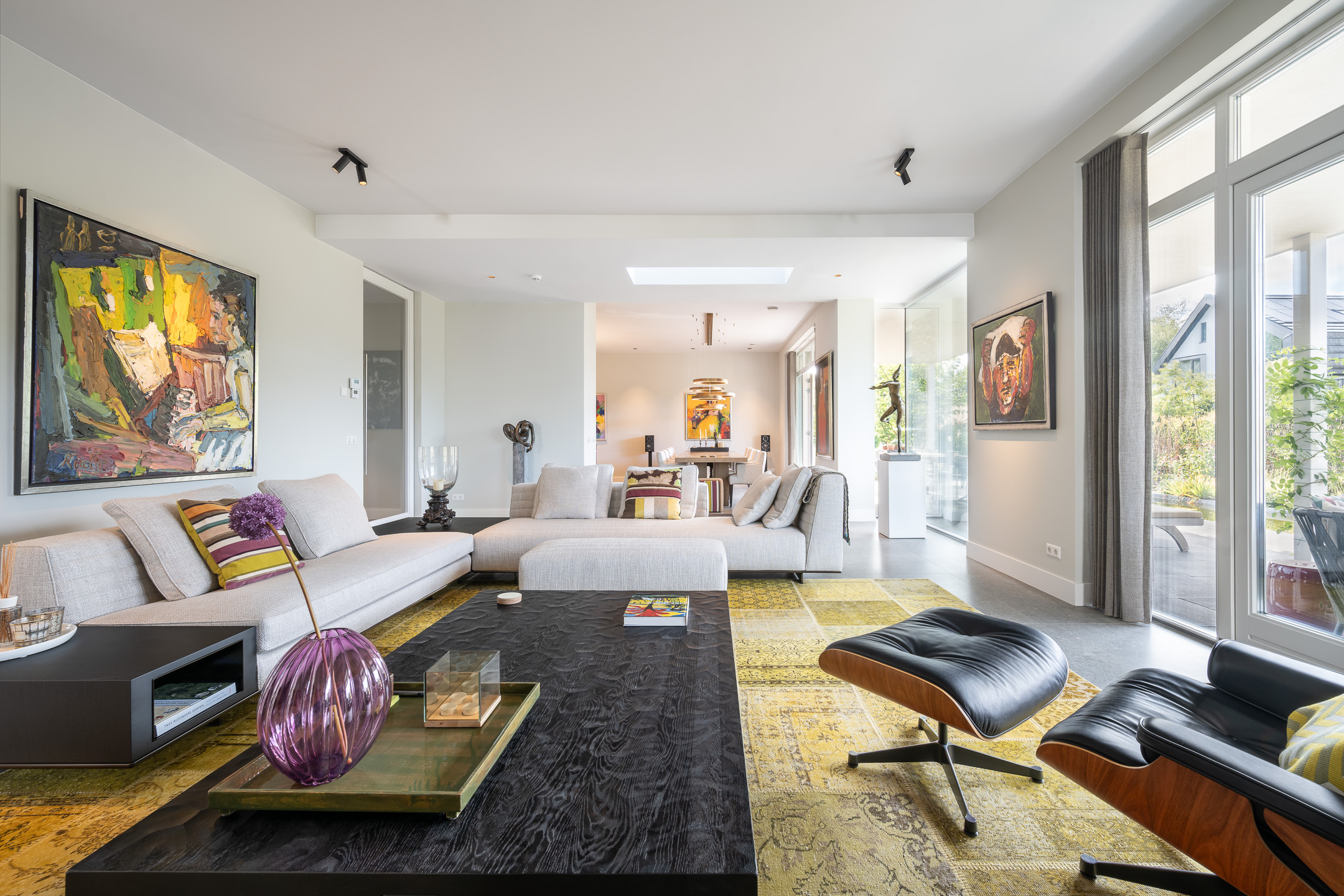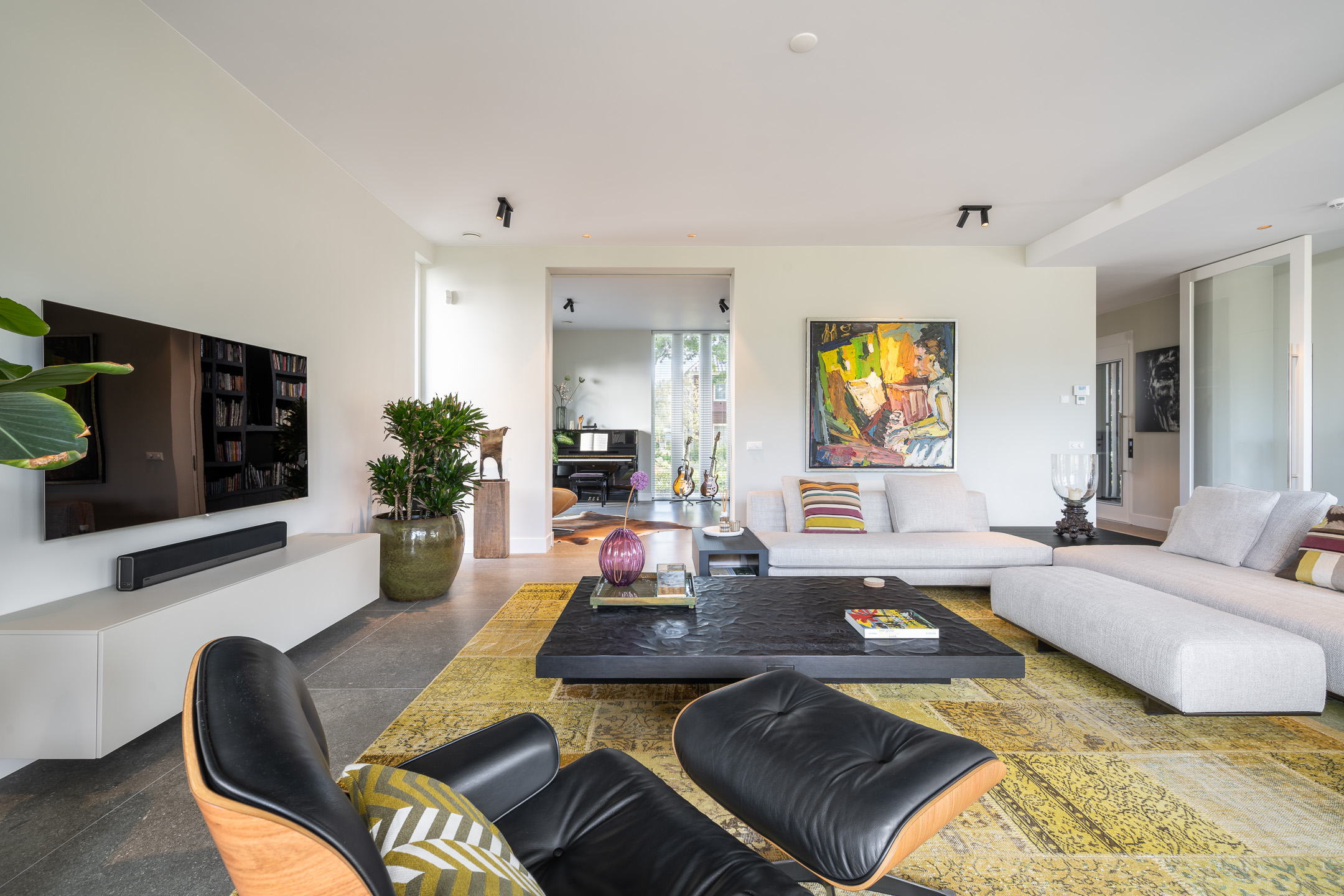 De woonkamer heeft extra hoge plafonds, grote raampartijen en een daklicht, waardoor er een overvloed aan licht binnenvalt en er prachtig uitzicht is op de tuin en de veranda. Aangrenzend aan de woonkamer ligt een middels schuifdeuren afsluitbare ruimte die thans in gebruik is als muziekruimte/bibliotheek met vaste kastenwand, maar ook uitstekend kan fungeren als kantoor of speelkamer.