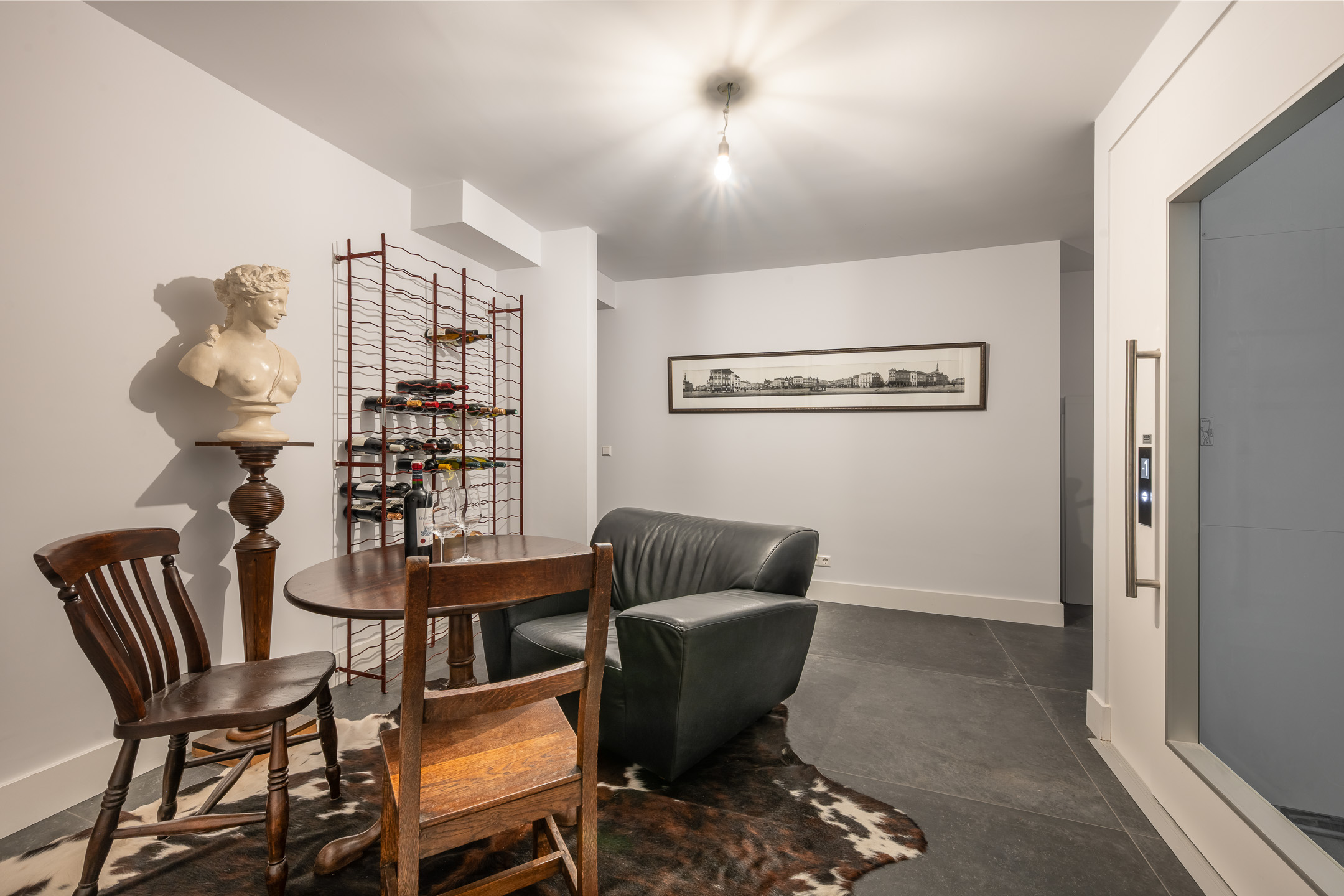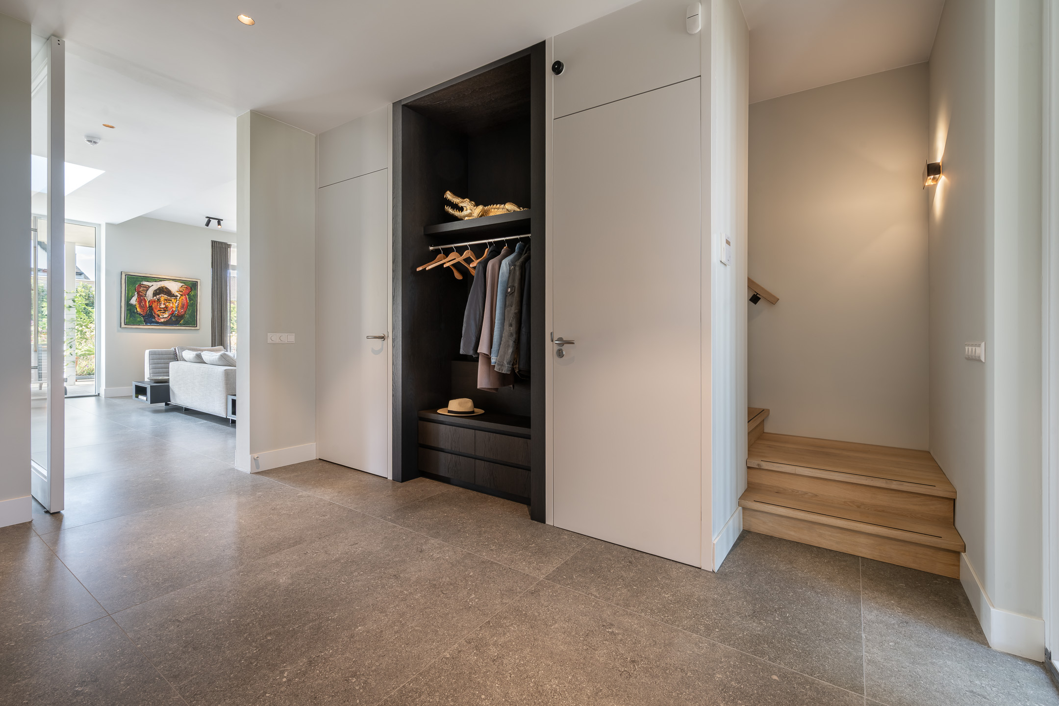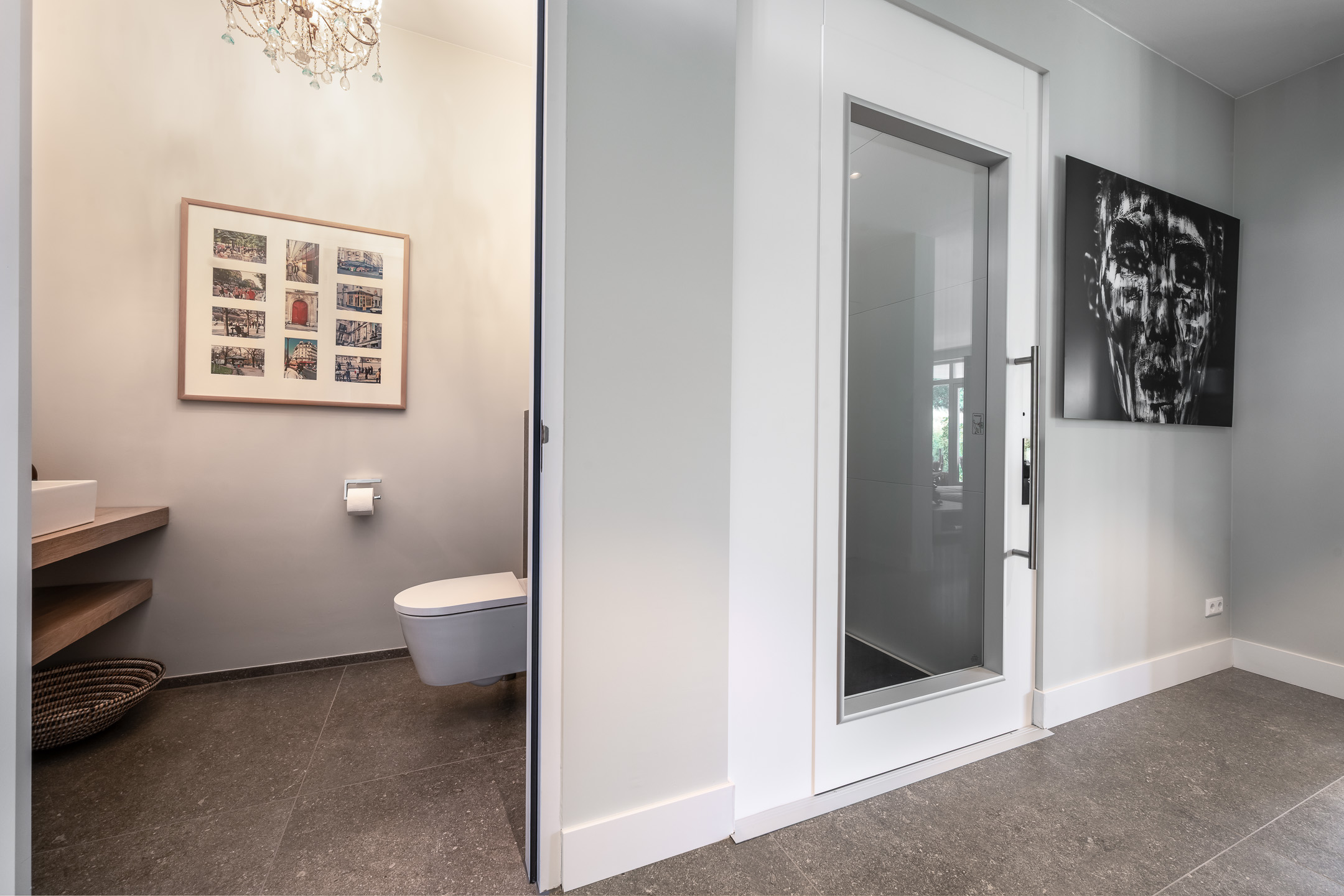 De royale hal vormt een indrukwekkende entree. Een prachtige garderobe waarin de verlichting geraffineerd verstopt is, een comfortabele lift die u naar alle verdiepingen brengt, het luxe, grote toilet, de uitgebreide meterkast en de toegang tot zowel de kelder, de eerste verdieping en de leefruimte.
