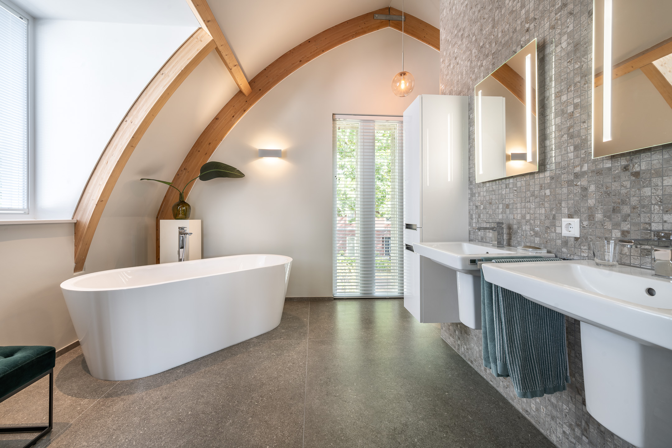 - Toilet, wastafelmeubel, inloopdouche, wasmachineaansluiting, ligbad, bidet en dubbele wastafel