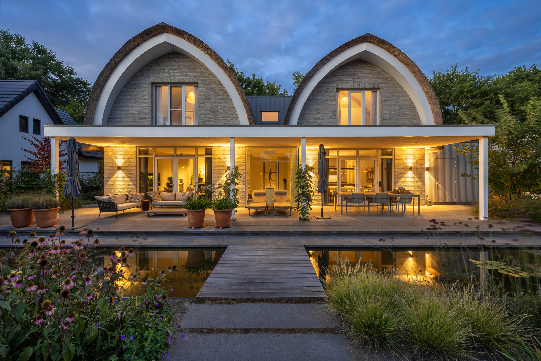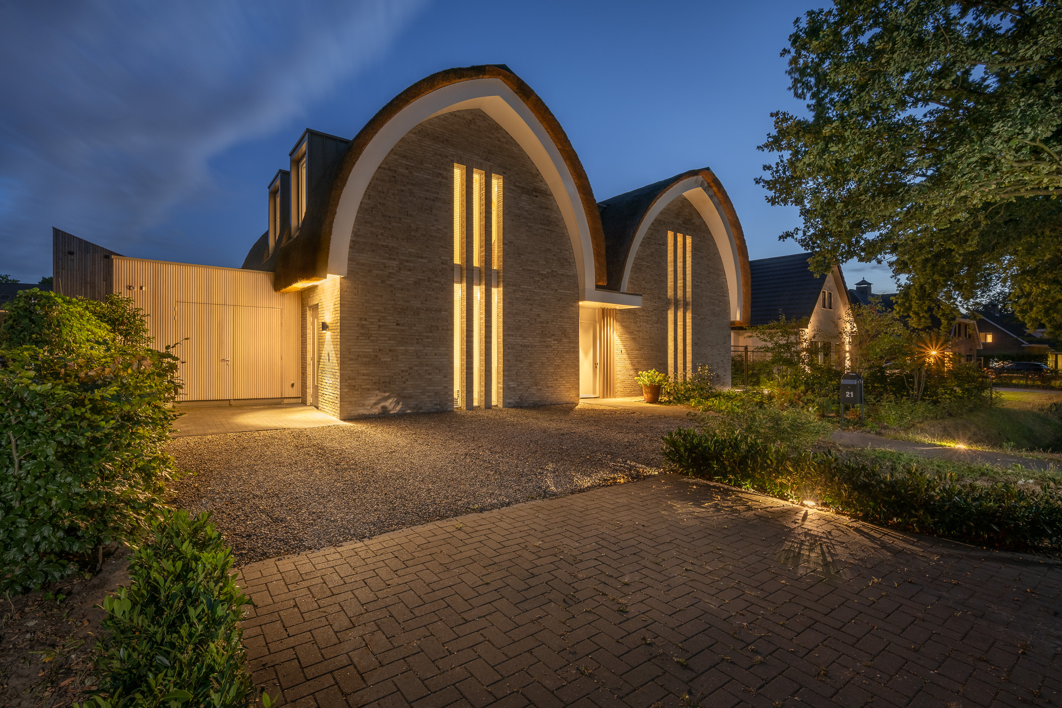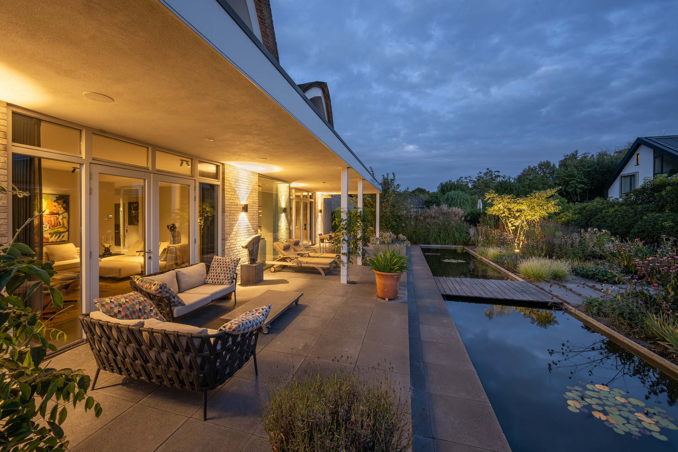 De tuin is evenals de villa onder architectuur aangelegd. De achtertuin is voorzien van een grote vijverpartij, overdekt terras met ingebouwde luidsprekers, rondom zorgvuldig gekozen planten en rondom BEGA tuinverlichting. Dankzij de ruime oprit is er parkeergelegenheid voor maar liefst vijf auto’s.