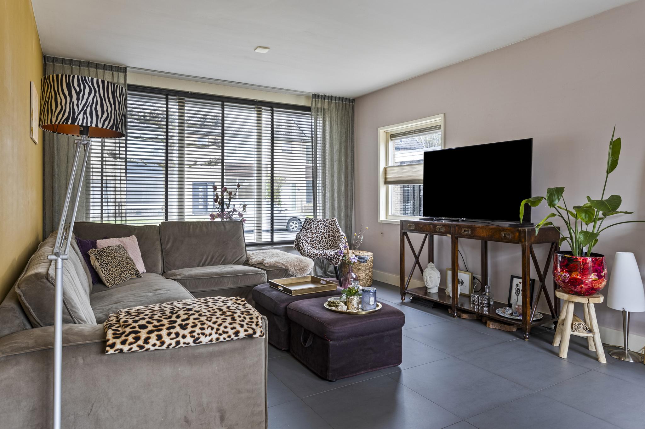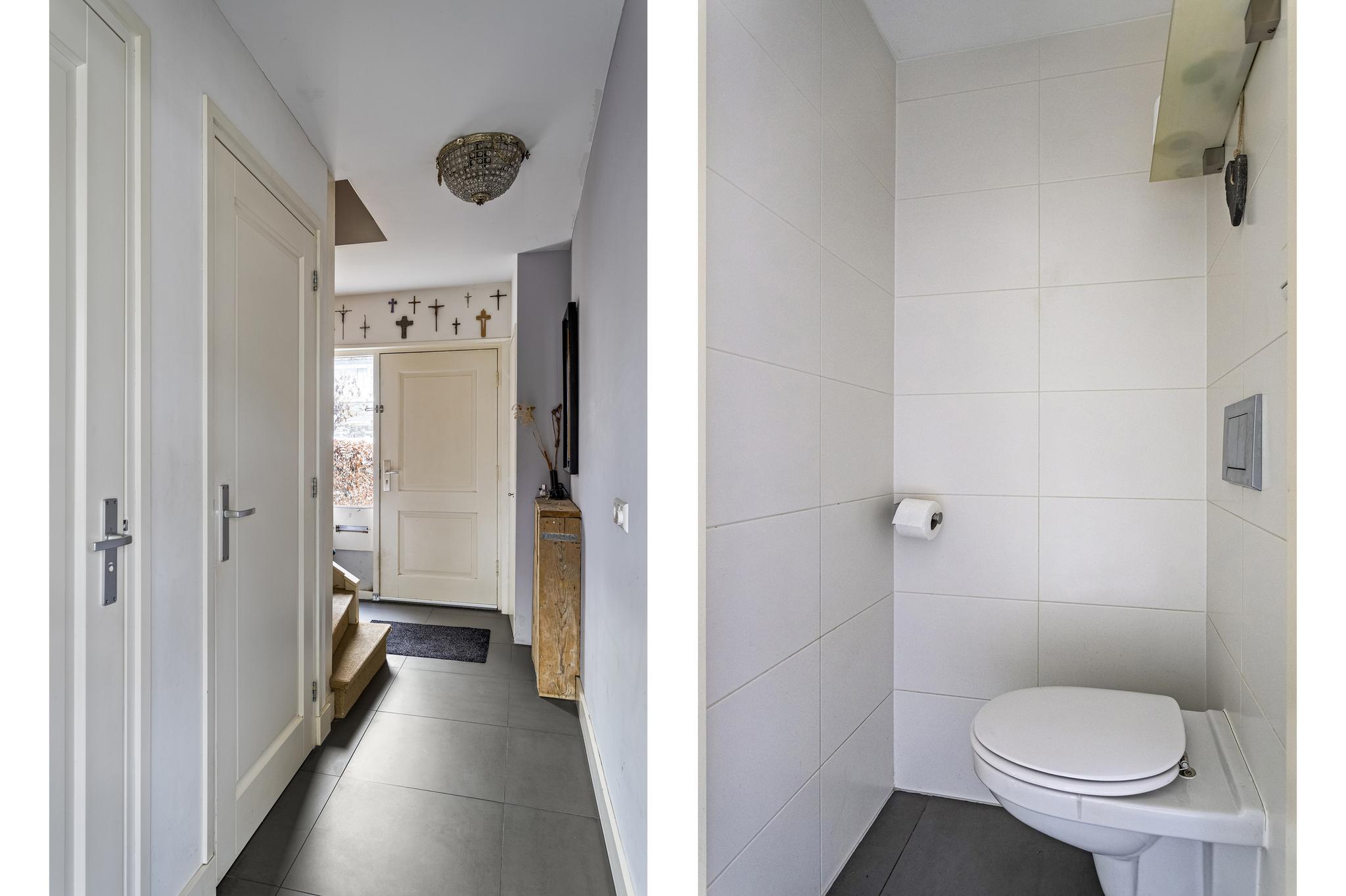 In de hal vind je de vernieuwde meterkast, moderne toiletruimte met wandcloset en praktische kast onder de trapopgang naar de eerste verdieping. Via een glasdeur in de hal komen we in de woonkamer. De woonkamer is voorzien van een donker grijze tegelvloer met vloerverwarming en grote raampartijen aan de voorzijde en achterzijde van de woning, wat zorgt voor een prettige lichtinval. Aan de achterzijde van de woning bevindt zich de eethoek en de keuken.