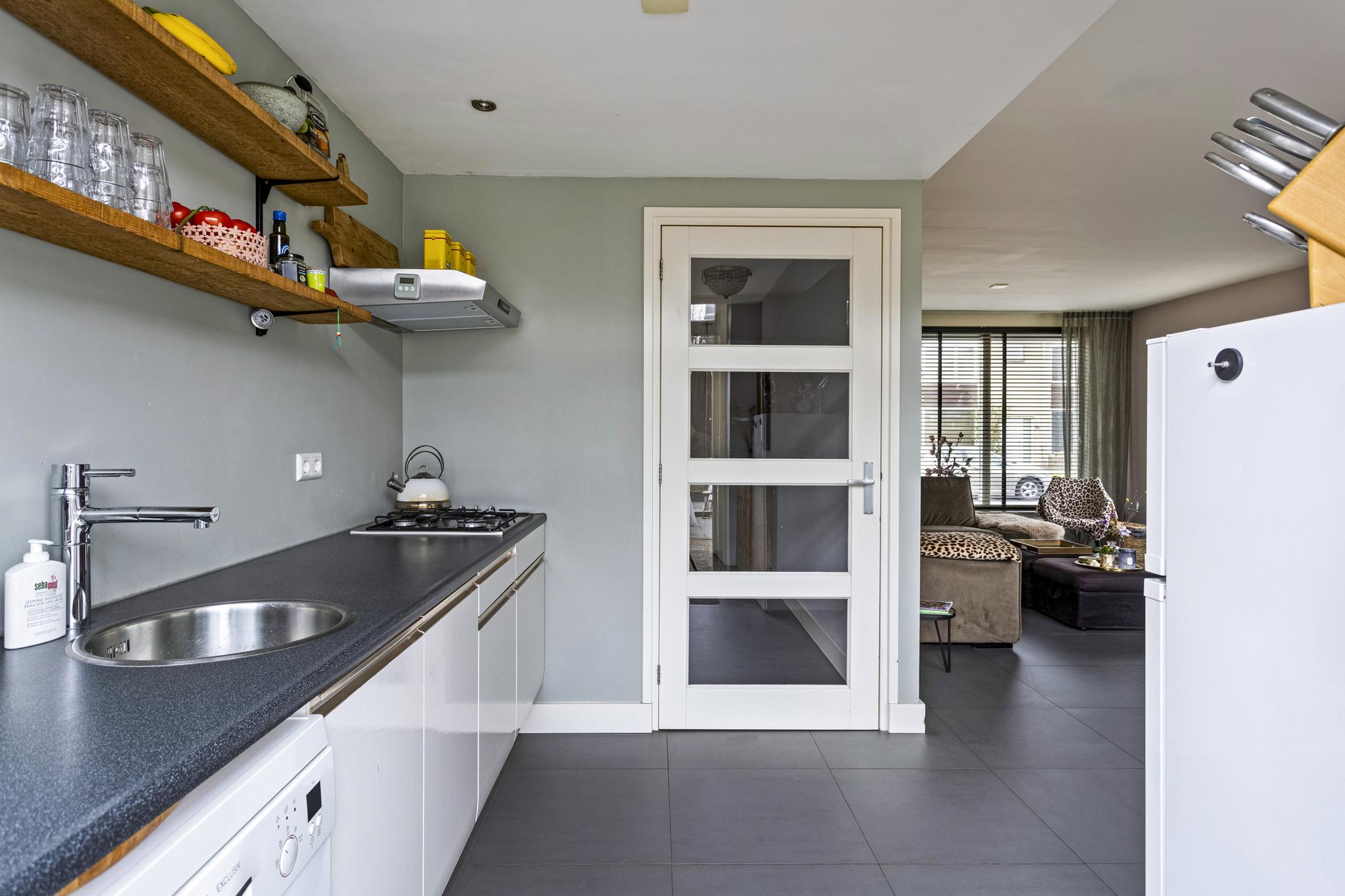 De open keuken staat in verbinding met de eethoek en is voorzien van een 4-pits gaskookplaat, afzuiging en losse vaatwasser.