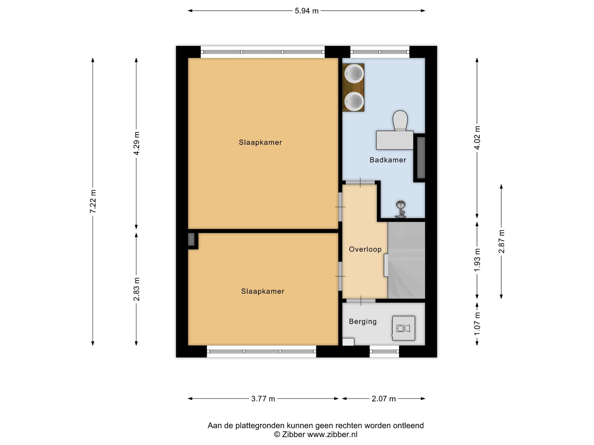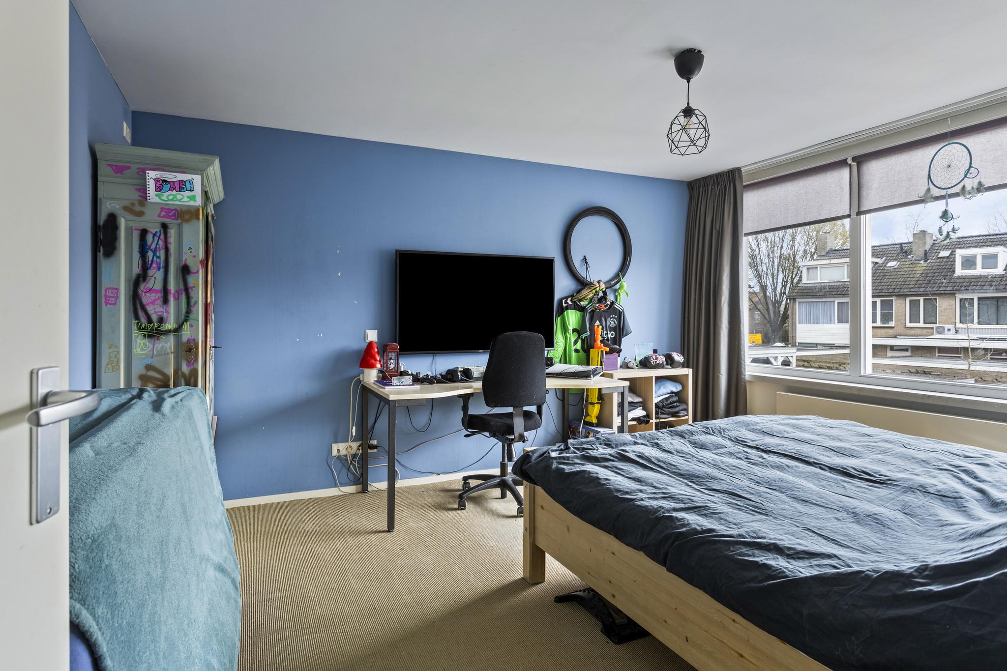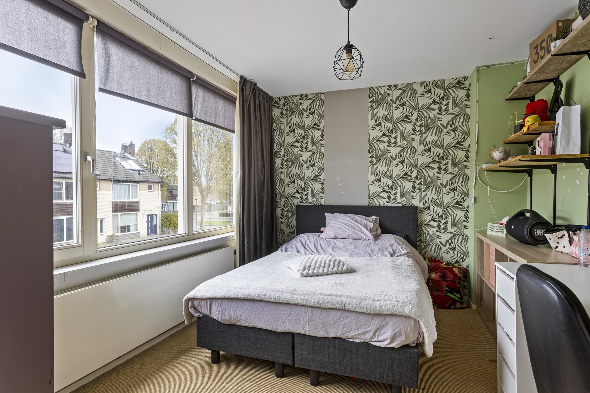 De overloop biedt toegang tot twee slaapkamers en de badkamer. Beide slaapkamers hebben voldoende ruimte voor een tweepersoonsbed en kasten.