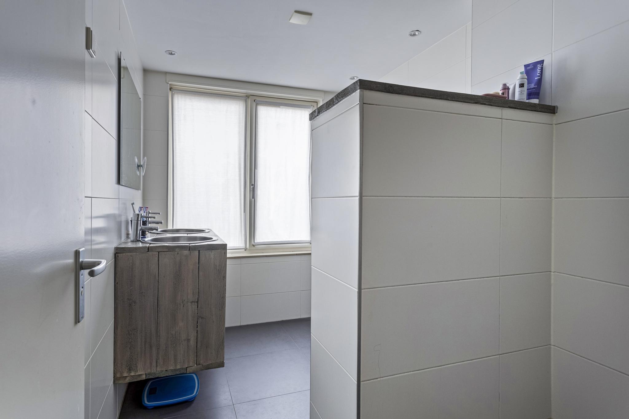 De badkamer is verplaatst naar een voormalige slaapkamer en beschikt over moderne donkergrijze vloertegels met vloerverwarming en witte wandtegels en beschikt over een hangend toilet, dubbele wastafel en inloopdouche. De oude badkamer is in gebruik als waskamer.