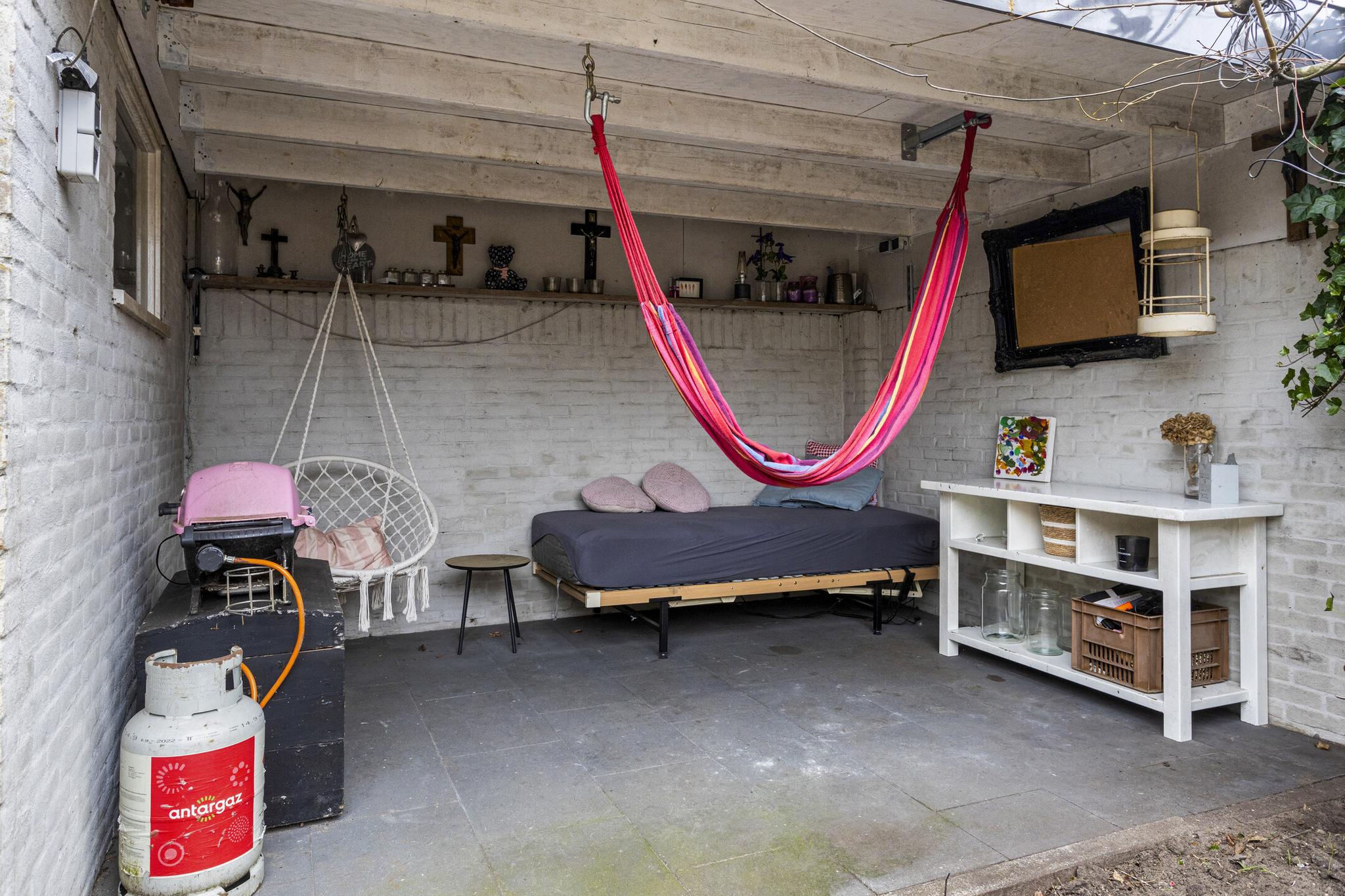 Vanuit zowel de keuken als de eetkamer loop je zo de zonnige tuin in. De tuin is gelegen op het zuiden, waardoor je hier de hele dag kunt genieten van de zon. Daarnaast is er een praktische stenen garage aanwezig, ideaal voor het opbergen van tuingereedschap, fietsen of andere spullen. Achter de garage is een gezellige overkapping gemaakt.