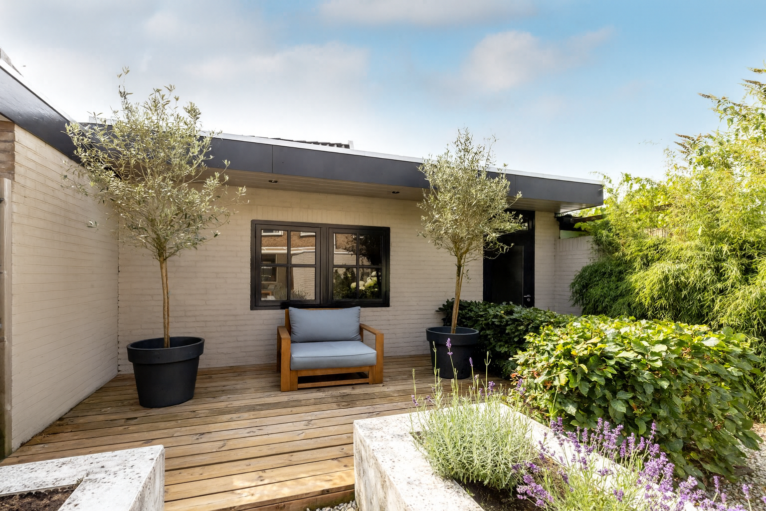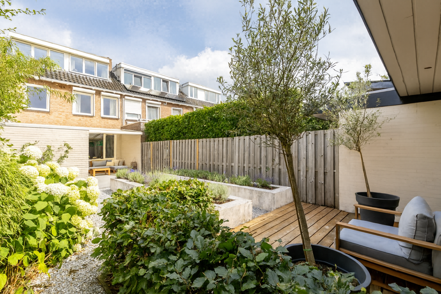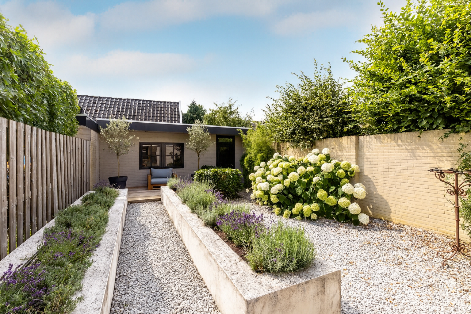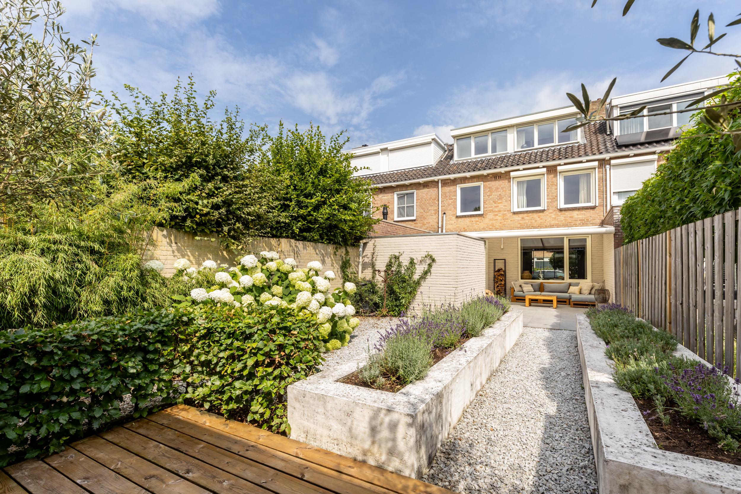 De fraai aangelegde achtertuin is gelegen op het zuidoosten, waardoor je hier het grootste deel van de dag heerlijk van de zon kunt genieten. De tuin is onderhoudsvriendelijk ingericht met strakke, verhoogde plantenbakken, siergrind en een houten vlonderpad dat zorgt voor een warme uitstraling.