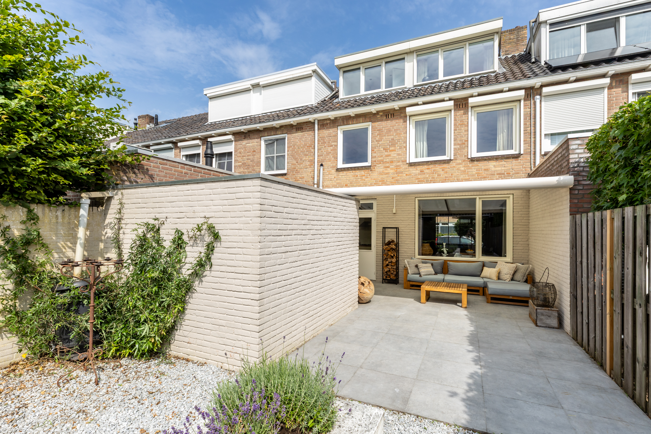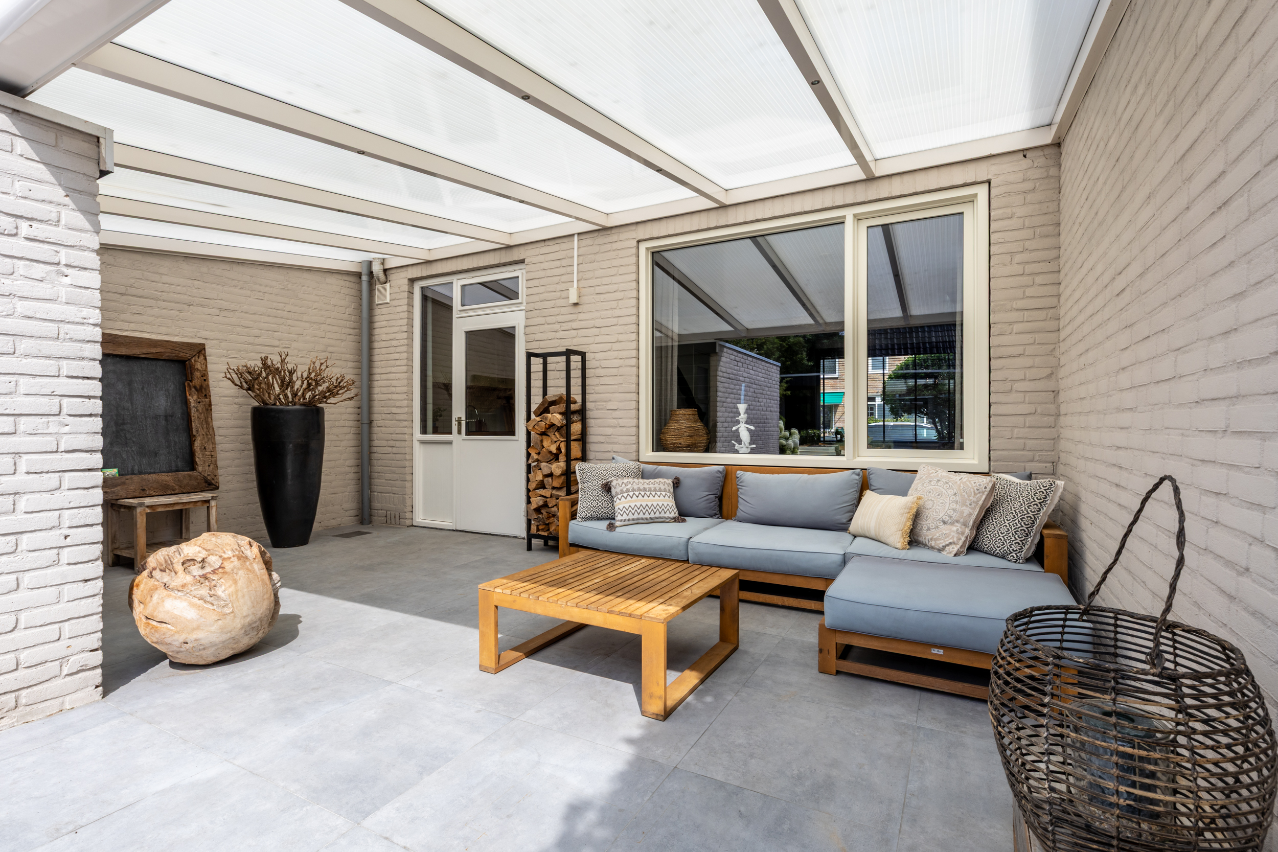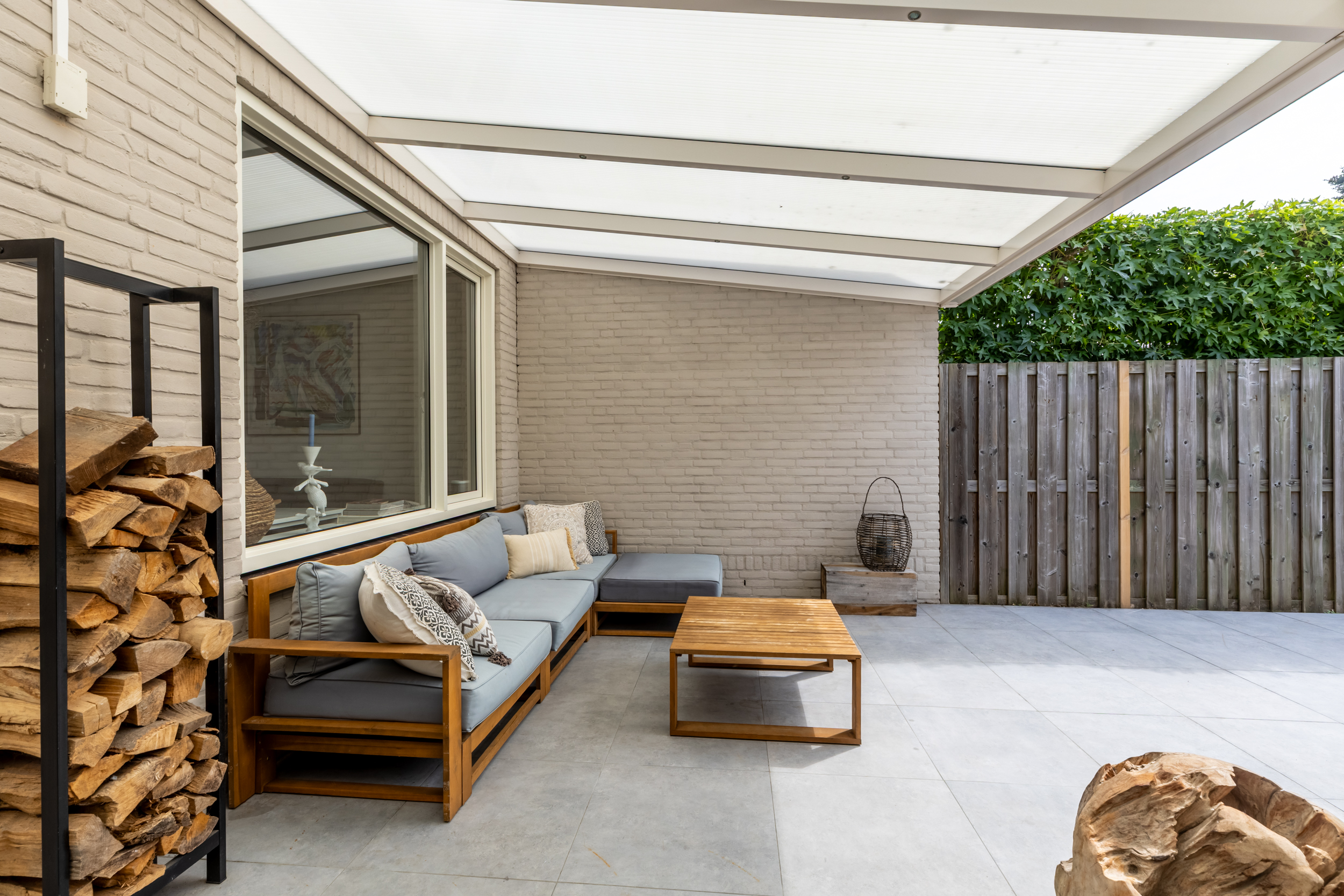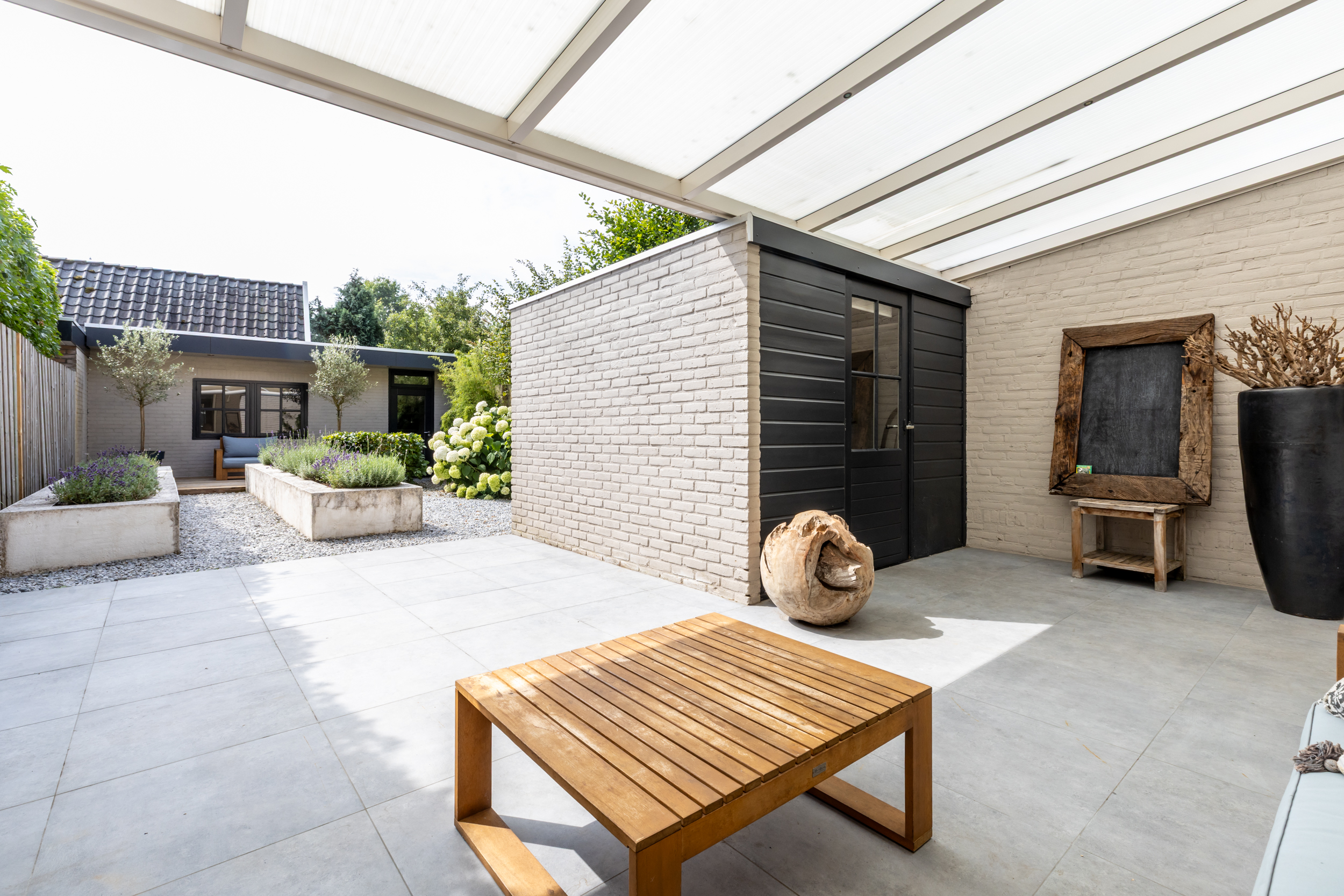 Aangrenzend aan de woning bevindt zich een ruime, overkapping met een kunststof dak. Deze biedt een comfortabele plek om zowel in de zomer als in het voor- en najaar buiten te zitten. Aan de voorzijde van de tuin bevindt zich een aangebouwde berging, ideaal voor het opbergen van tuinspullen. Aan de achterzijde van de tuin is een tweede berging aanwezig, voorzien van elektra, waar je ook uitstekend fietsen kunt stallen. Hier is tevens een extra overkapping/zithoek gecreëerd, wat deze tuin tot een bijzonder complete en veelzijdige buitenruimte maakt. Vanuit de berging is ook de achterom te bereiken