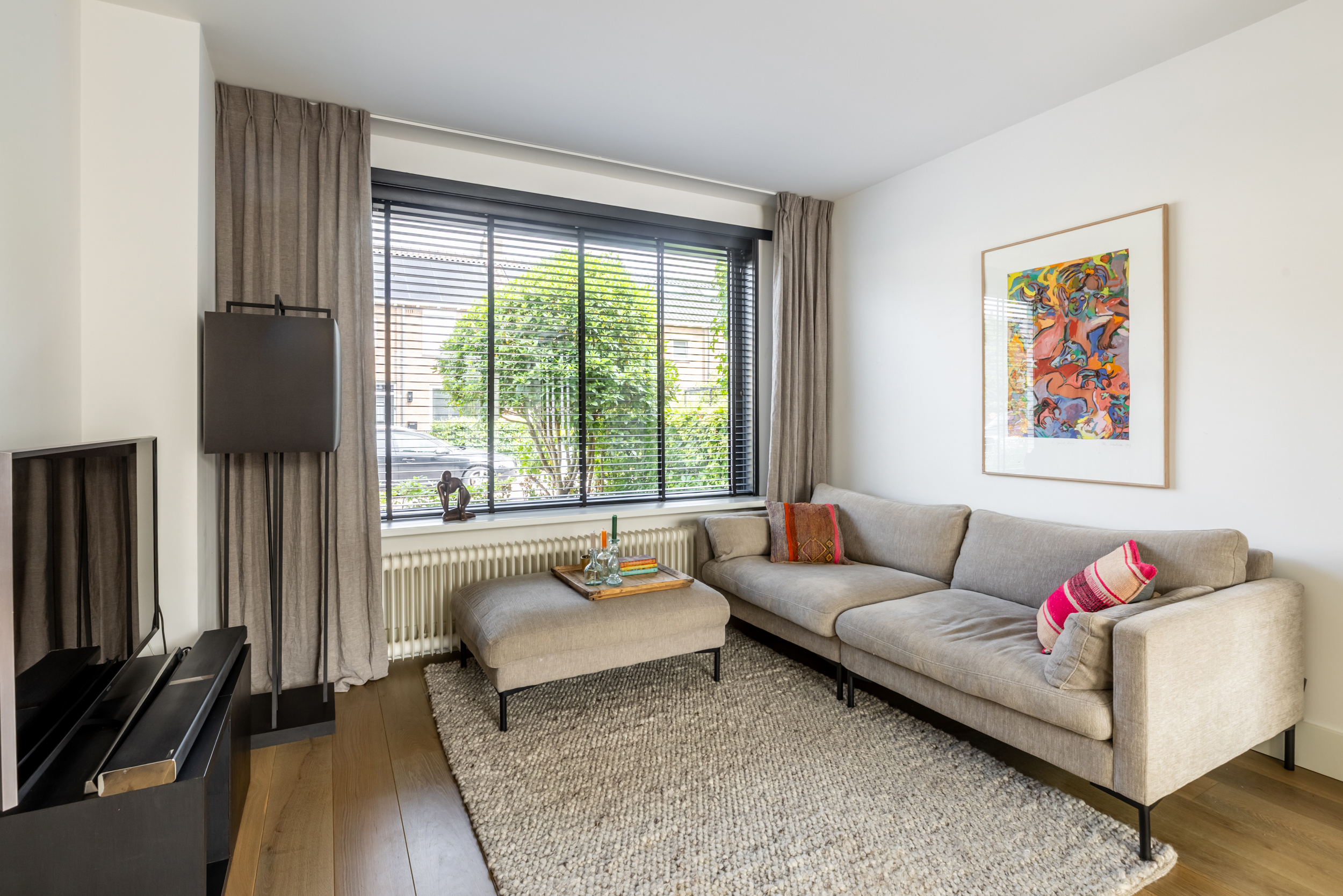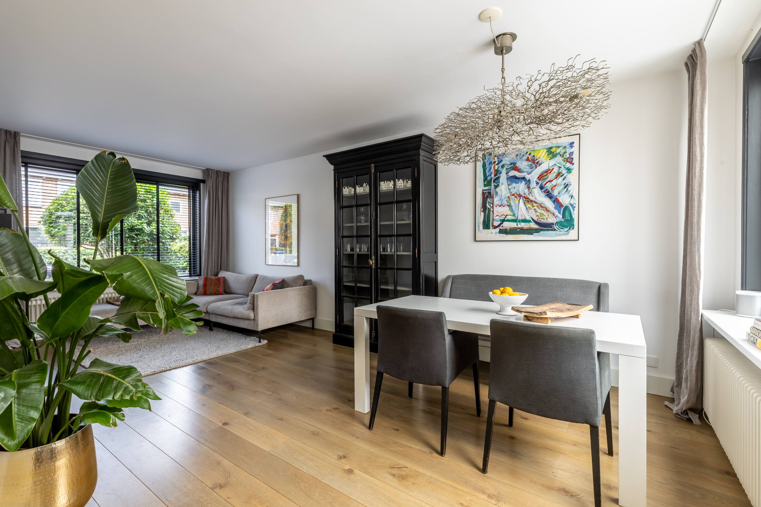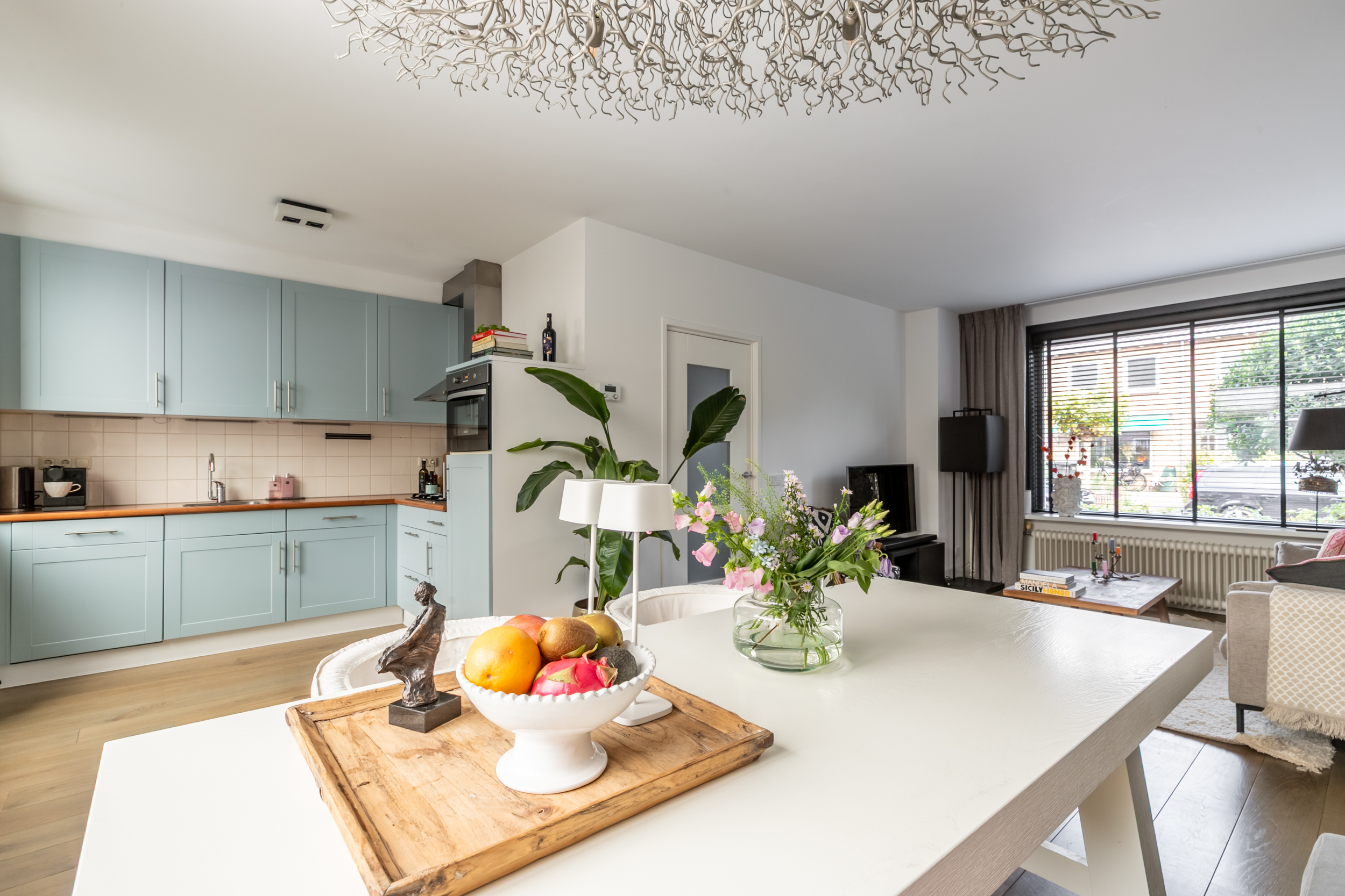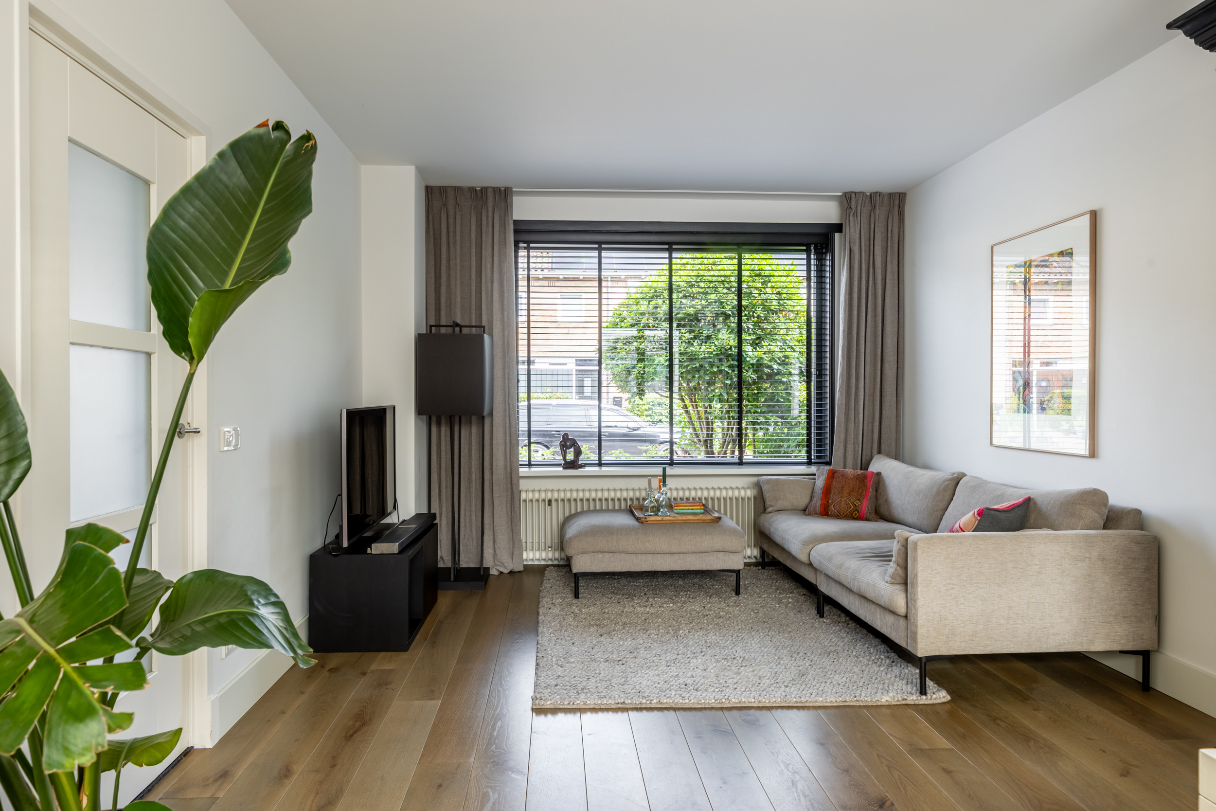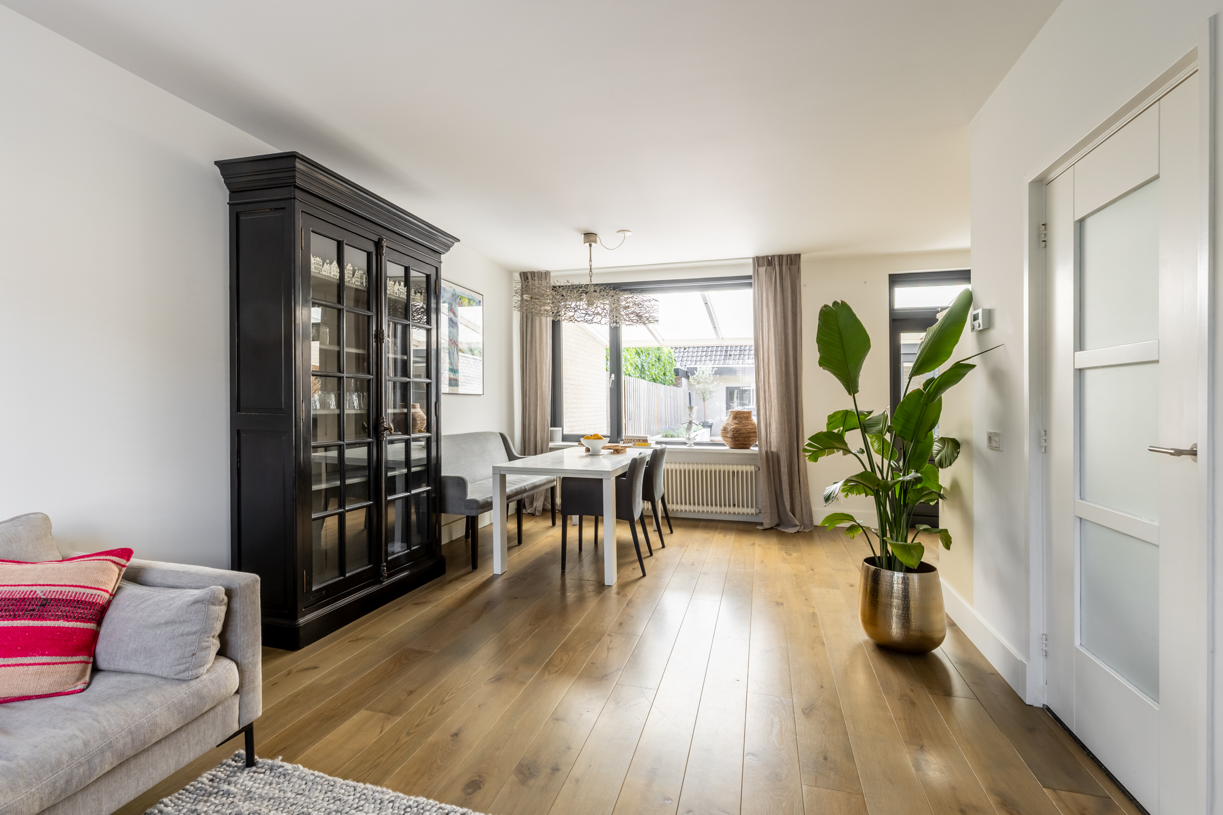 De woonkamer is stijlvol afgewerkt met een eikenhouten vloer die naadloos is doorgetrokken over de gehele begane grond. Aan de achterzijde is een gezellige eethoek gecreëerd, wat zorgt voor een sfeervolle en functionele indeling. Dankzij de grote raampartijen aan zowel de voor- als achterzijde van de woning valt er volop natuurlijk licht naar binnen, wat de ruimte een aangename, open en ruimtelijke uitstraling geeft.