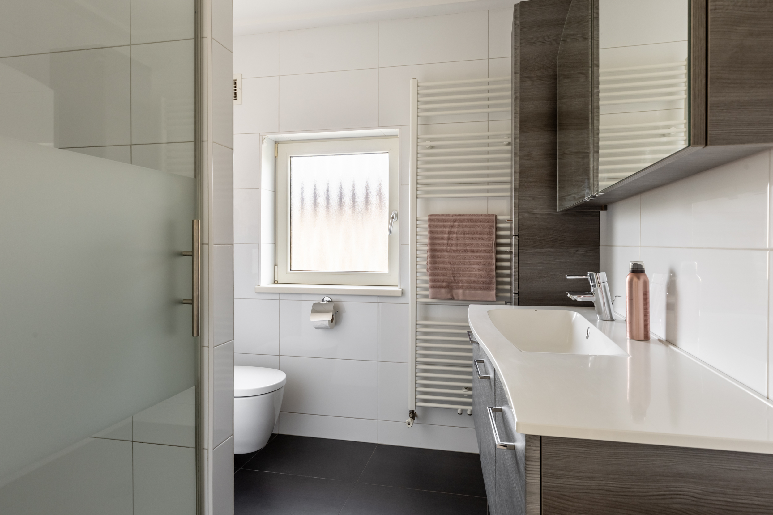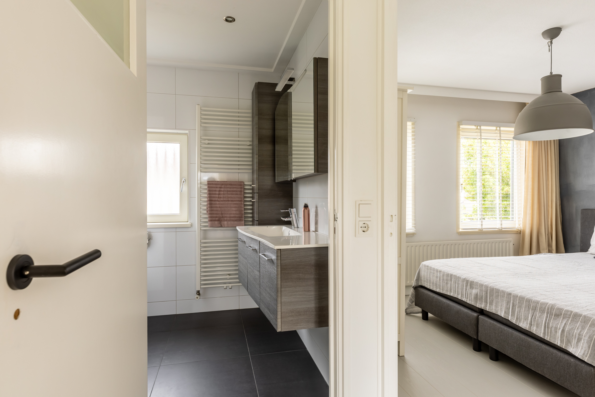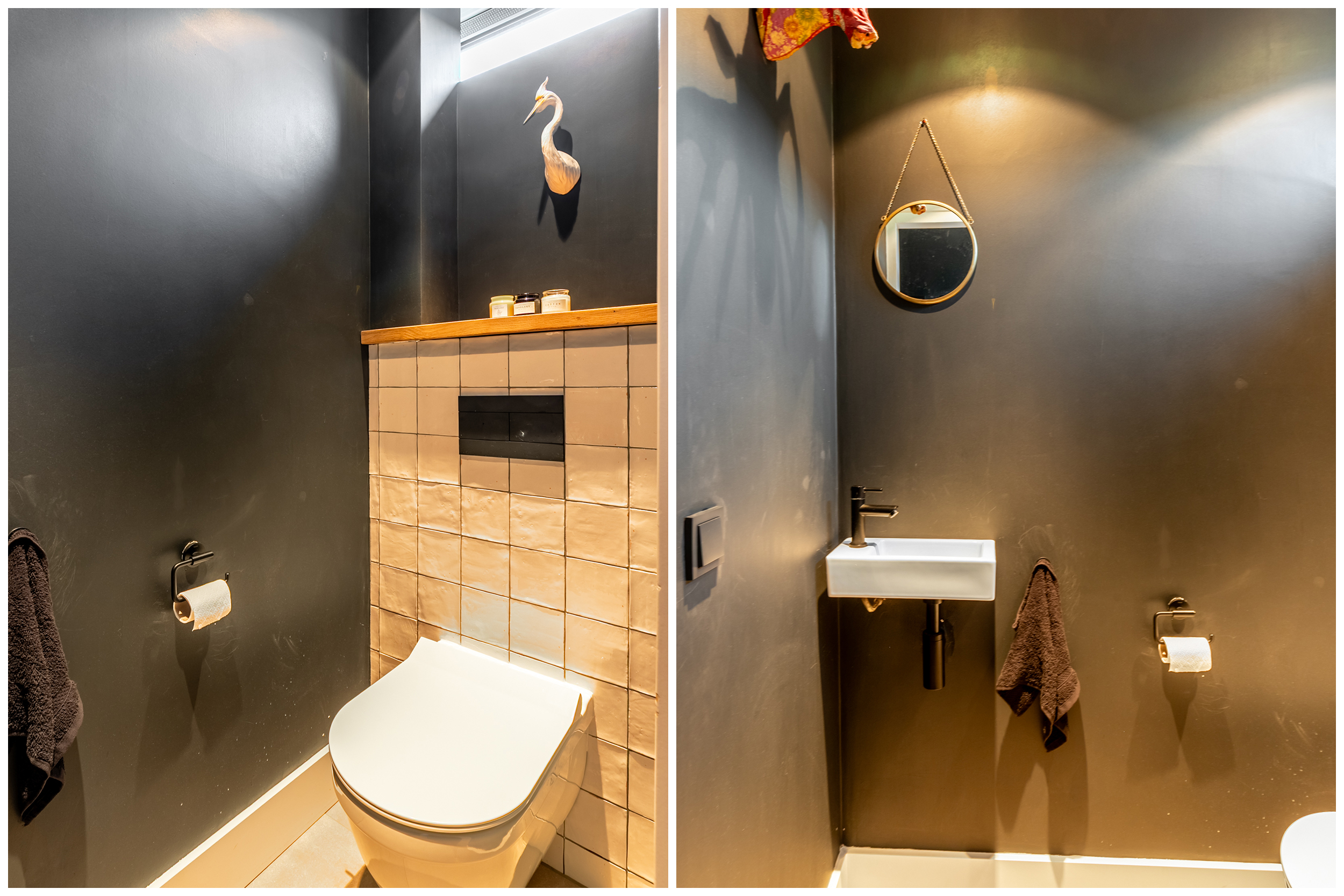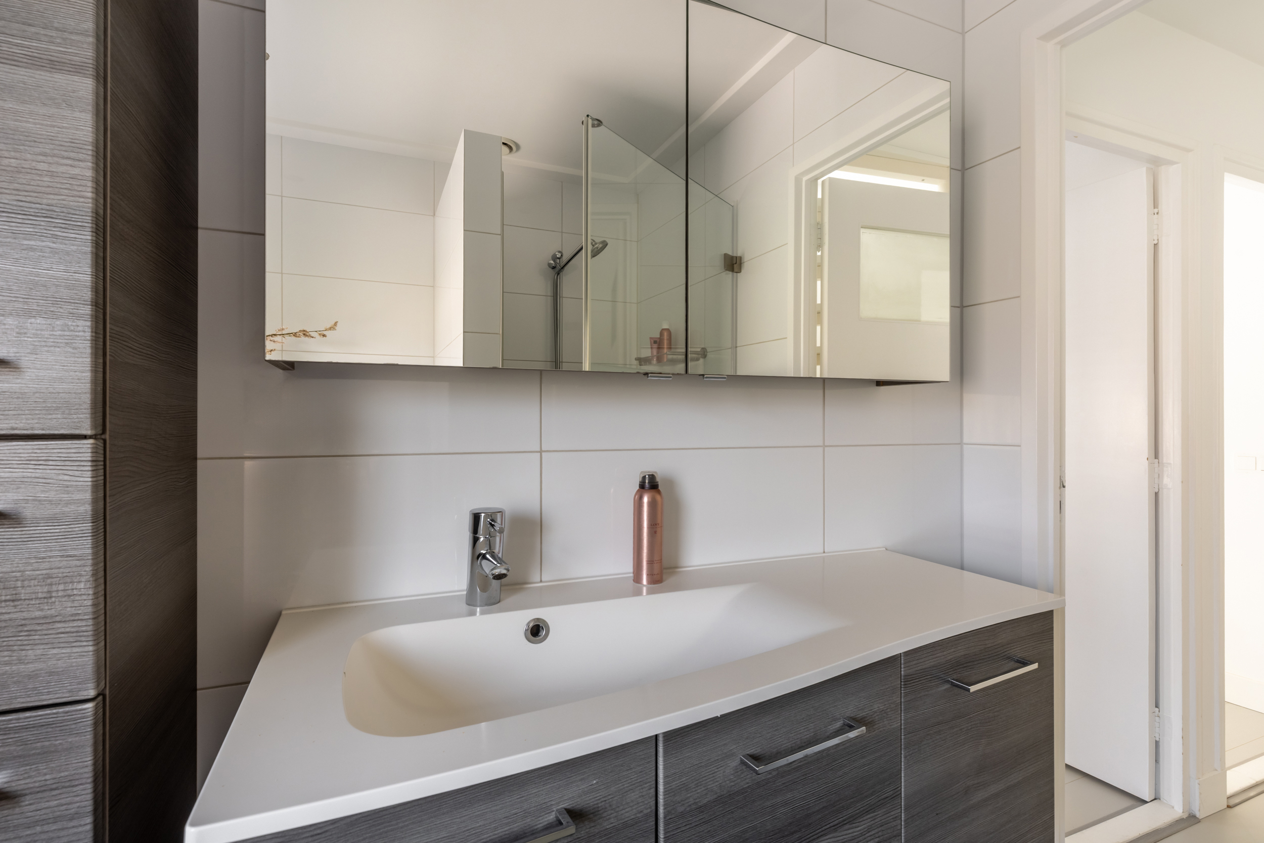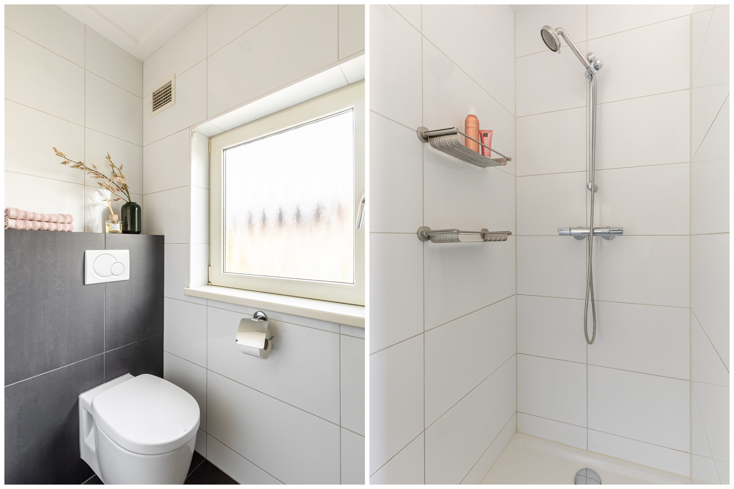 De badkamer is stijlvol ingericht met wand- en vloertegels en beschikt over een modern wastafelmeubel met een bijpassende spiegel met opbergruimte. Daarnaast is de strakke en eigentijdse badkamer uitgerust met een inloopdouche en een vrijhangend toilet.