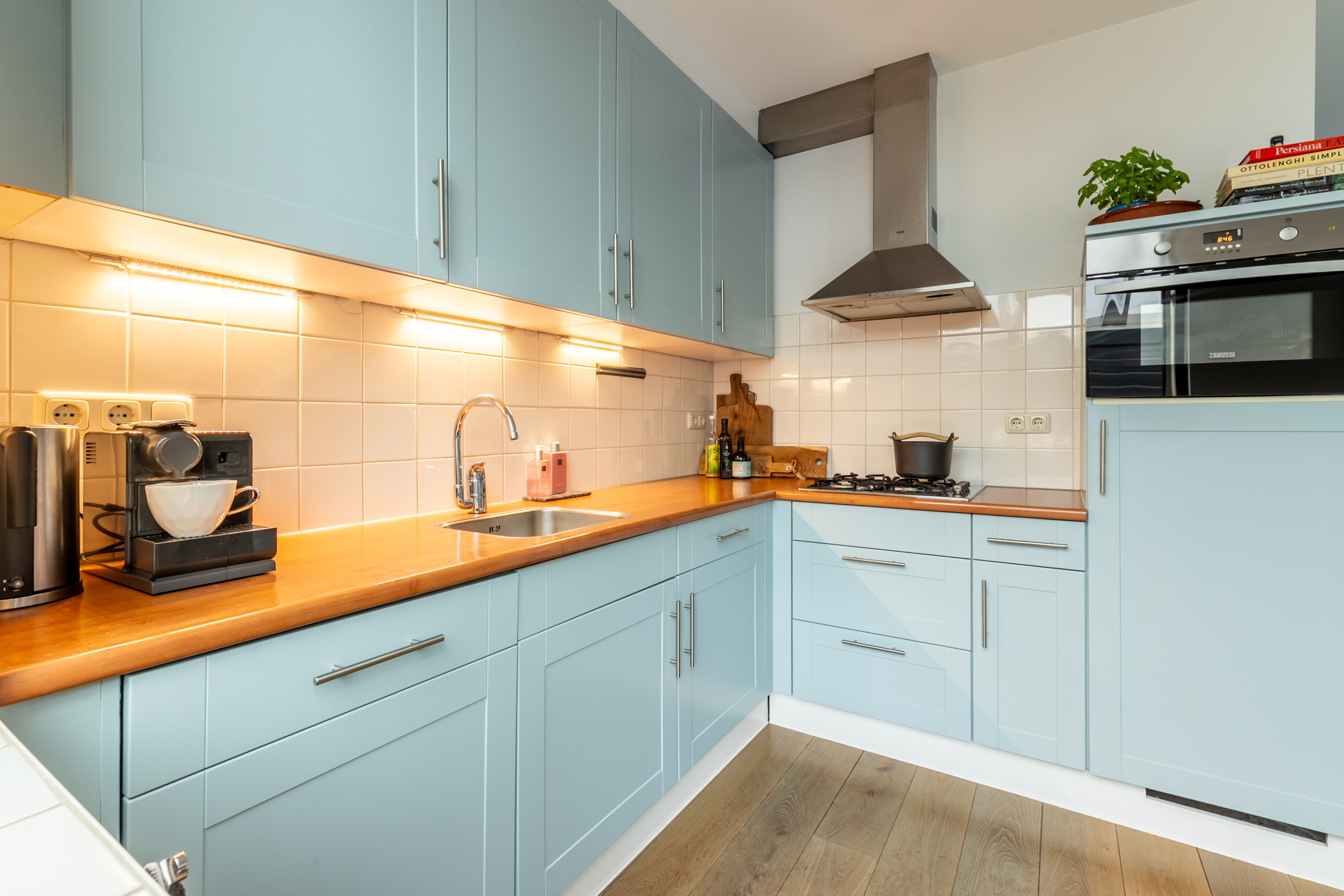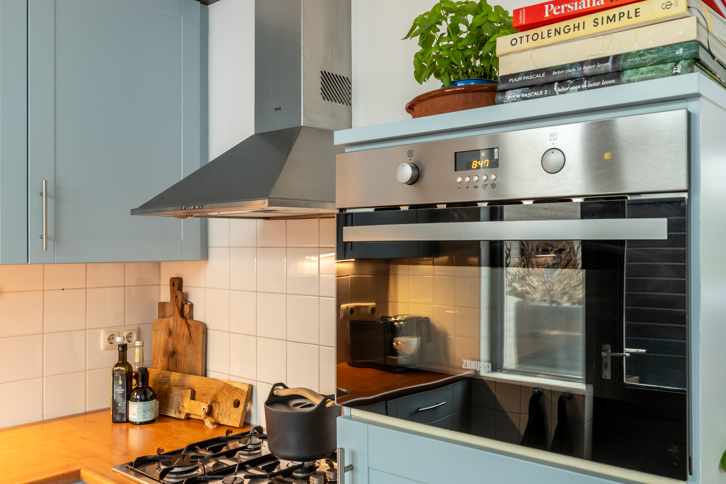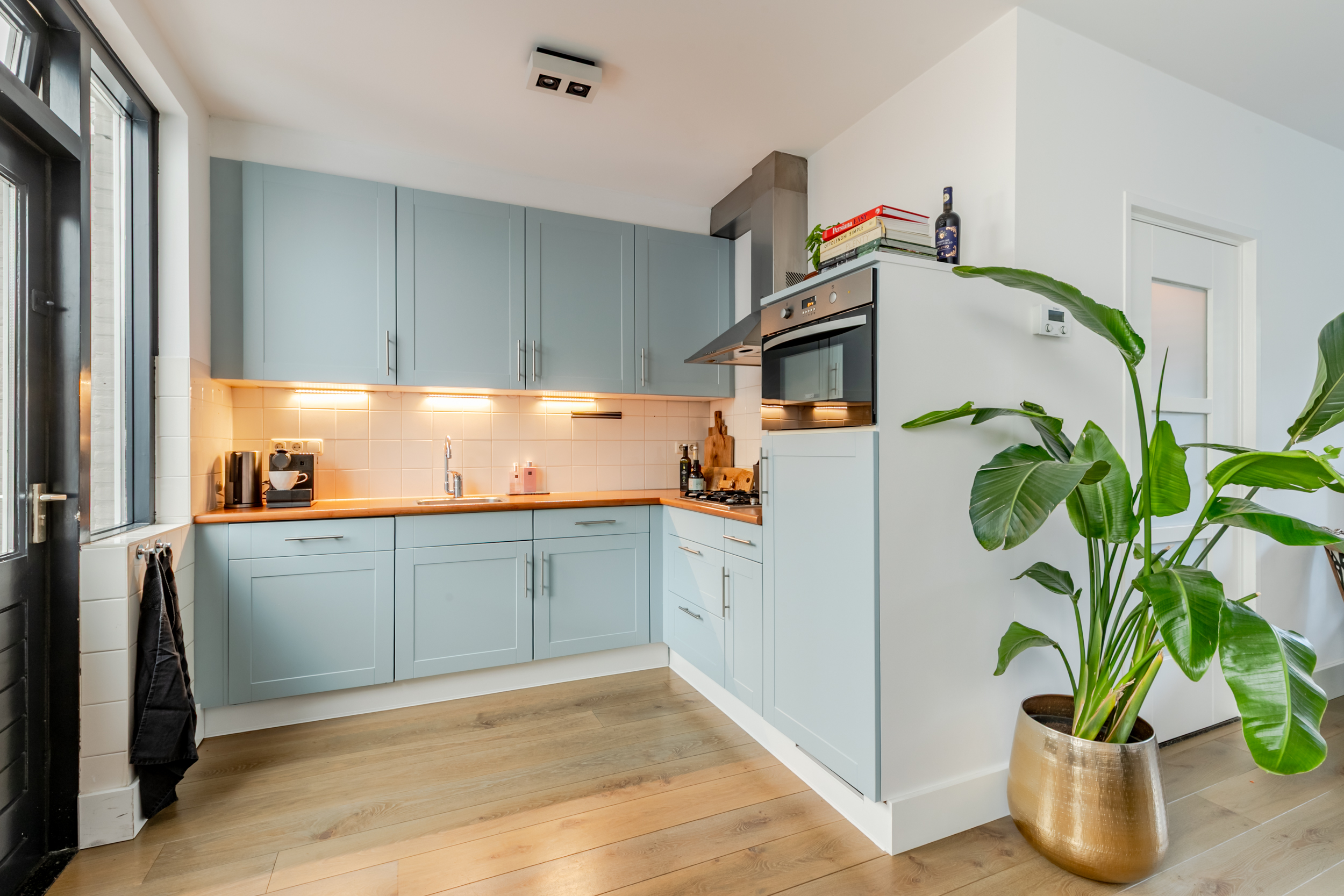 Deze lichte, nette en verzorgde half open keuken is een fijne plek om te koken. De landelijke uitstraling wordt versterkt door de keukenkastjes en het houten werkblad, dat mooi aansluit bij de doorlopende vloer vanuit de woonkamer. De keuken is voorzien van diverse inbouwapparatuur, waaronder een gaskookplaat, afzuigkap, vaatwasser, close-in boiler en een combi-magnetron. Dankzij de grote raampartijen en de deur naar de buitenruimte komt er veel daglicht binnen.