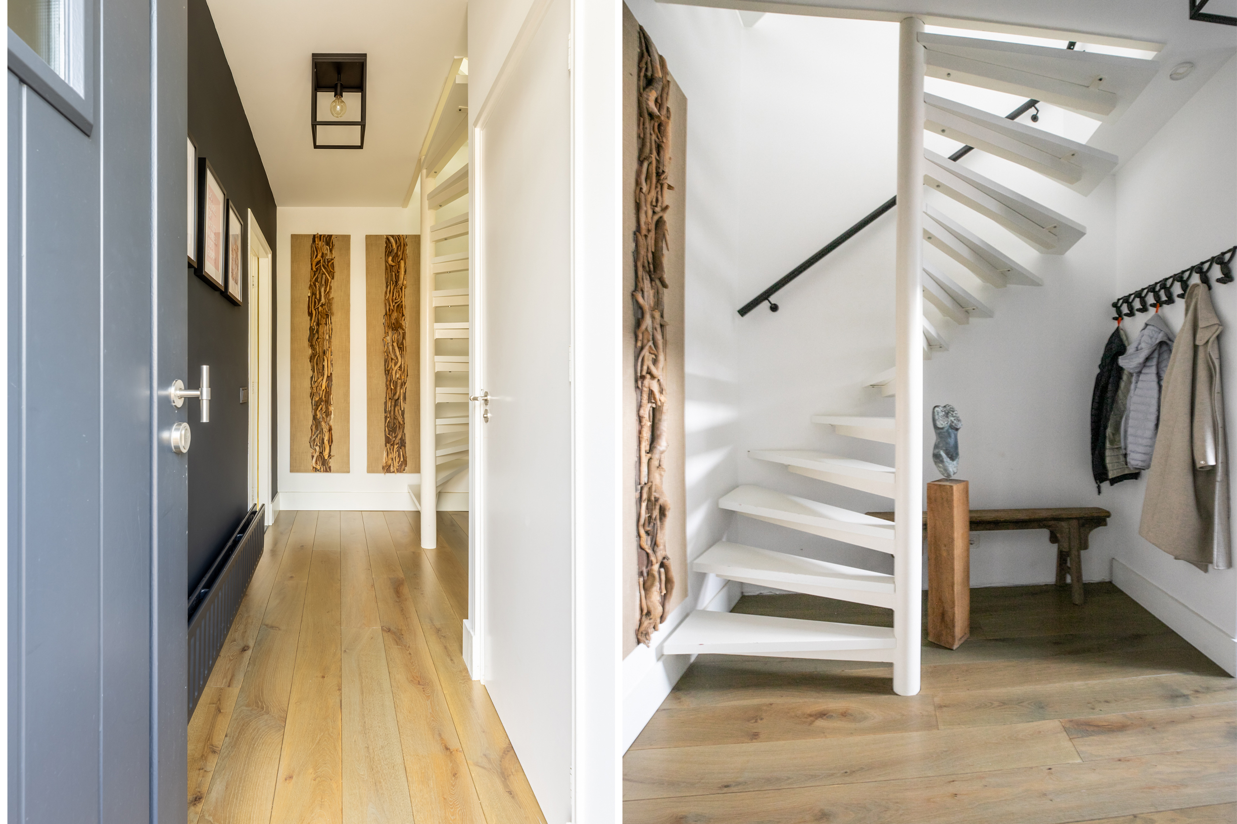 Een ruime hal met eikenhouten vloer geeft toegang tot de toiletruimte met wandcloset en fonteintje, meterkast, trapopgang en de leefruimte.