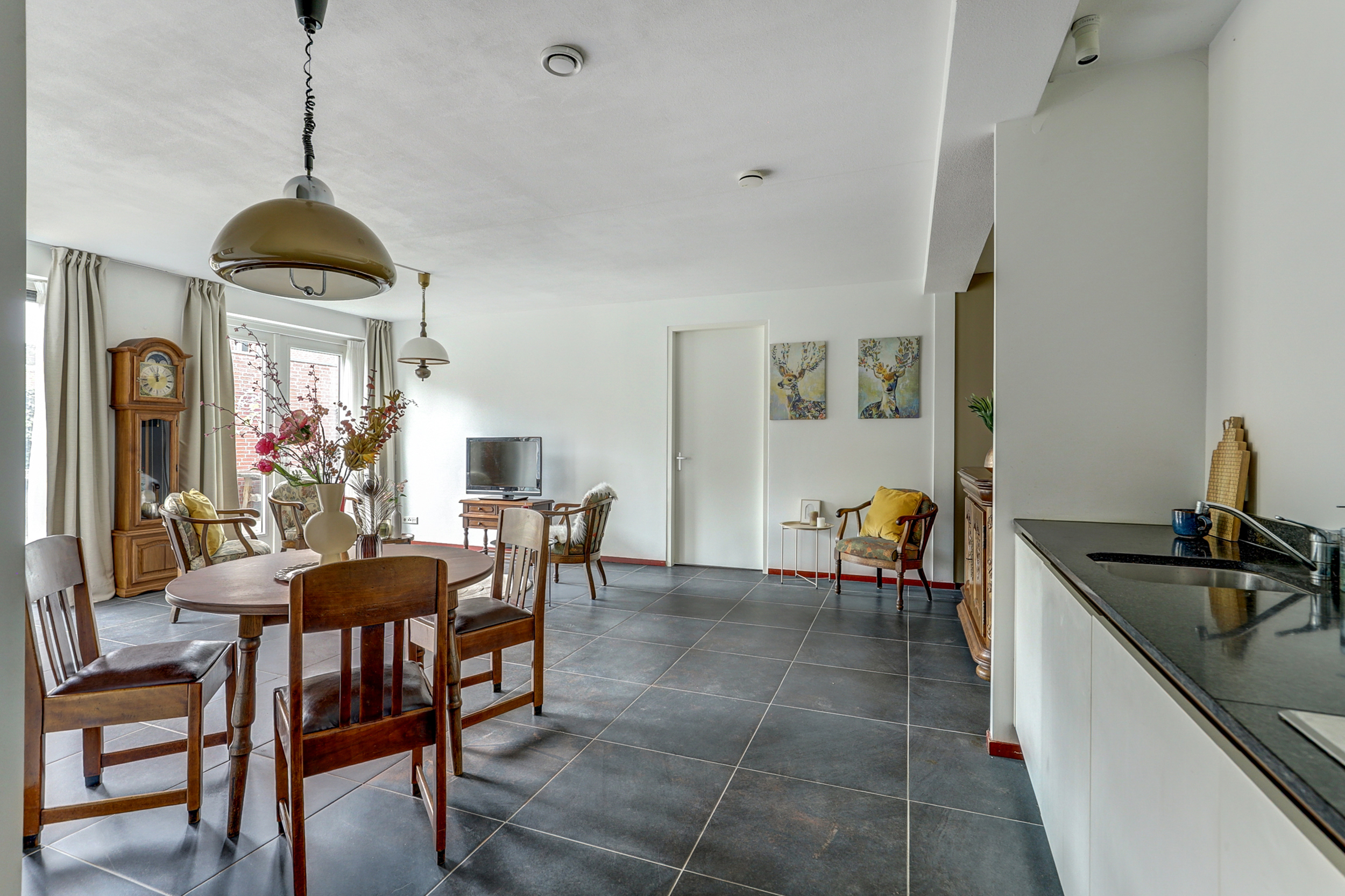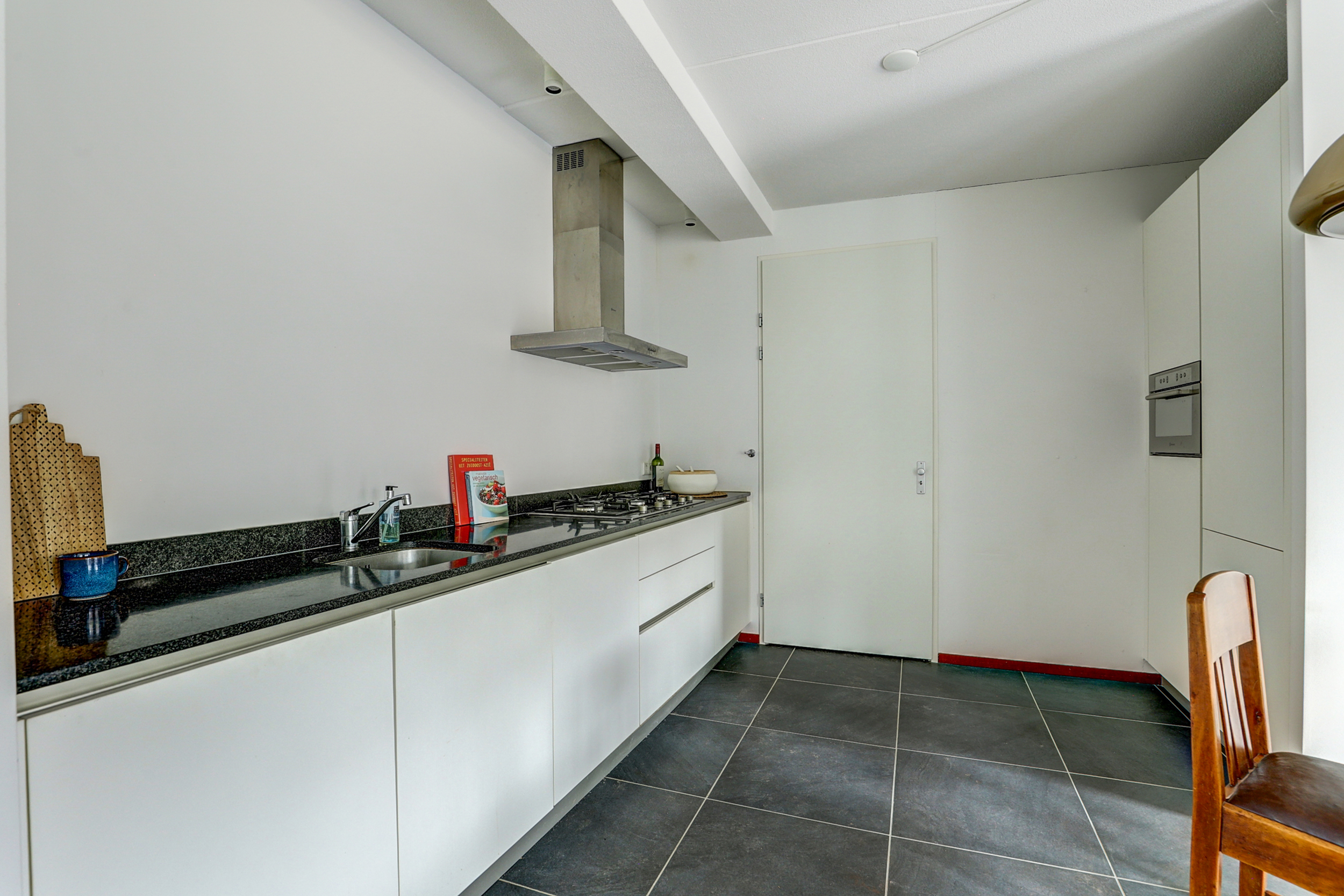 De woonkamer is royaal van opzet, met grote raampartijen en dubbele tuindeuren die zorgen voor veel natuurlijk licht en een directe verbinding met de zonnige tuin. Er is volop ruimte voor een comfortabele zithoek, een gezellige eethoek en bijvoorbeeld een grote kastwand. De gehele begane grond is afgewerkt met een nette, neutrale tegelvloer met vloerverwarming. De open keuken sluit naadloos aan op de woonkamer en is voorzien van diverse inbouwapparatuur, waaronder een vaatwasser, gasfornuis met afzuigkap, koelkast en een oven. Er is volop kastruimte, waardoor alles netjes opgeborgen kan worden. Achter de keuken bevindt zich een praktische bergruimte met wasmachineaansluiting en diepe voorraadkast wat zorgt voor extra gemak en ruimte.