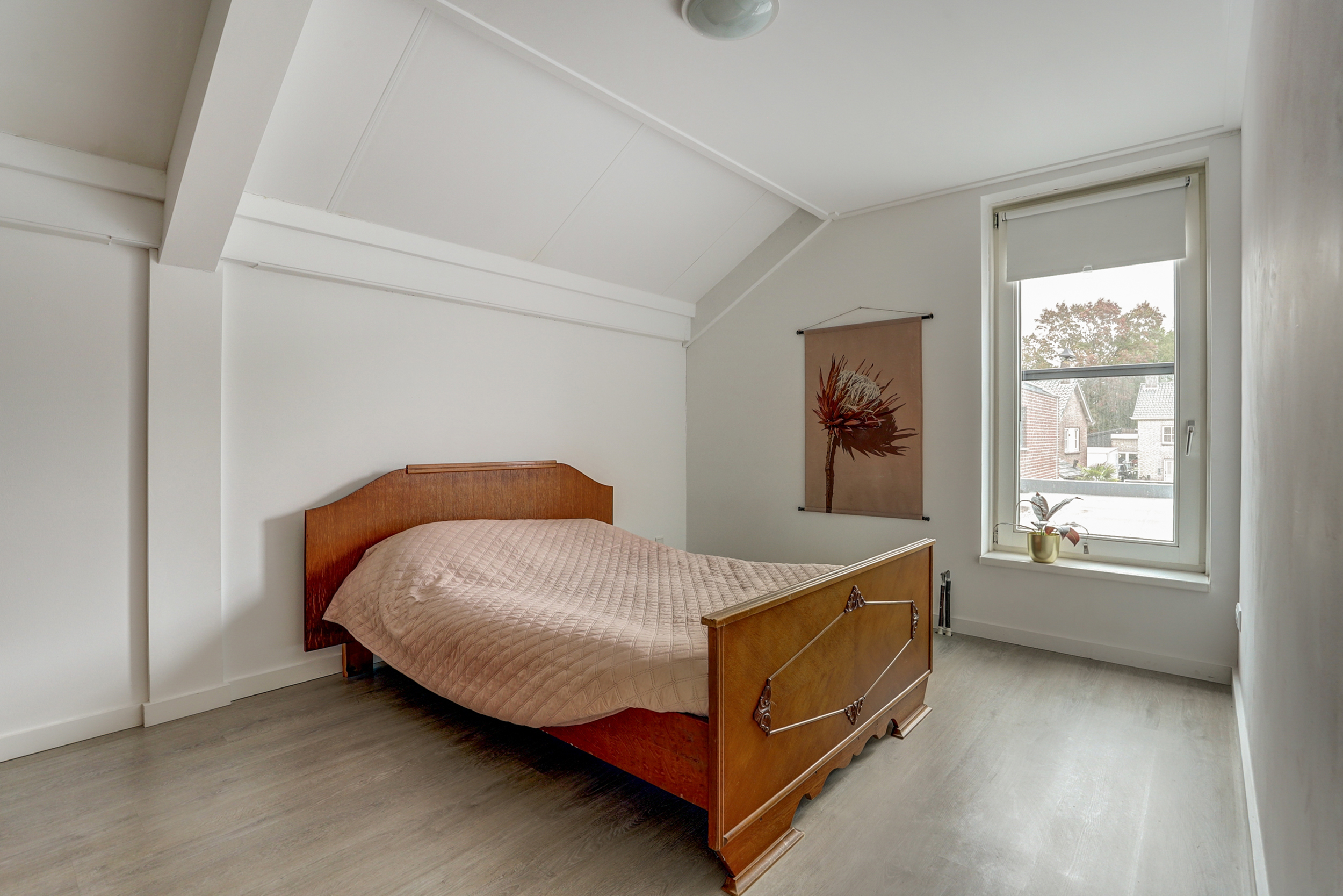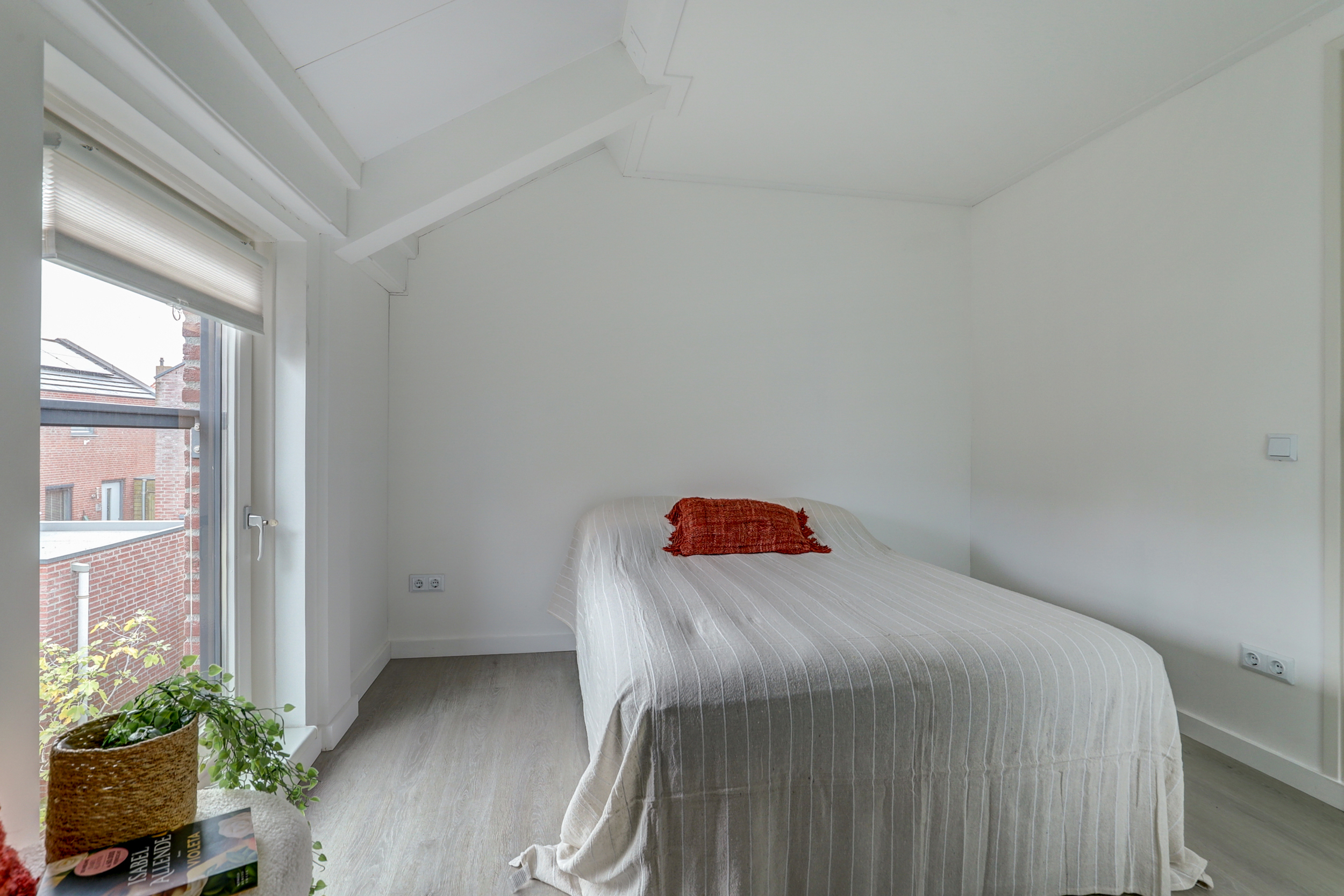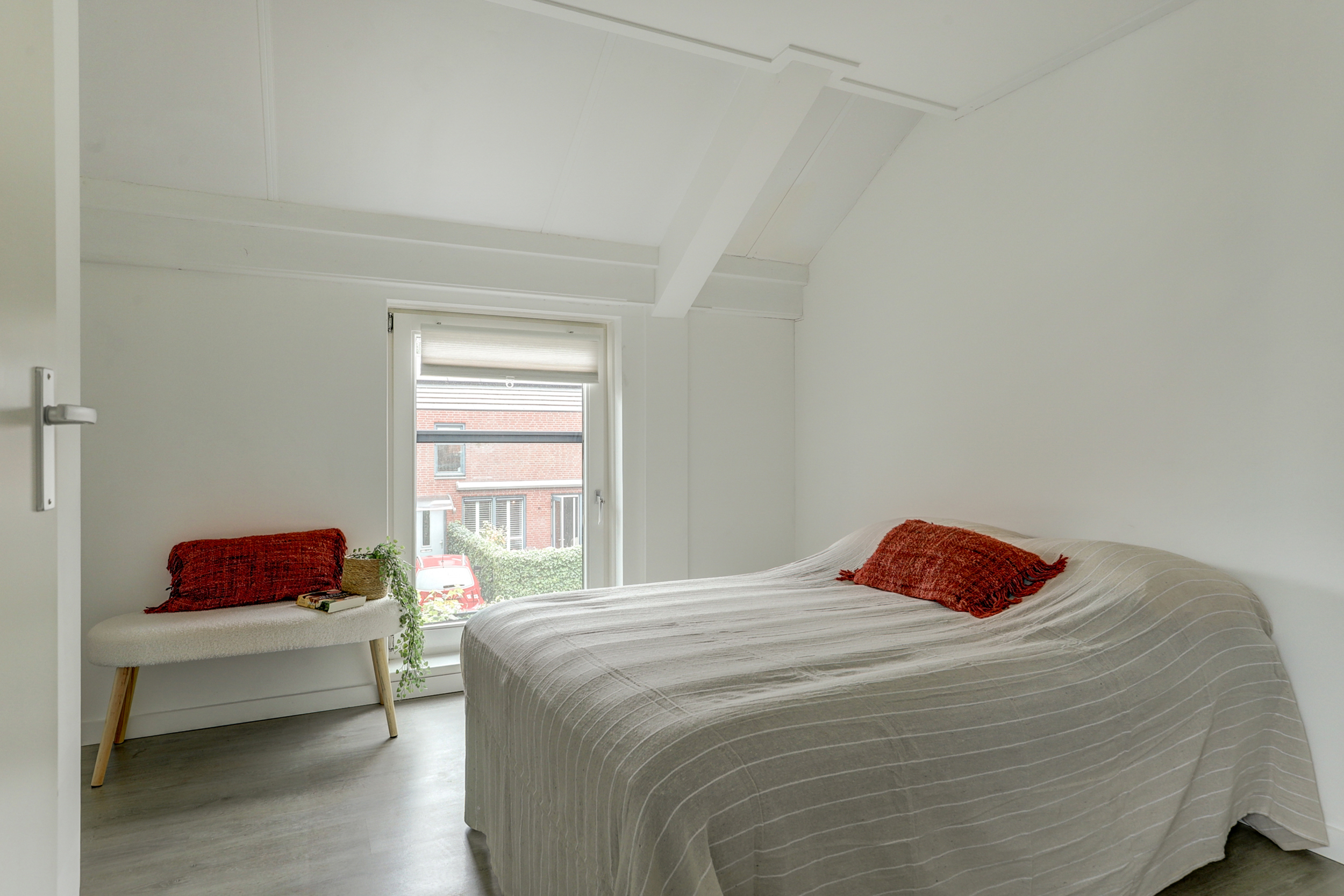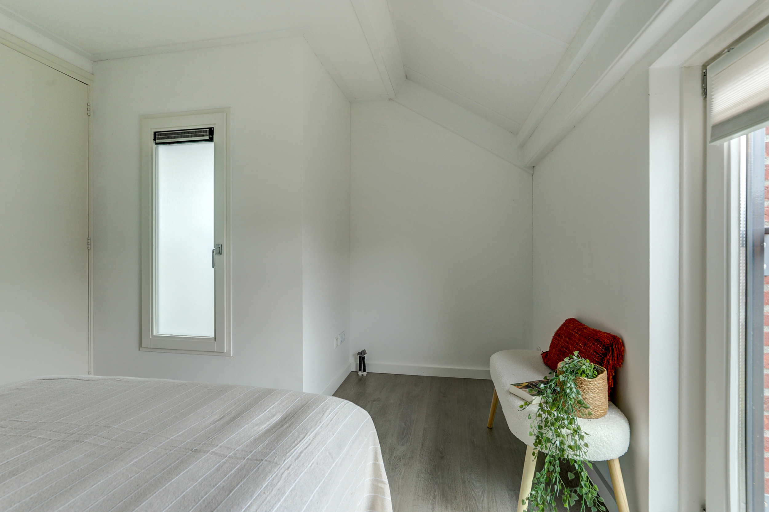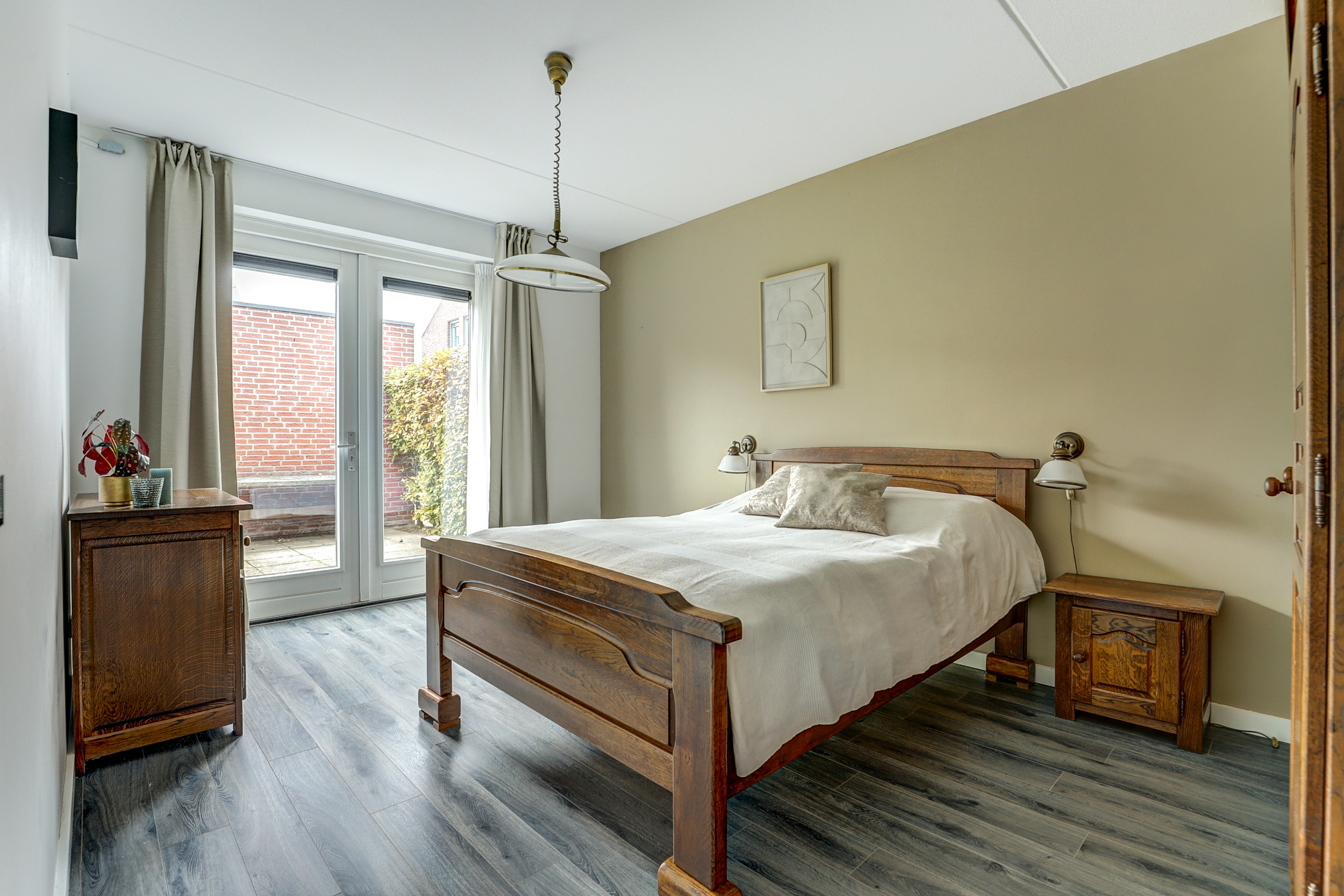 De slaapkamer op de begane grond biedt veel comfort en privacy. De ruimte is royaal en praktisch in te richten met een tweepersoonsbed en een kastenwand. Dankzij de dubbele tuindeuren geniet je van veel daglicht en directe toegang tot de tuin. Vanuit de slaapkamer loop je direct door naar de aangrenzende badkamer, die is voorzien van een dubbele wastafel, toilet, ligbad en een douchecabine met regendouche. Dit maakt de woning uitermate geschikt voor wie comfortabel en gelijkvloers wil wonen, nu én in de toekomst.