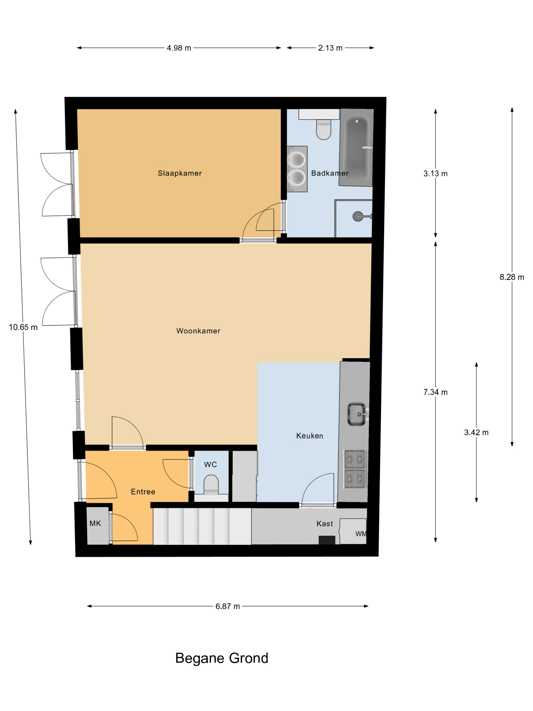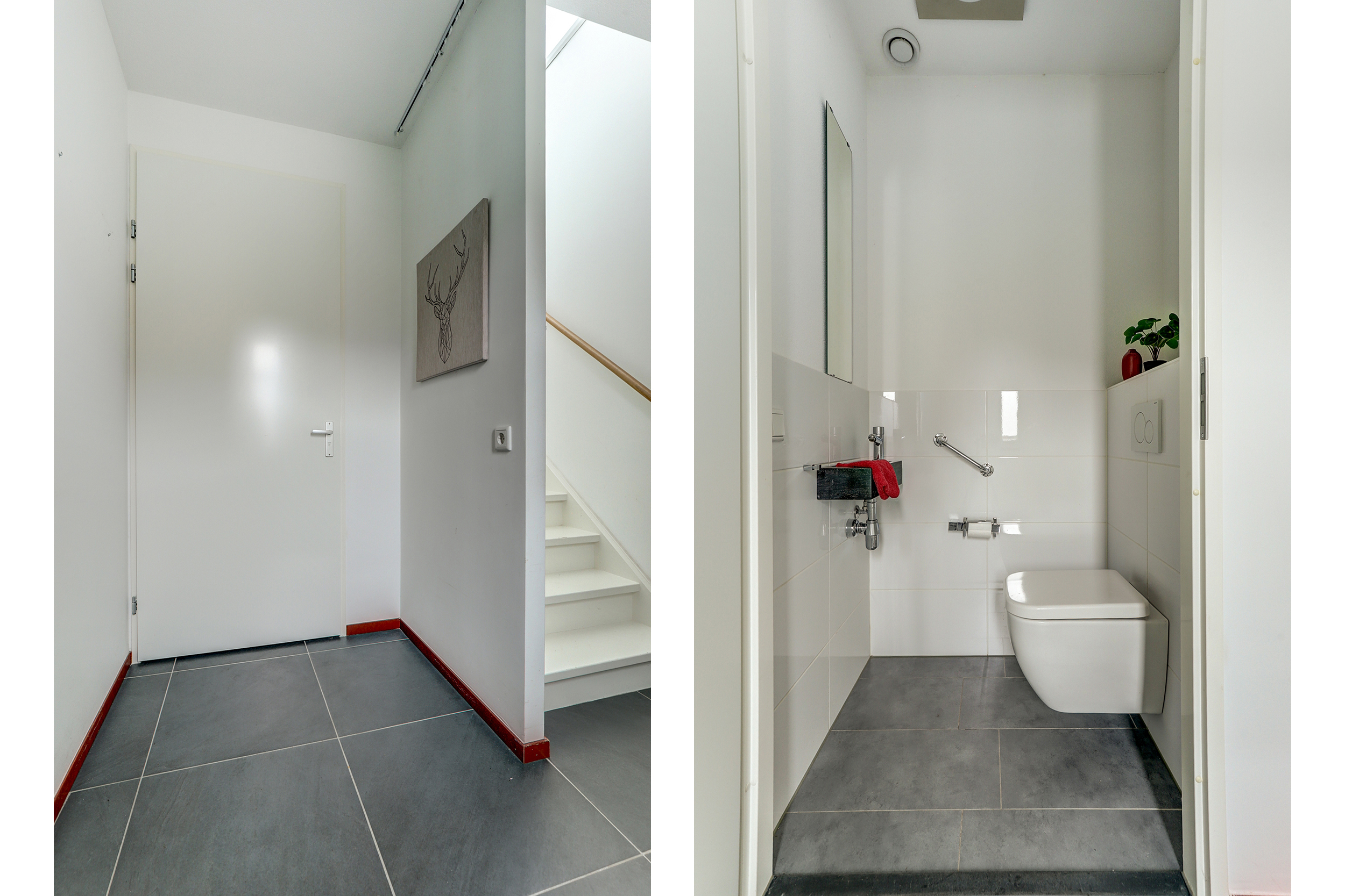 Via de voordeur stap je binnen in de lichte hal. Aan de linkerkant bevindt zich de deur naar de ruime woonkamer. Rechtdoor in de hal tref je het toilet, de meterkast en de trapopgang naar de eerste verdieping.