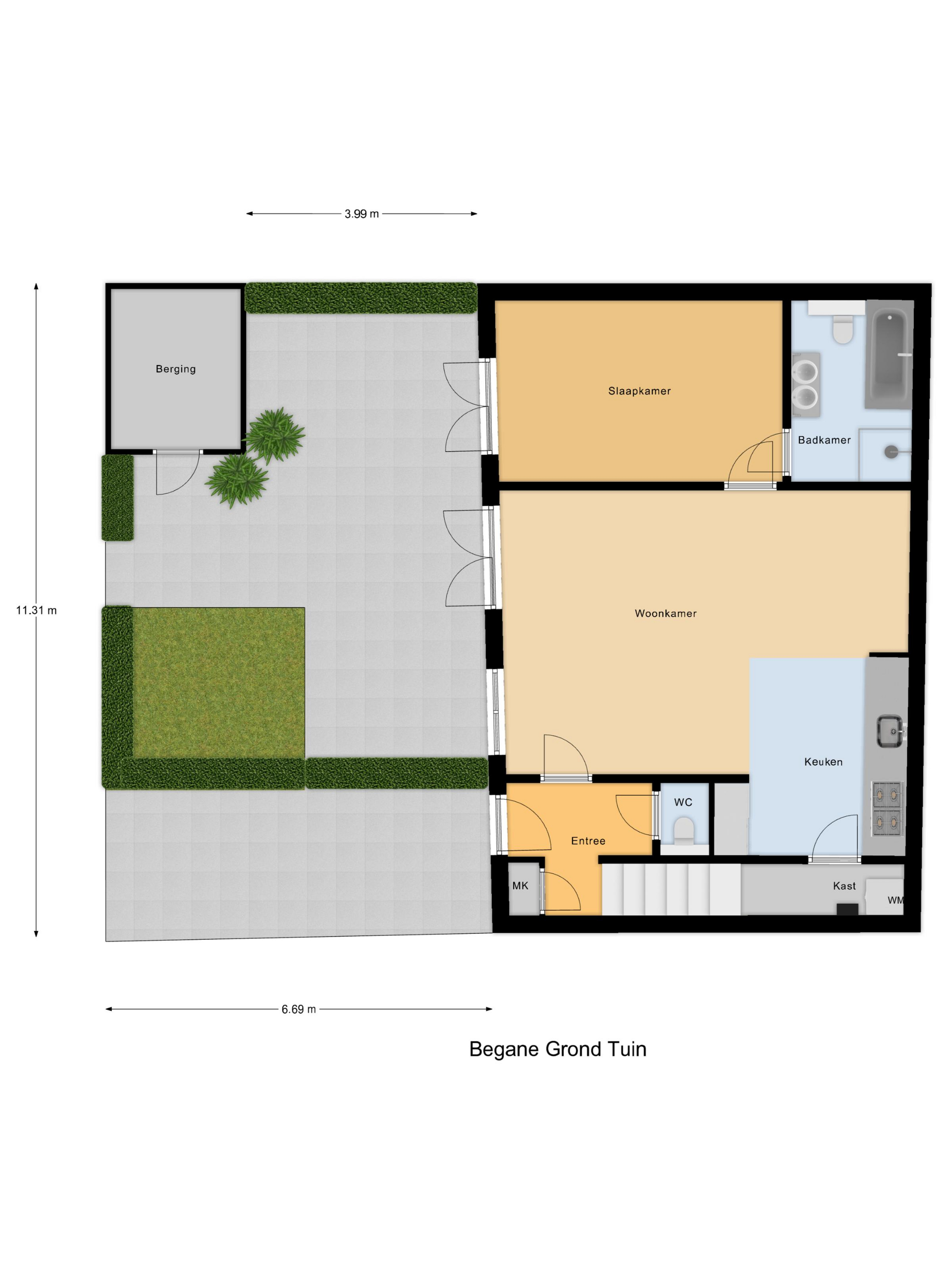 Aan de voorzijde van de woning bevindt zich een oprit met parkeergelegenheid voor één auto en een fijne tuin op het westen, waar je kunt genieten van de middag en avondzon. De tuin is netjes aangelegd met een zithoek, een stuk kunstgras en een berging, ideaal voor het stallen van fietsen en het opbergen van spullen. De tuin biedt volop zon, privacy en ruimte om heerlijk te ontspannen.