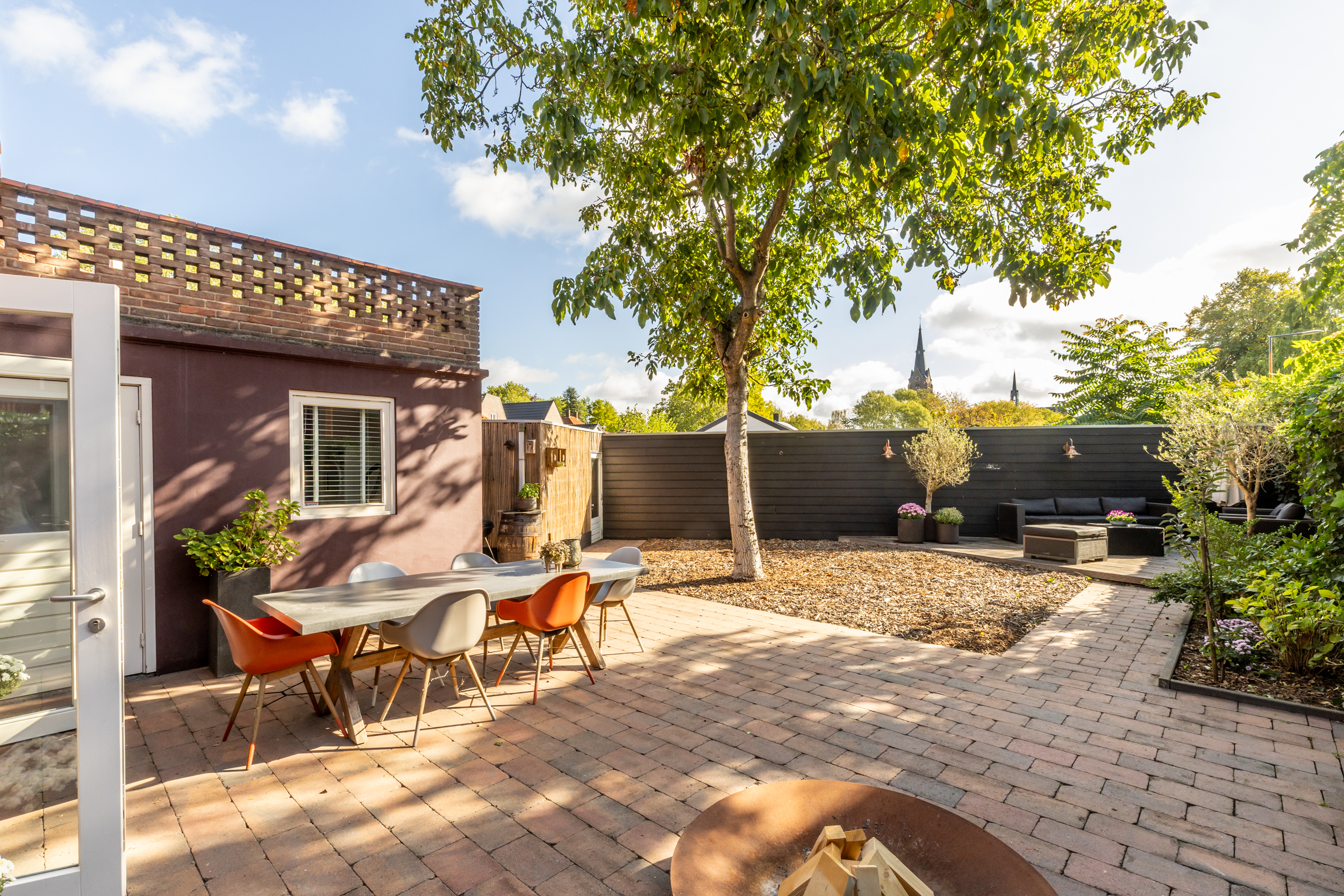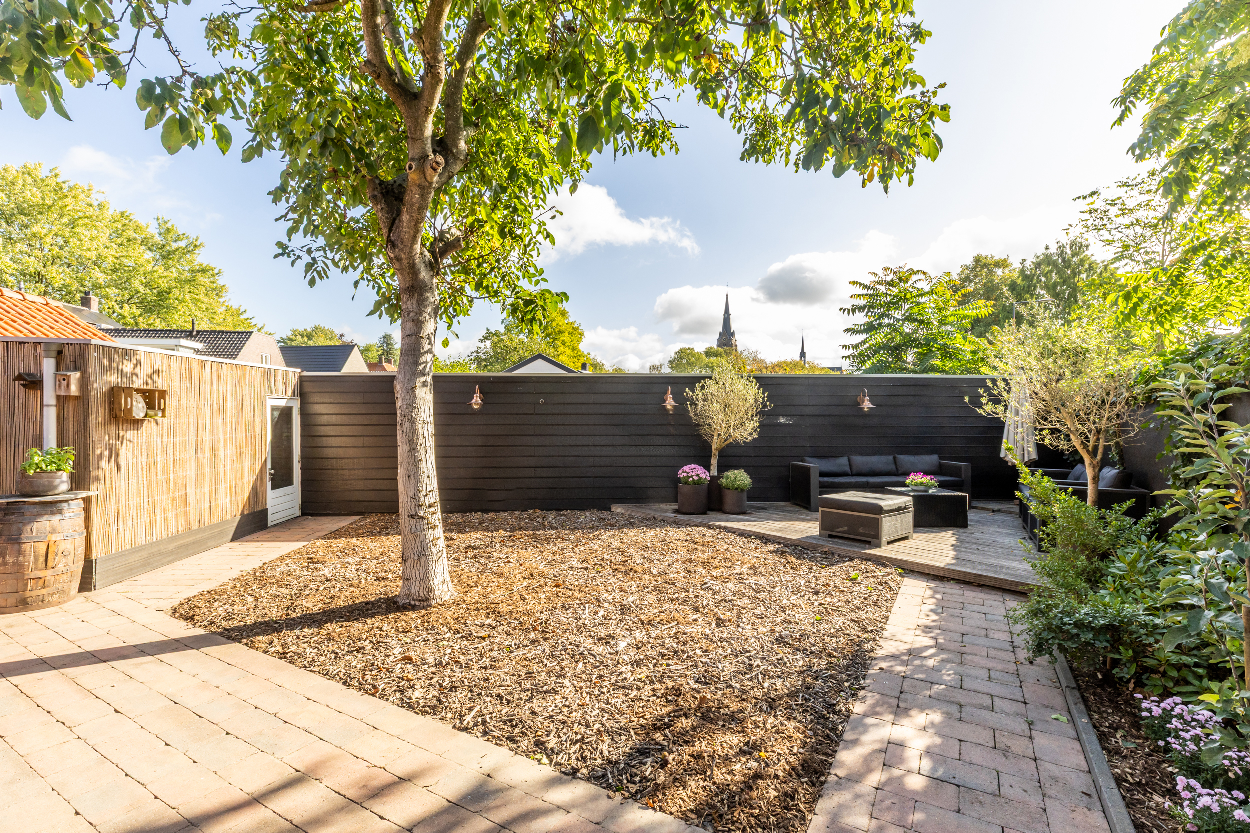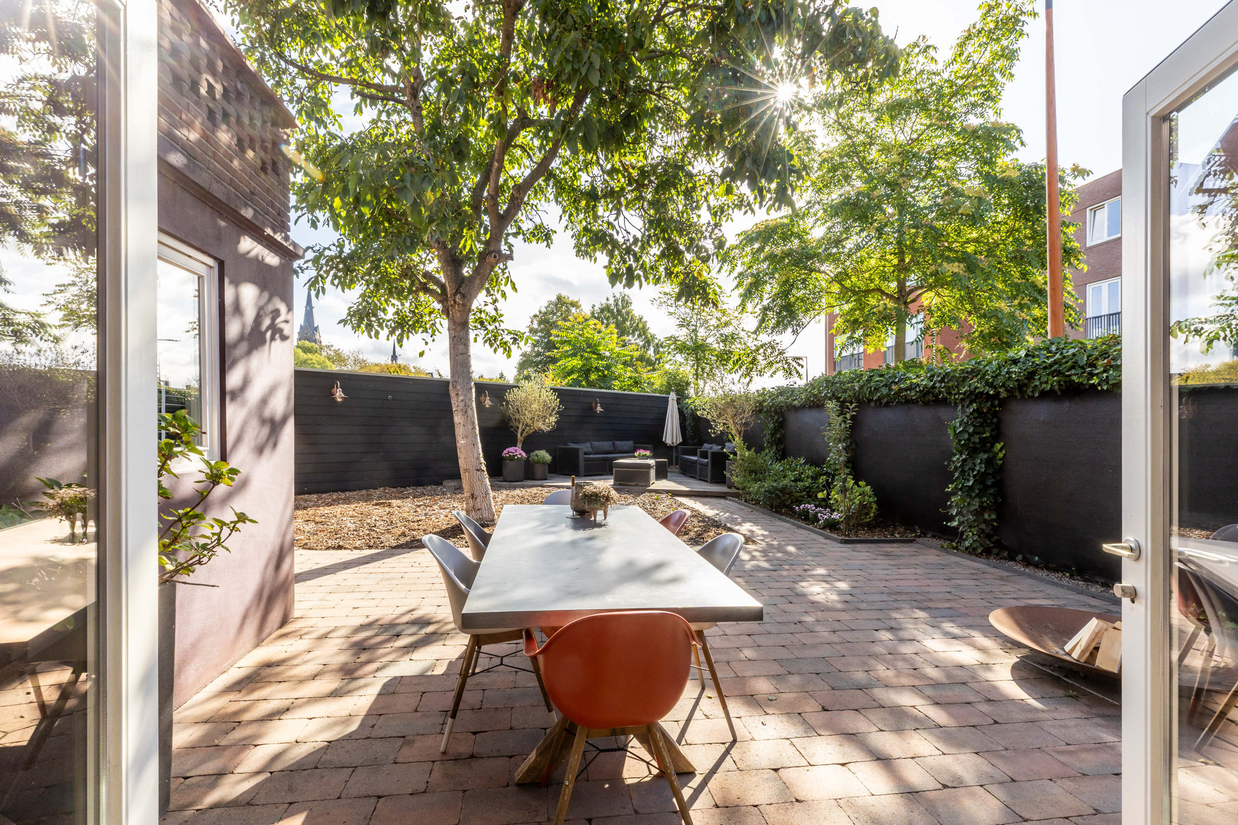 De fraai aangelegde, diepe achtertuin is bijzonder sfeervol en goed verzorgd. Centraal in de tuin staat een mooie boom die fijne schaduwplekken creëert op warme zomerdagen. Via de openslaande deuren kom je direct uit bij de buitentafel en in de hoek van de tuin is een gezellige zithoek gecreëerd. De tuin biedt veel privacy en daarnaast bevindt zich in de hoek een ruime, praktische berging die mooi in de tuin opgaat en harmonieus aansluit bij de rest van de inrichting. De tuin is zorgvuldig aangelegd, biedt volop speelruimte voor kinderen en beschikt over een achterom.