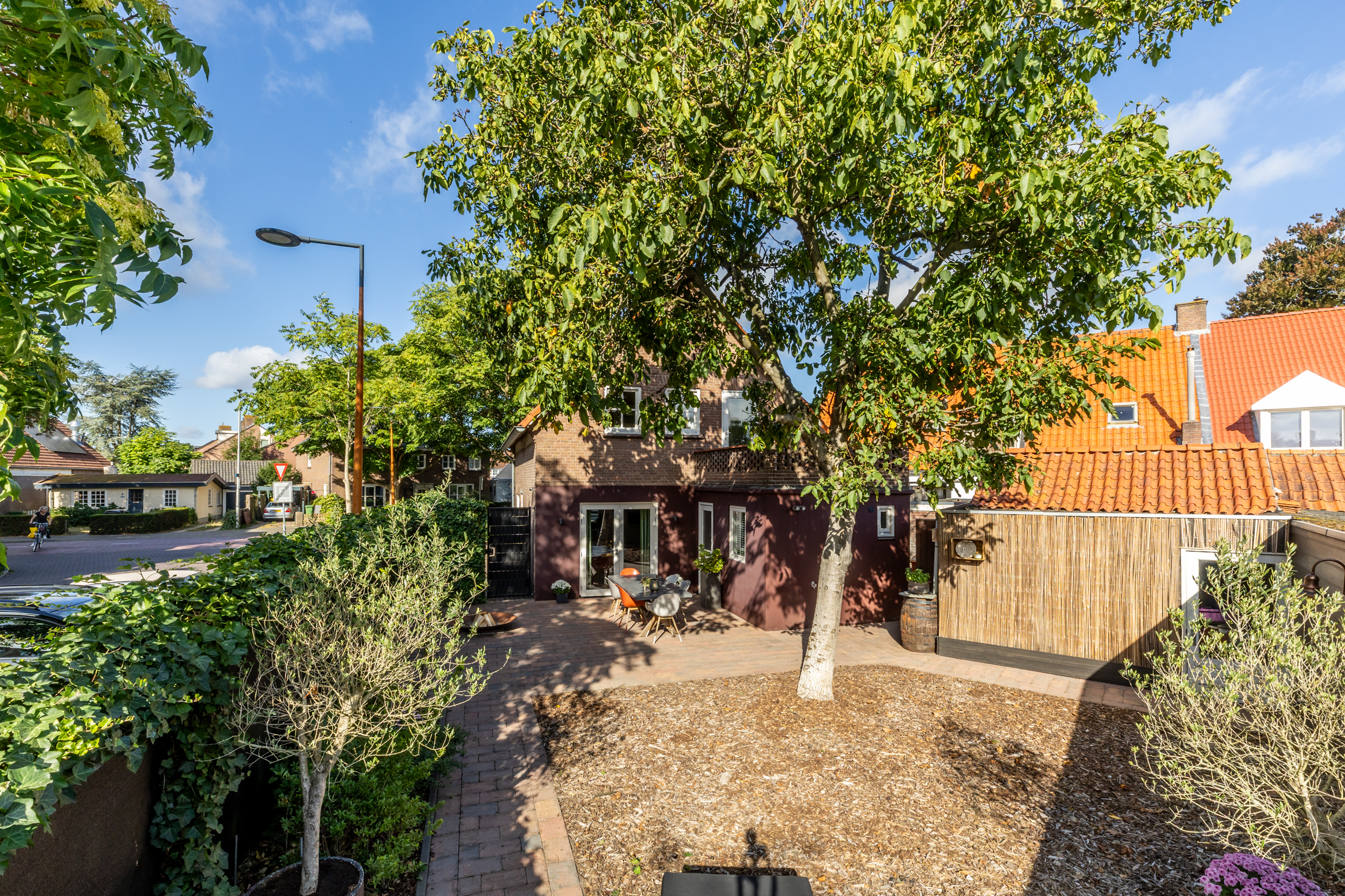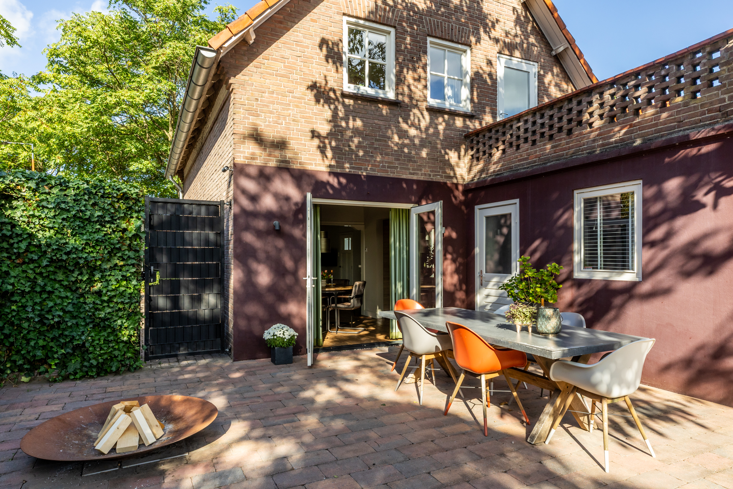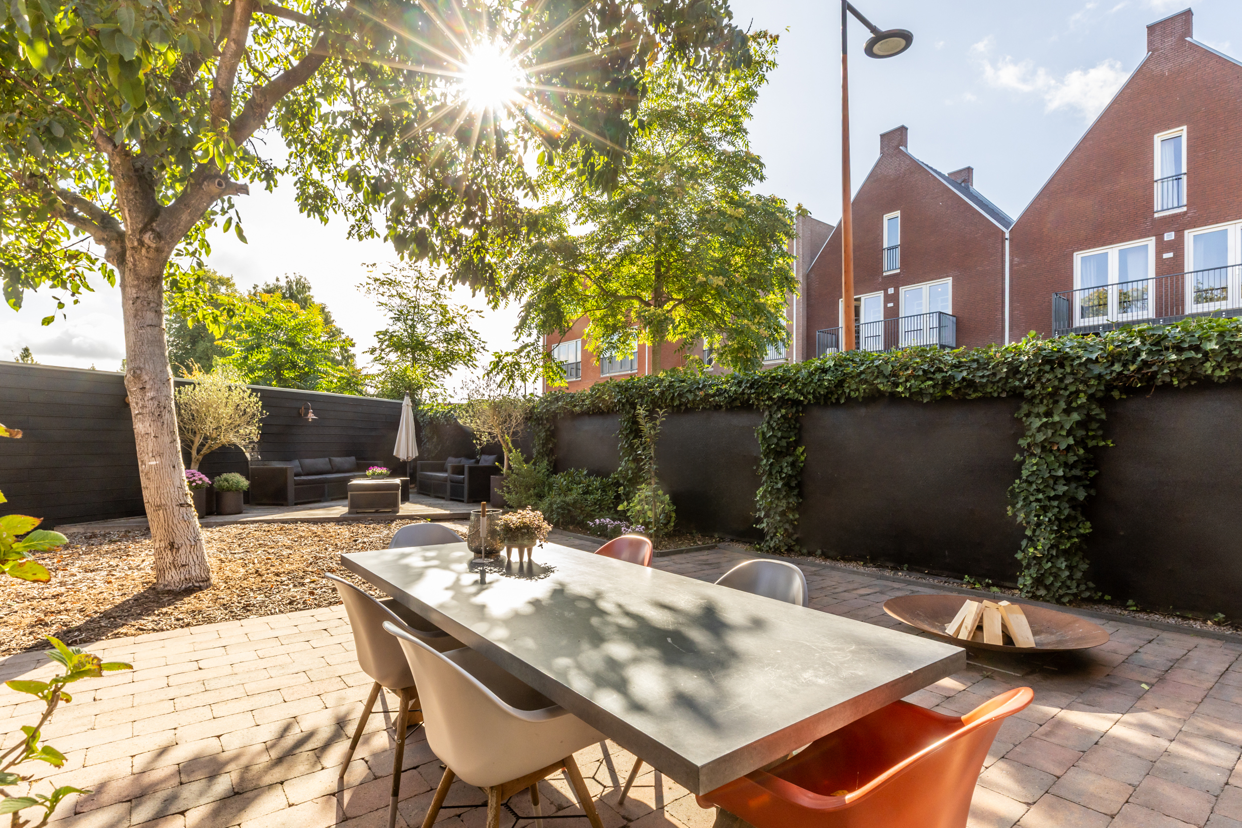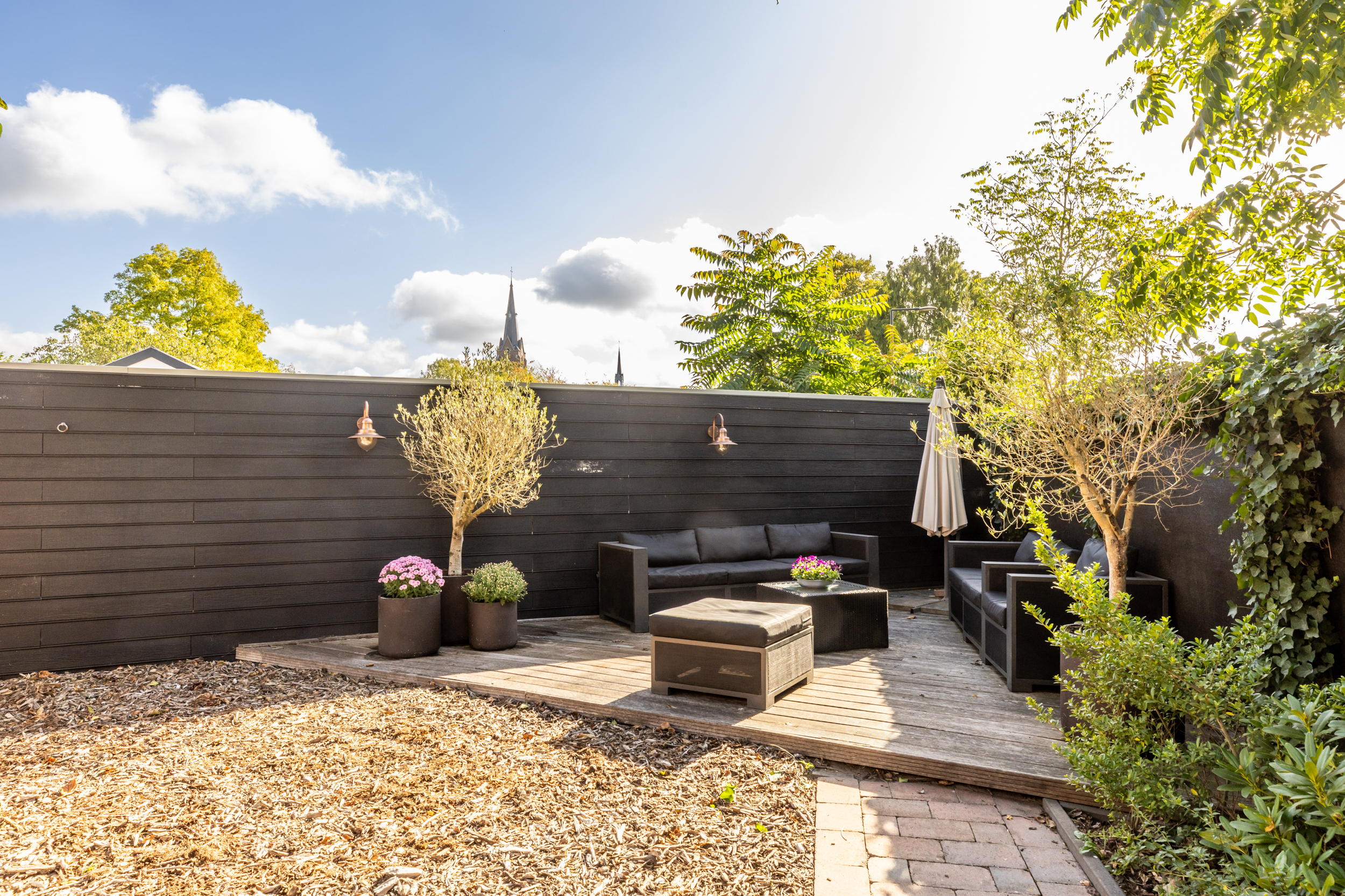 De fraai aangelegde, diepe achtertuin is bijzonder sfeervol en goed verzorgd. Centraal in de tuin staat een mooie boom die fijne schaduwplekken creëert op warme zomerdagen. Via de openslaande deuren kom je direct uit bij de buitentafel en in de hoek van de tuin is een gezellige zithoek gecreëerd. De tuin biedt veel privacy en daarnaast bevindt zich in de hoek een ruime, praktische berging die mooi in de tuin opgaat en harmonieus aansluit bij de rest van de inrichting. De tuin is zorgvuldig aangelegd, biedt volop speelruimte voor kinderen en beschikt over een achterom.