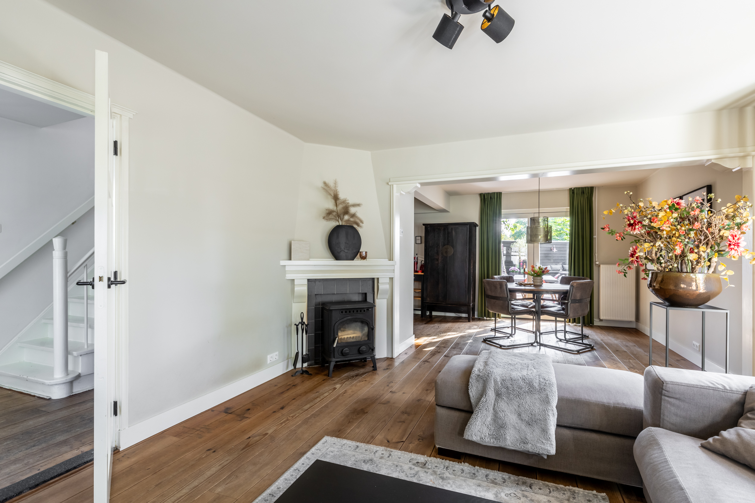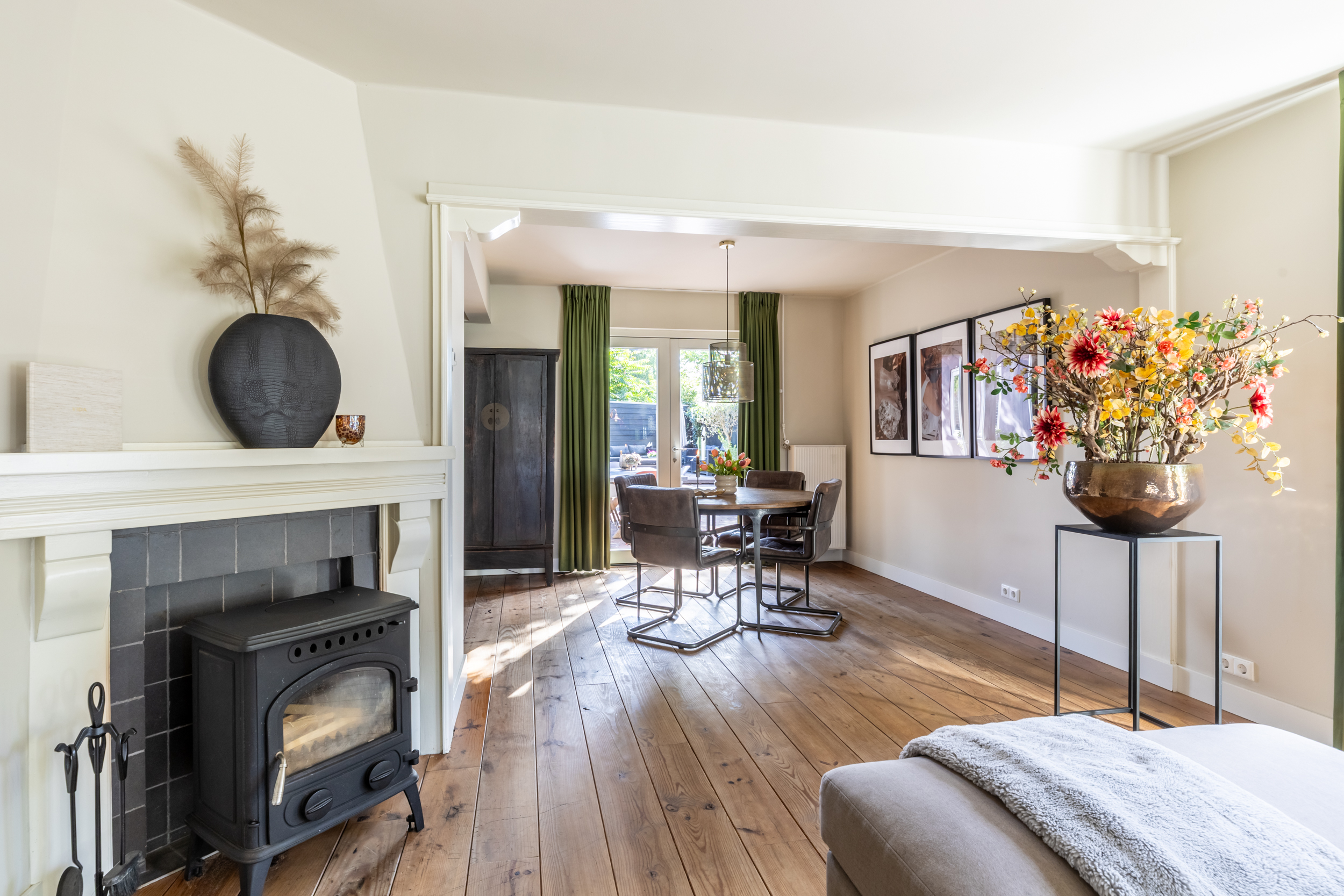 Bij aankomst bij de woning bevindt zich aan de rechterzijde een oprit waar je de auto kunt parkeren. Bij binnenkomst in de hal bevindt zich de trapopgang naar de eerste verdieping. Rechts kom je binnen in de sfeervolle woonkamer, waar de houten vloer en de houtkachel direct zorgen voor warmte en karakter. Grote raampartijen zorgen voor een mooie lichtinval en geven de ruimte een open gevoel. Er is voldoende plek voor een ruime zithoek én een eethoek. Via de openslaande deuren stap je zo de tuin in.