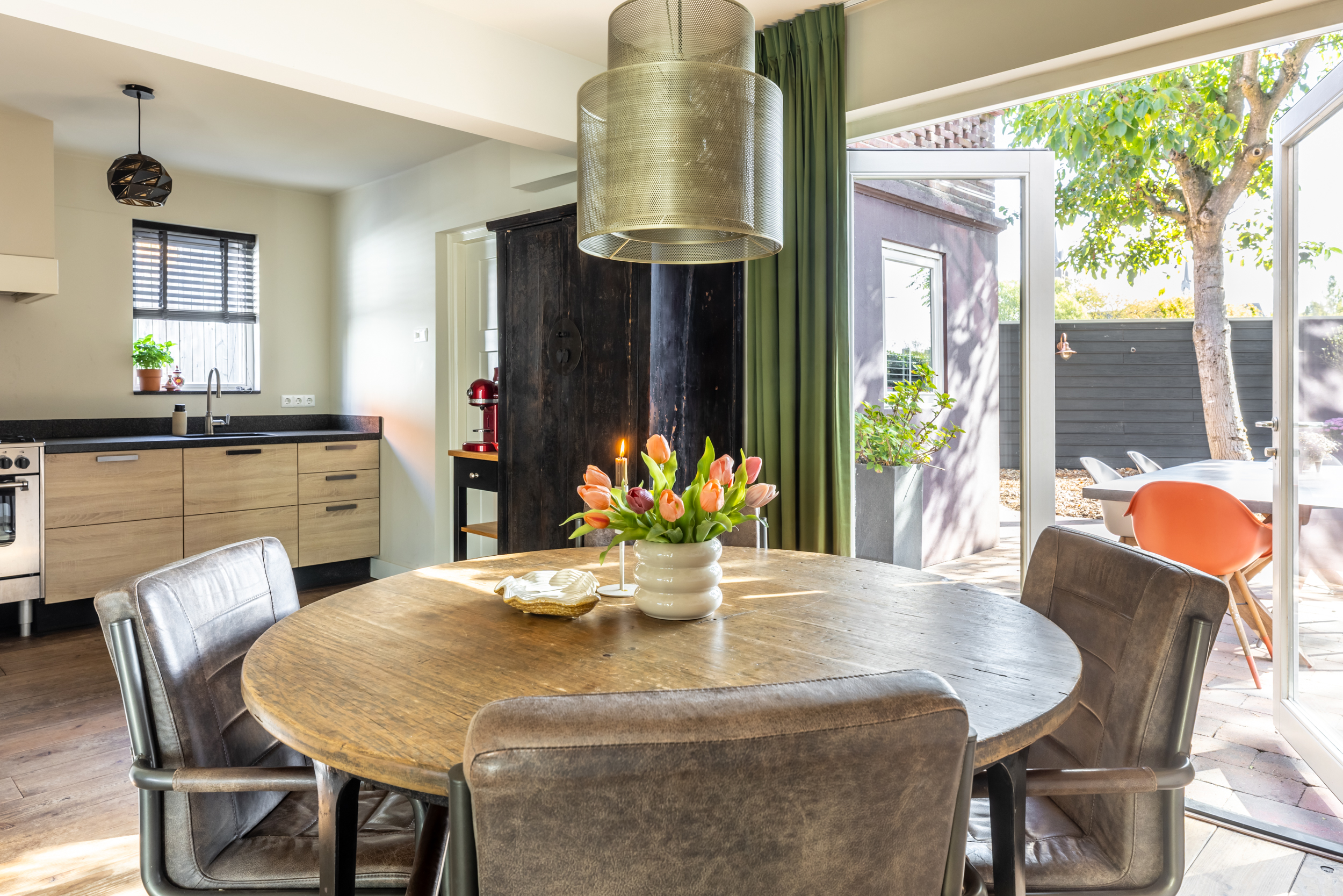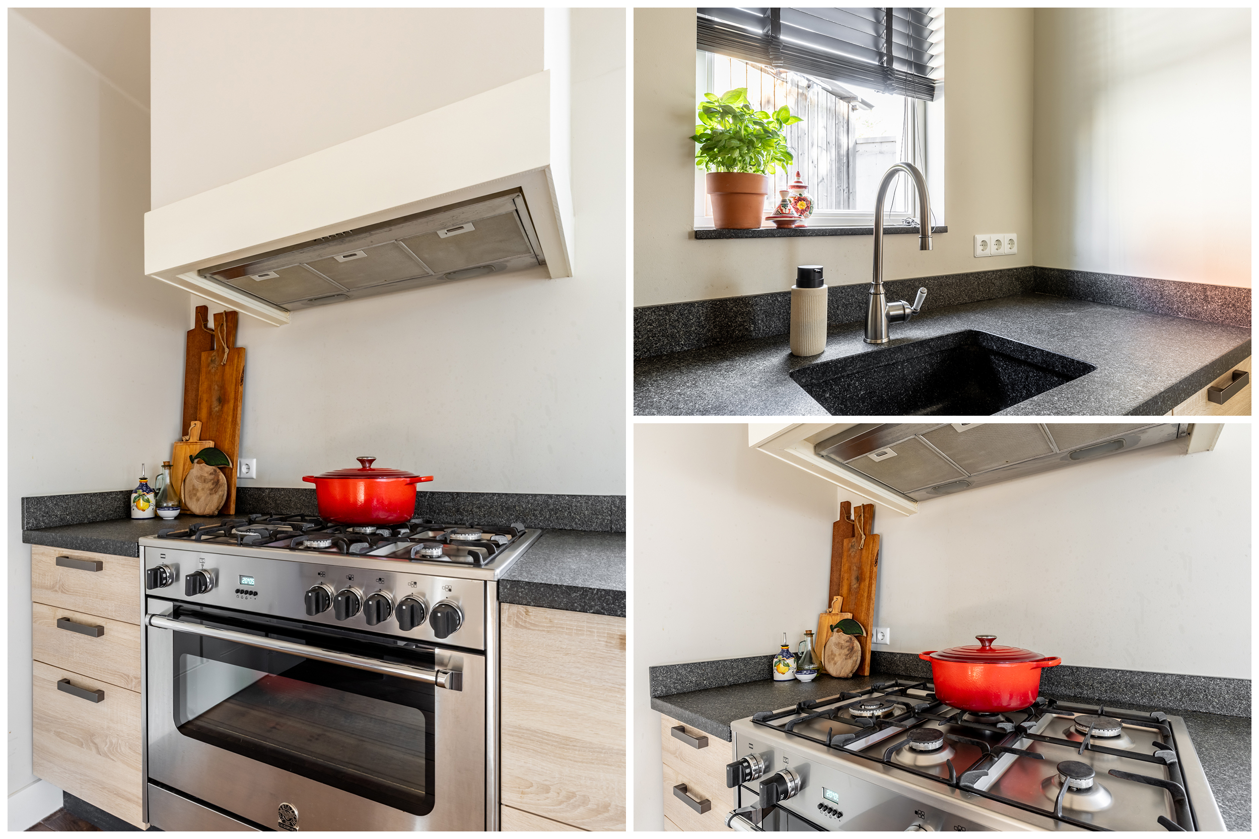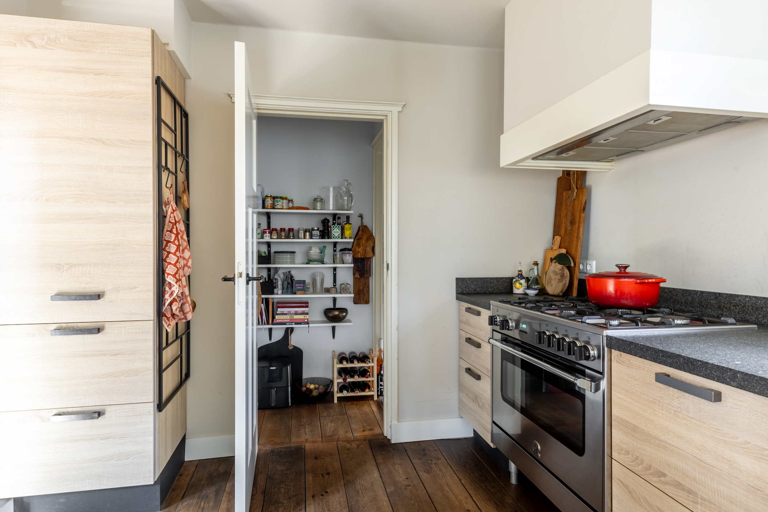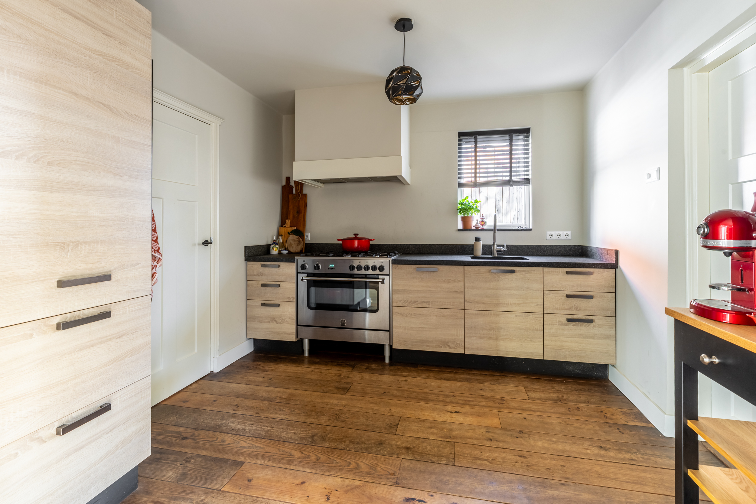 De open keuken (2018) combineert een moderne afwerking met een warme, houten uitstraling. Het robuuste fornuis met oven vormt een echte blikvanger en daarnaast beschikt de keuken over een ingebouwde vaatwasser. Via een deur is extra kastruimte bereikbaar, ideaal voor het opbergen van voorraad of keukenapparatuur. Een ideale plek om uitgebreid te koken én gezellig samen te komen.