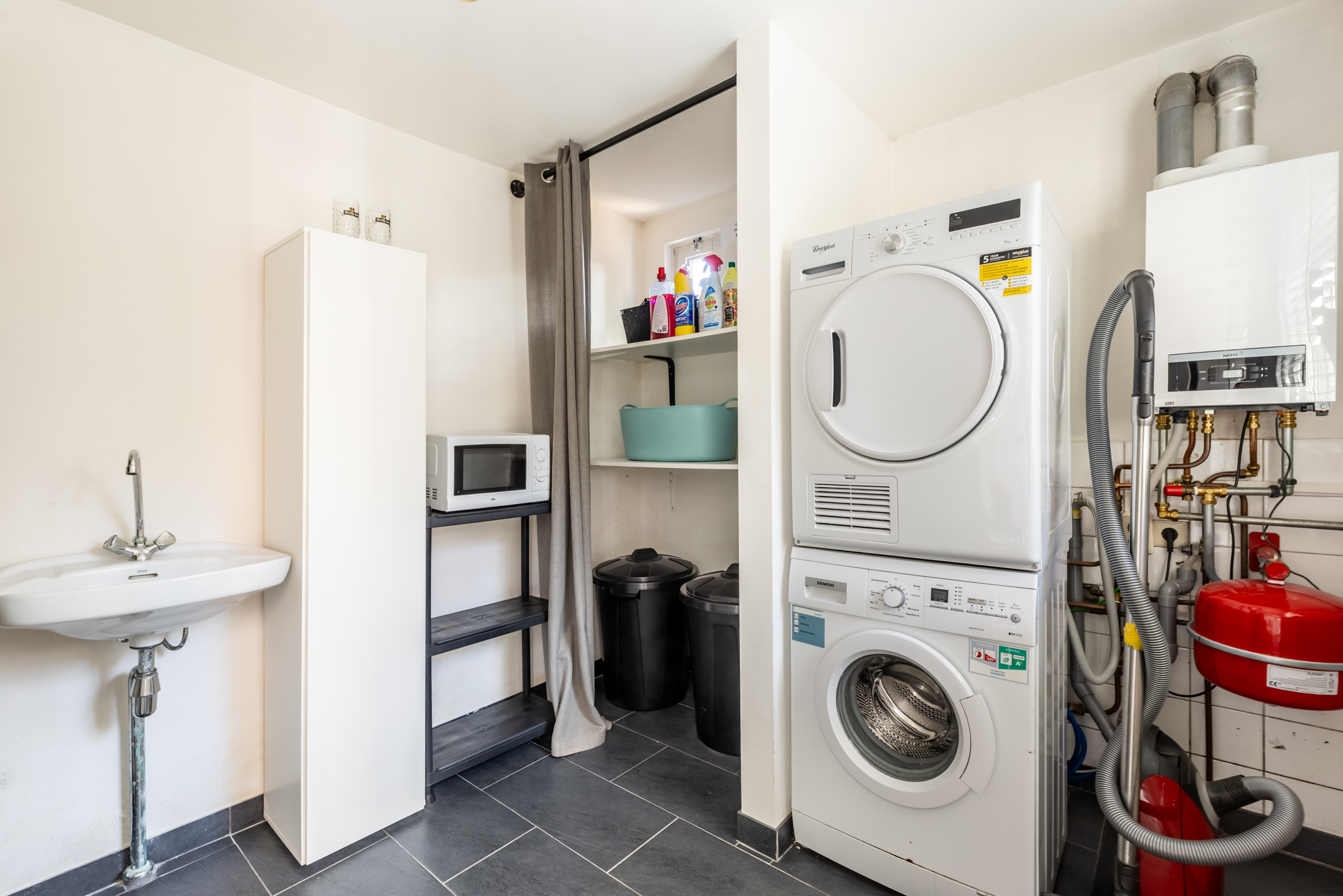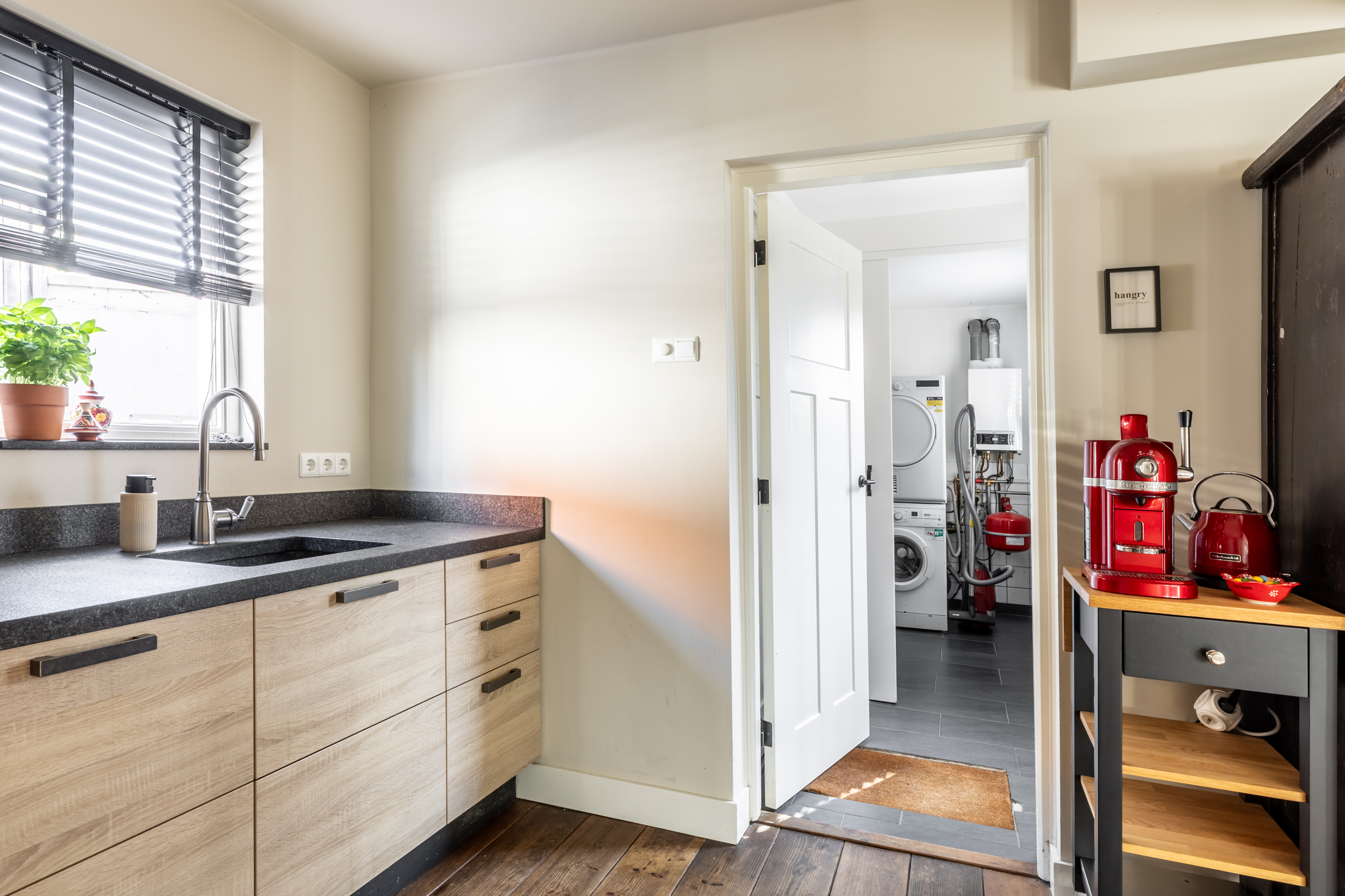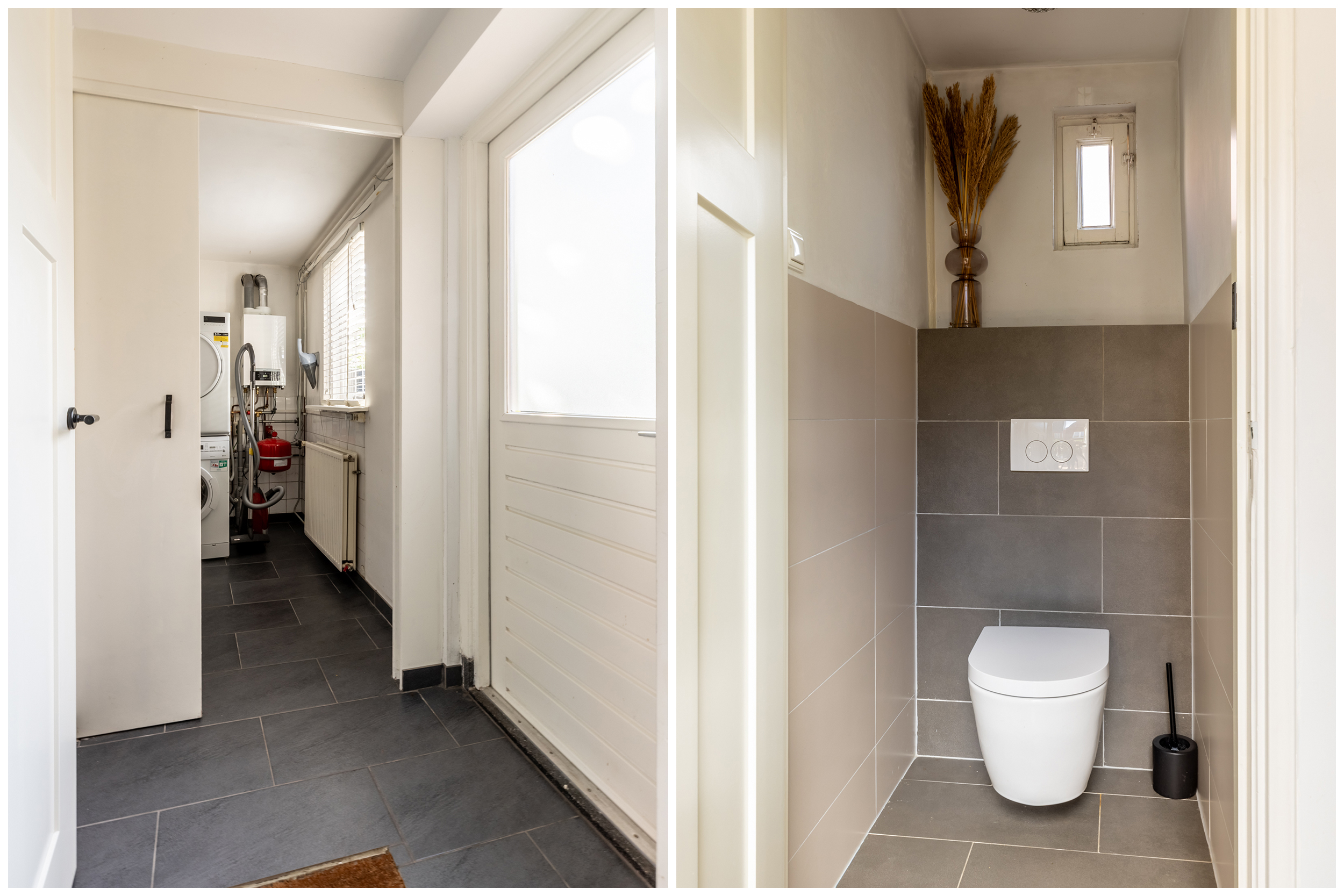 Aansluitend vind je een tweede hal die toegang biedt tot het toilet en de bijkeuken. Hier bevinden zich de cv-installatie (2024), de wasmachine-aansluiting, een praktische wasbak en extra kastruimte.
