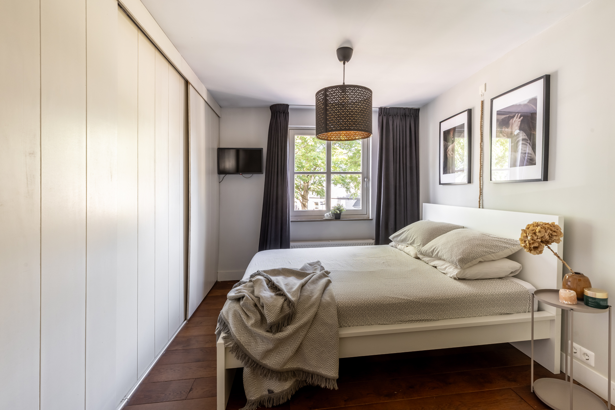 De overloop geeft toegang tot drie royale slaapkamers en de badkamer. De hoofdslaapkamer geniet van veel lichtinval en heeft een volledige wand met praktische inbouwkasten, wat zorgt voor meer dan genoeg bergruimte. Daarnaast is er nog een aparte kast bereikbaar via een deur.