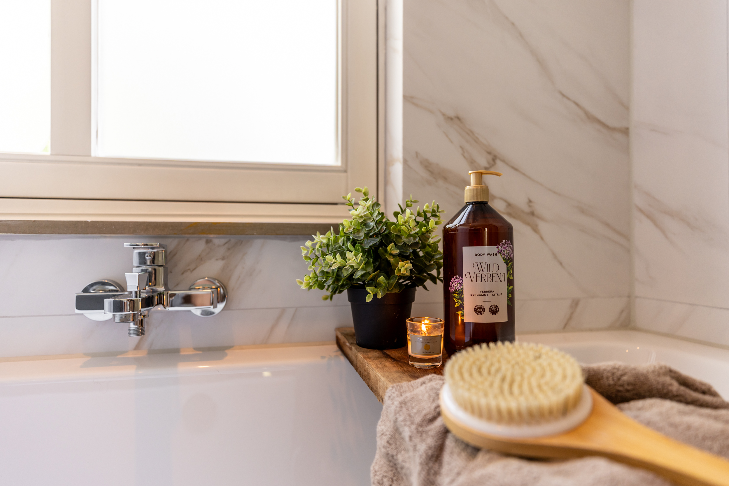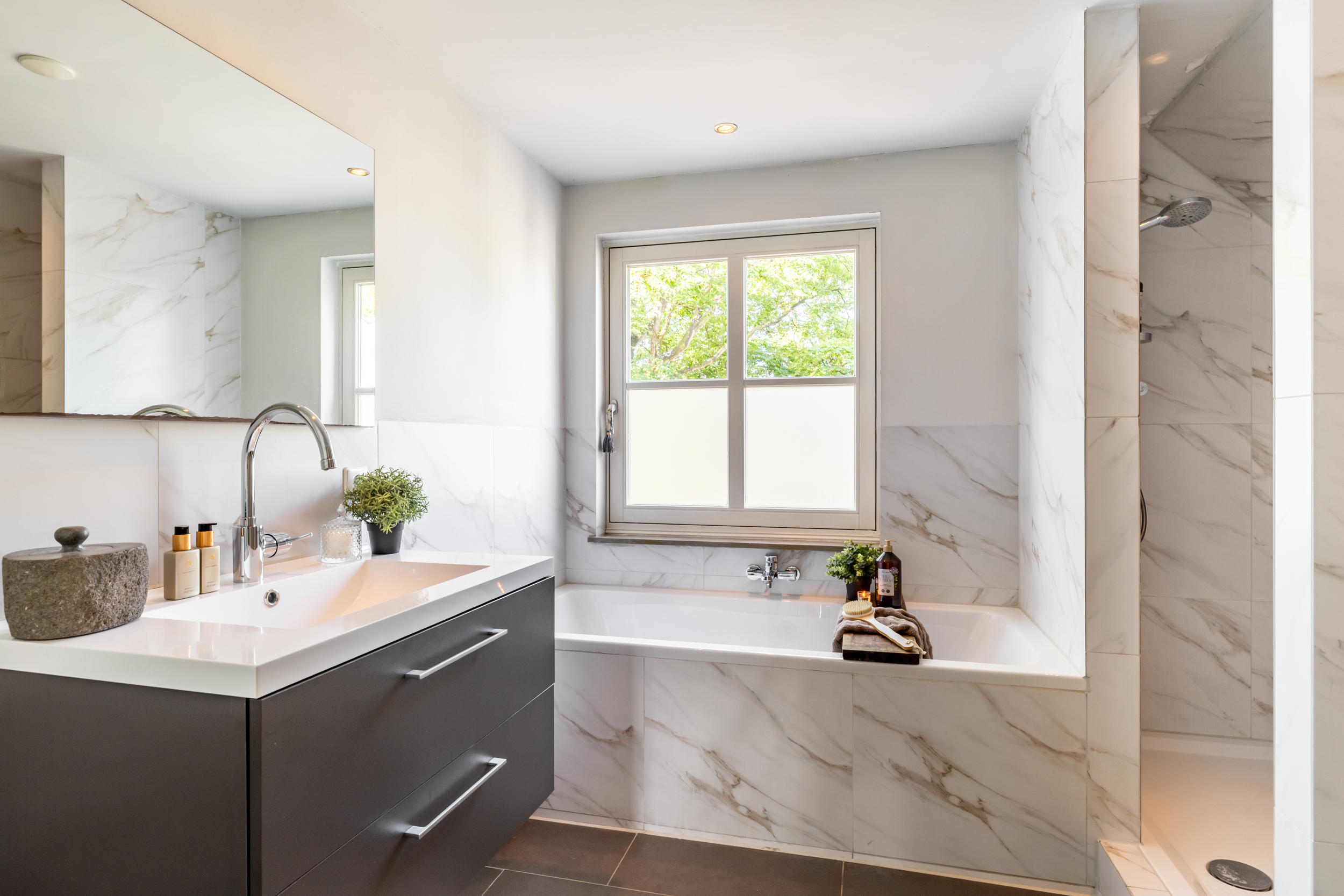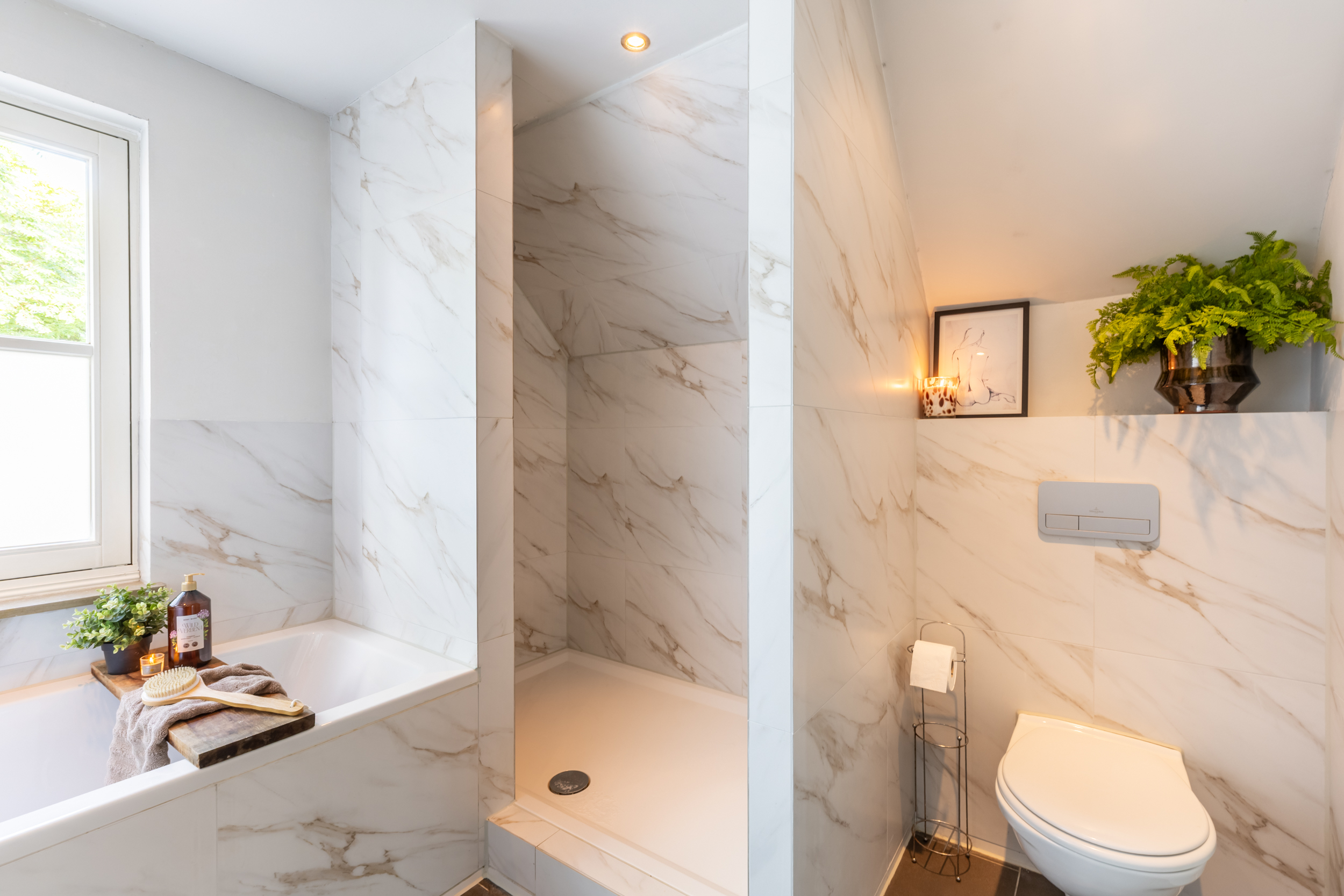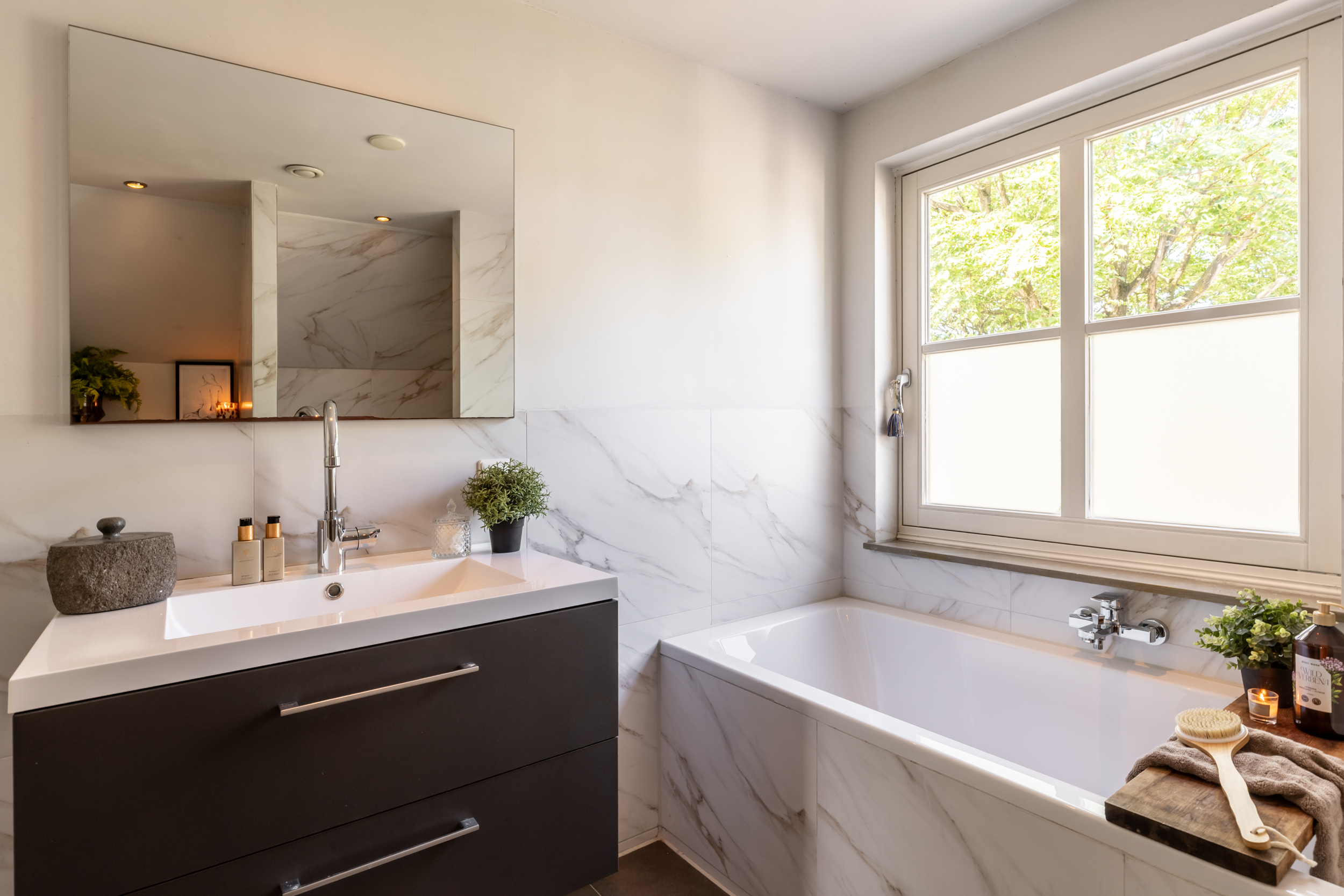 De badkamer is in 2018 volledig gerenoveerd en is ruim van opzet. De marmer-look tegels en de aangelegde vloerverwarming geven de ruimte een luxe uitstraling. Daarnaast beschikt de badkamer over een ligbad, een inloopdouche, een wastafelmeubel en een toilet.