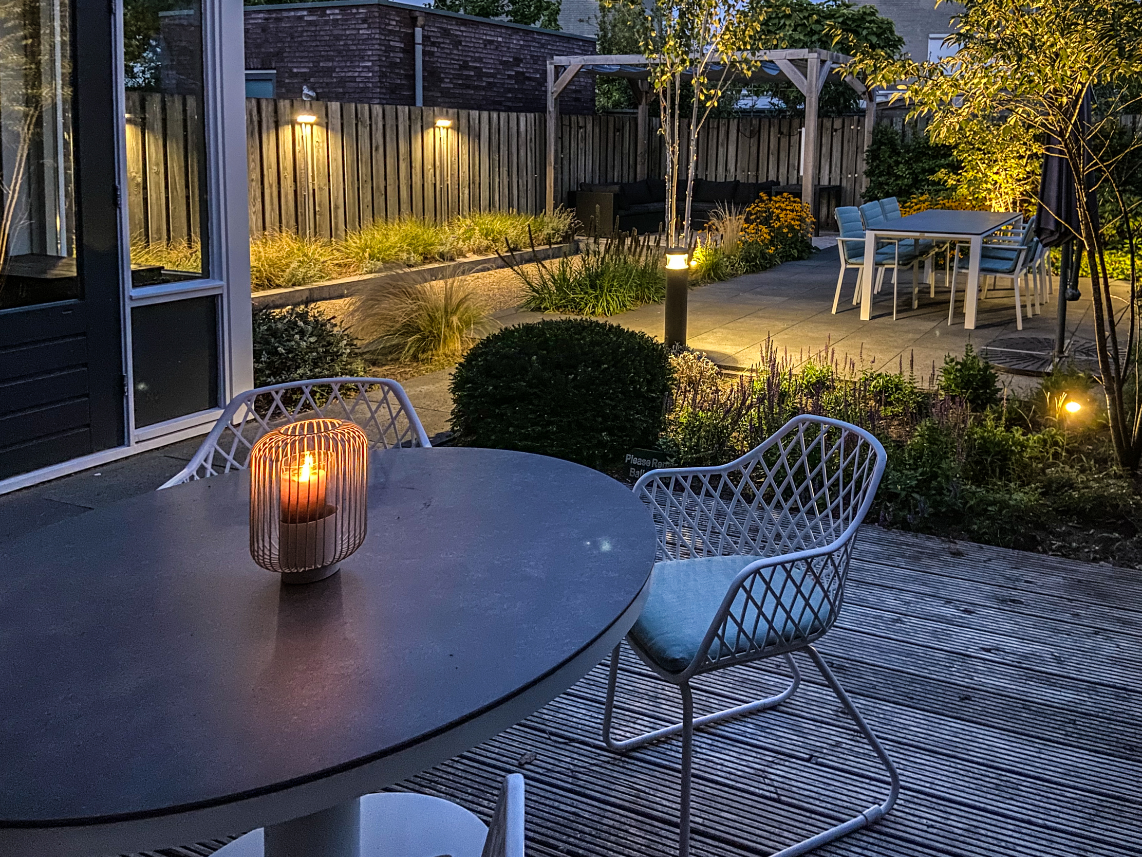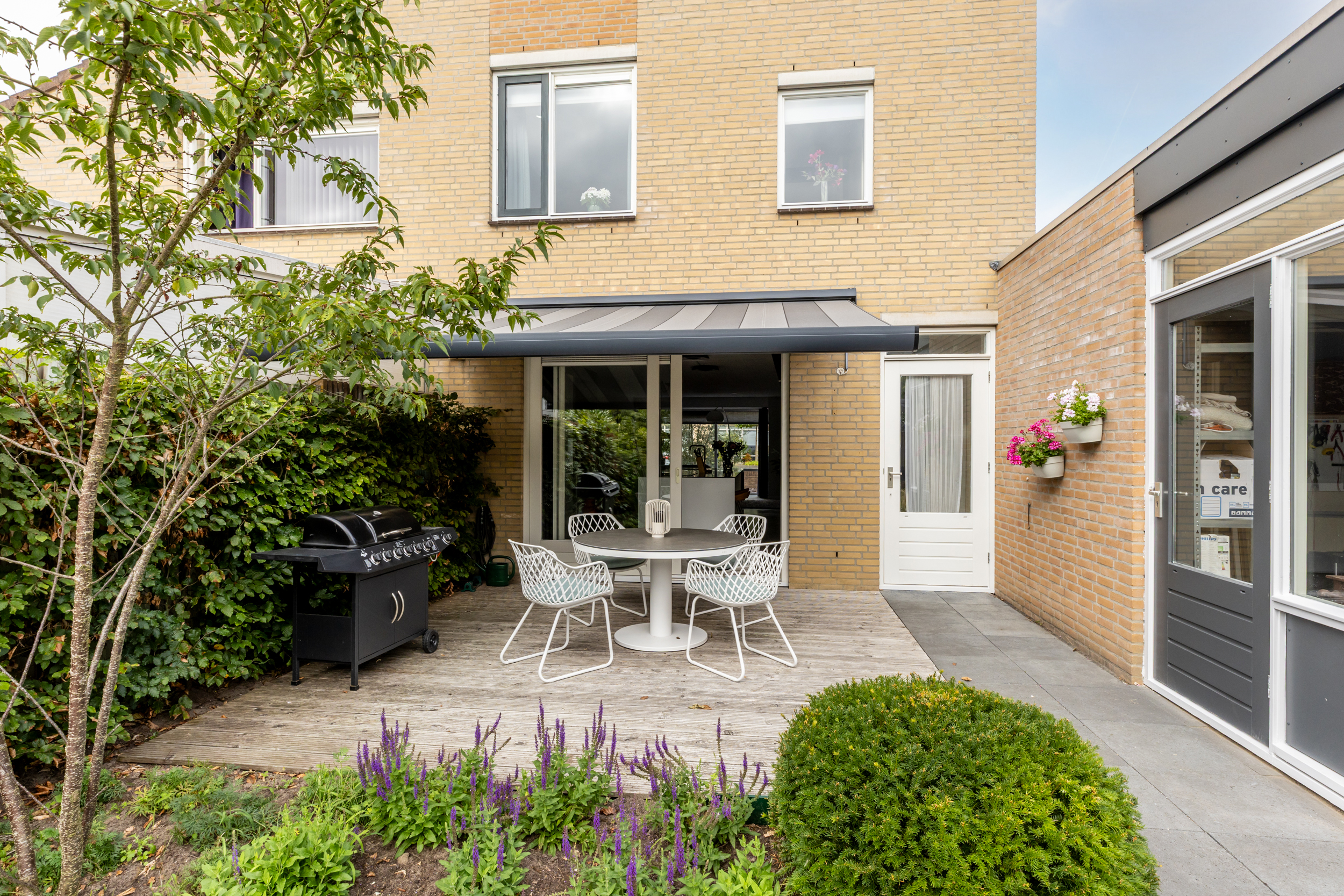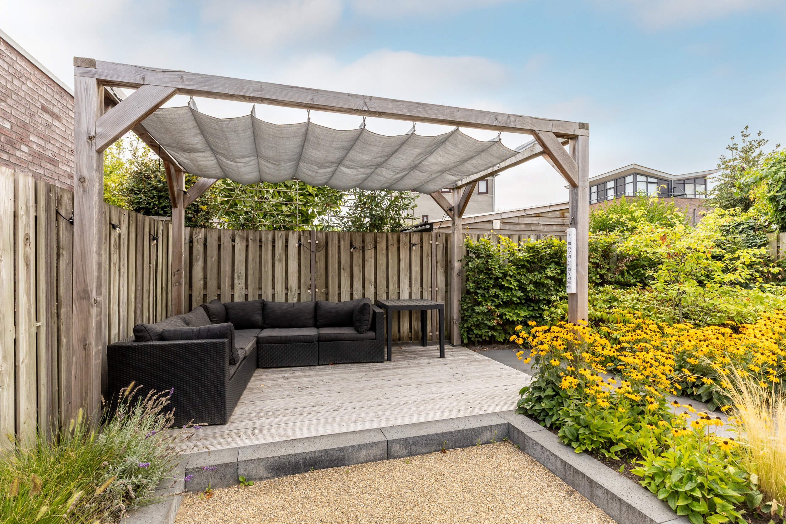 Daarnaast is tegen de gevel een elektrische zonwering geplaatst, zodat er altijd een fijne schaduwplek beschikbaar is op zonnige dagen.