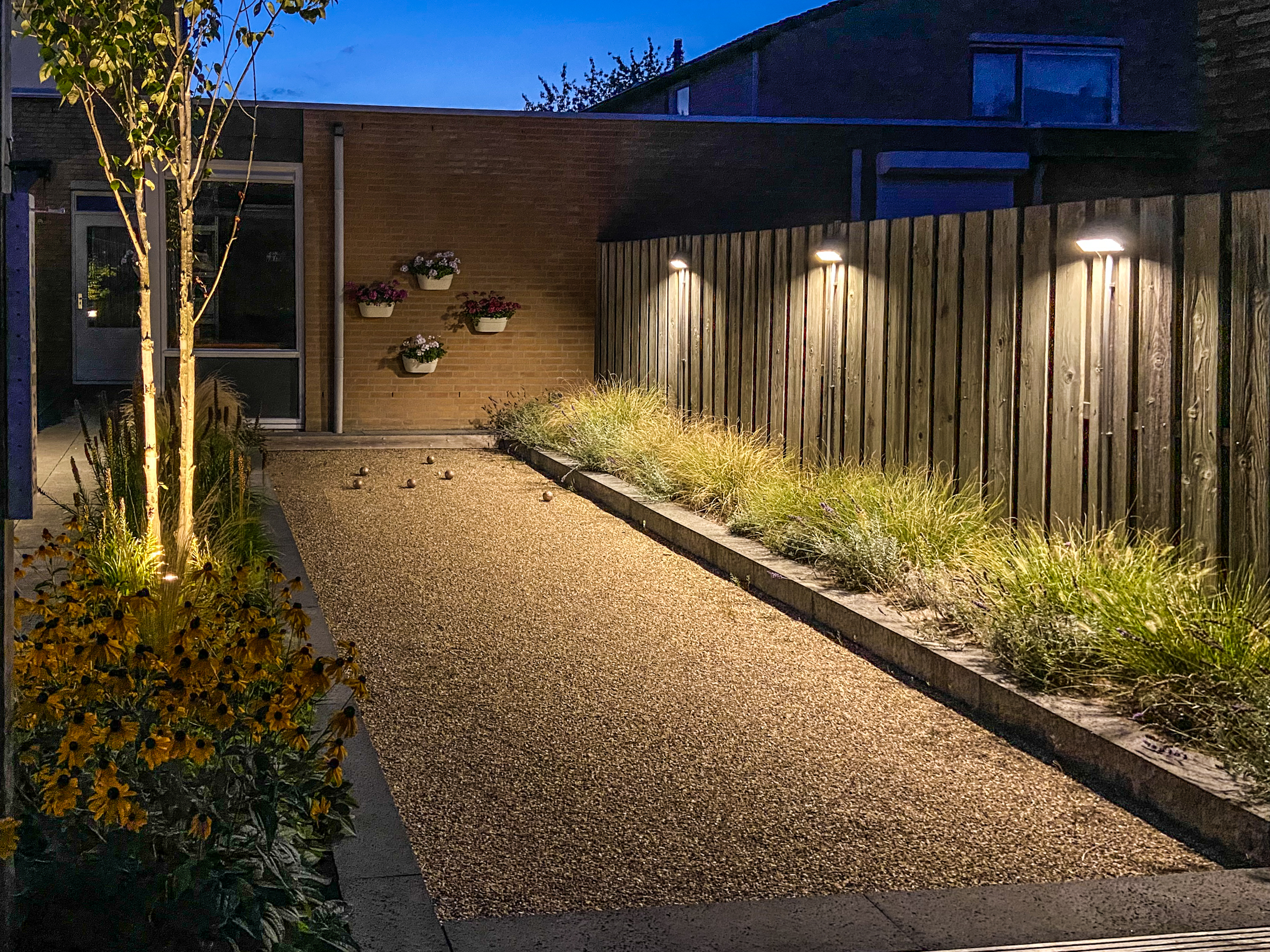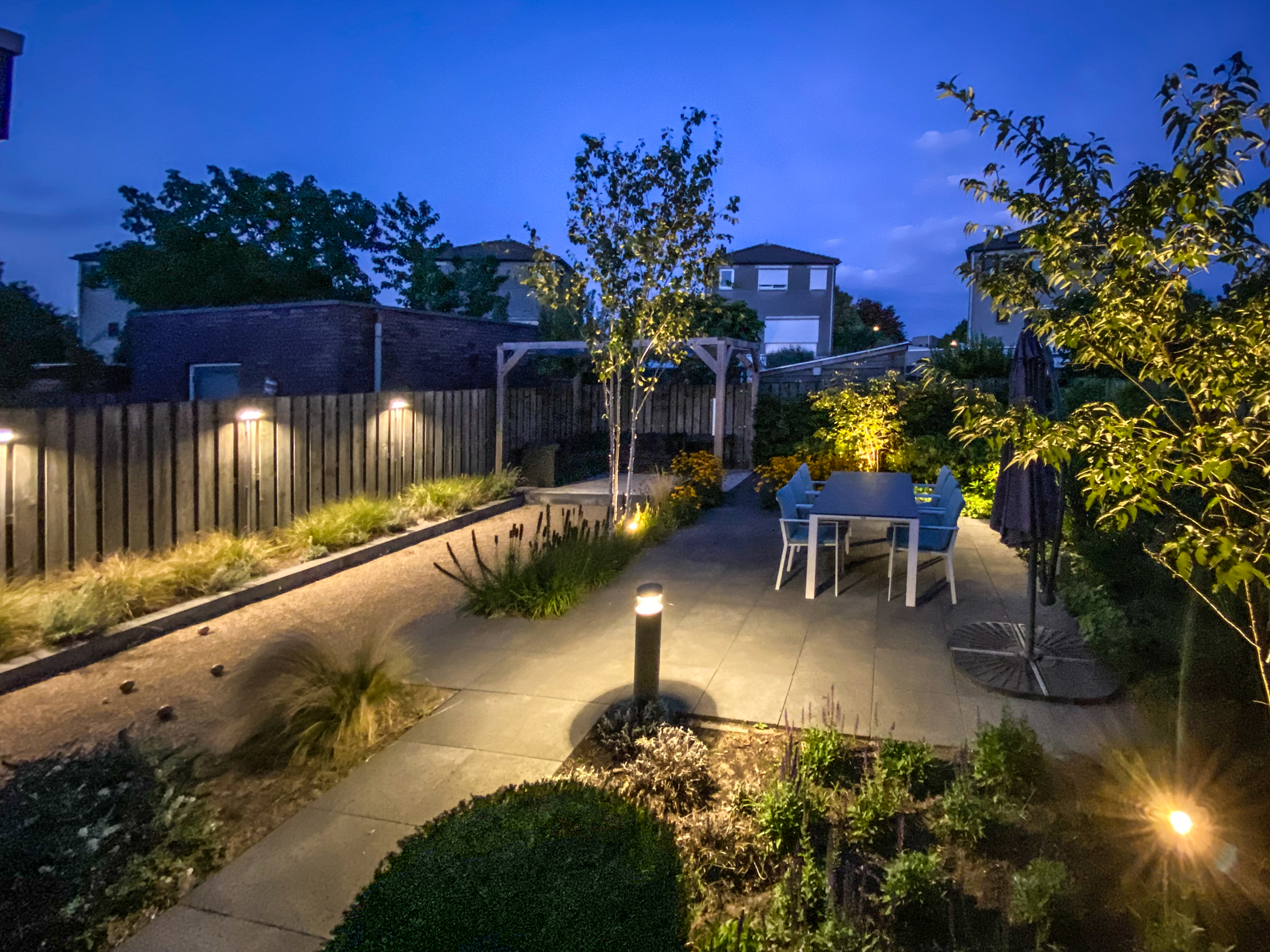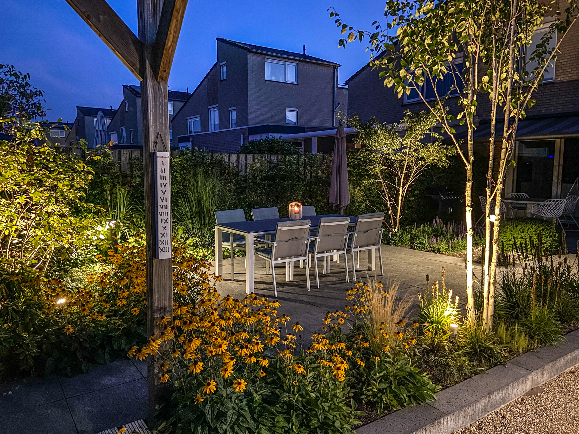 Daarnaast is tegen de gevel een elektrische zonwering geplaatst, zodat er altijd een fijne schaduwplek beschikbaar is op zonnige dagen.