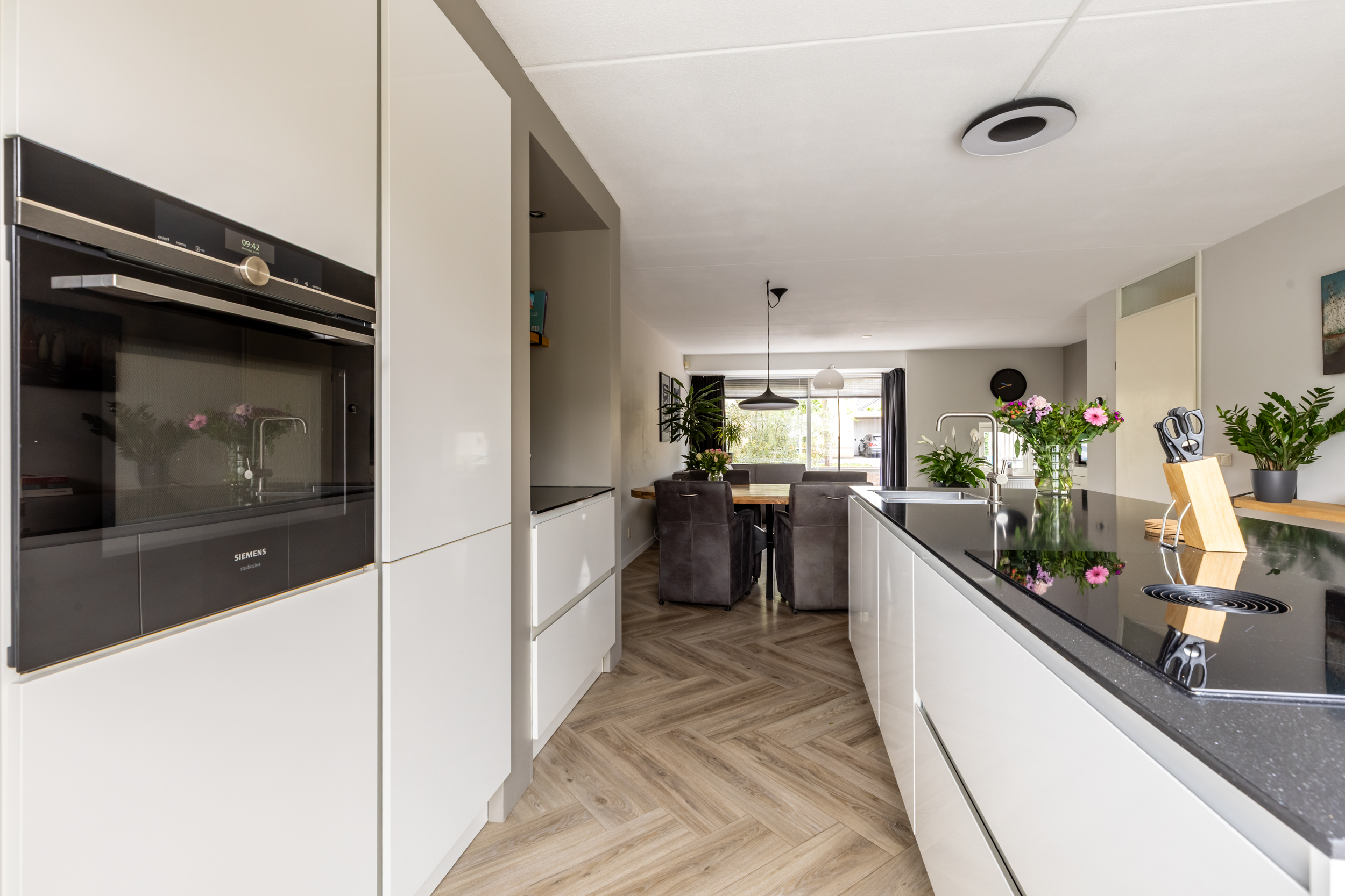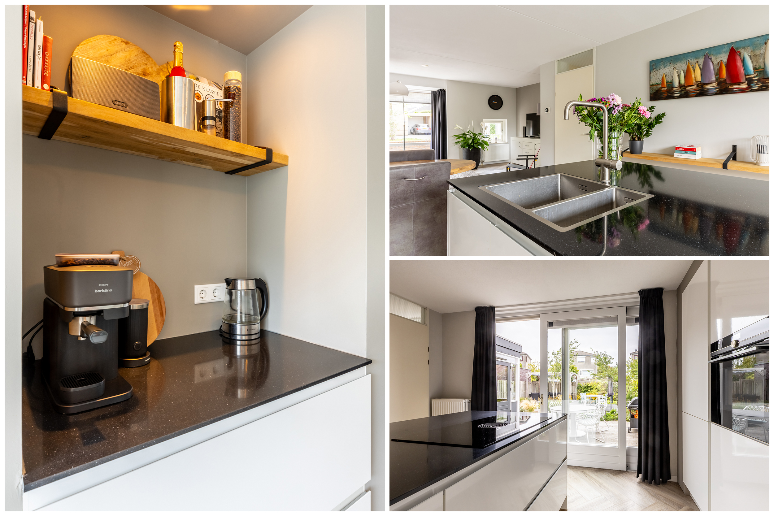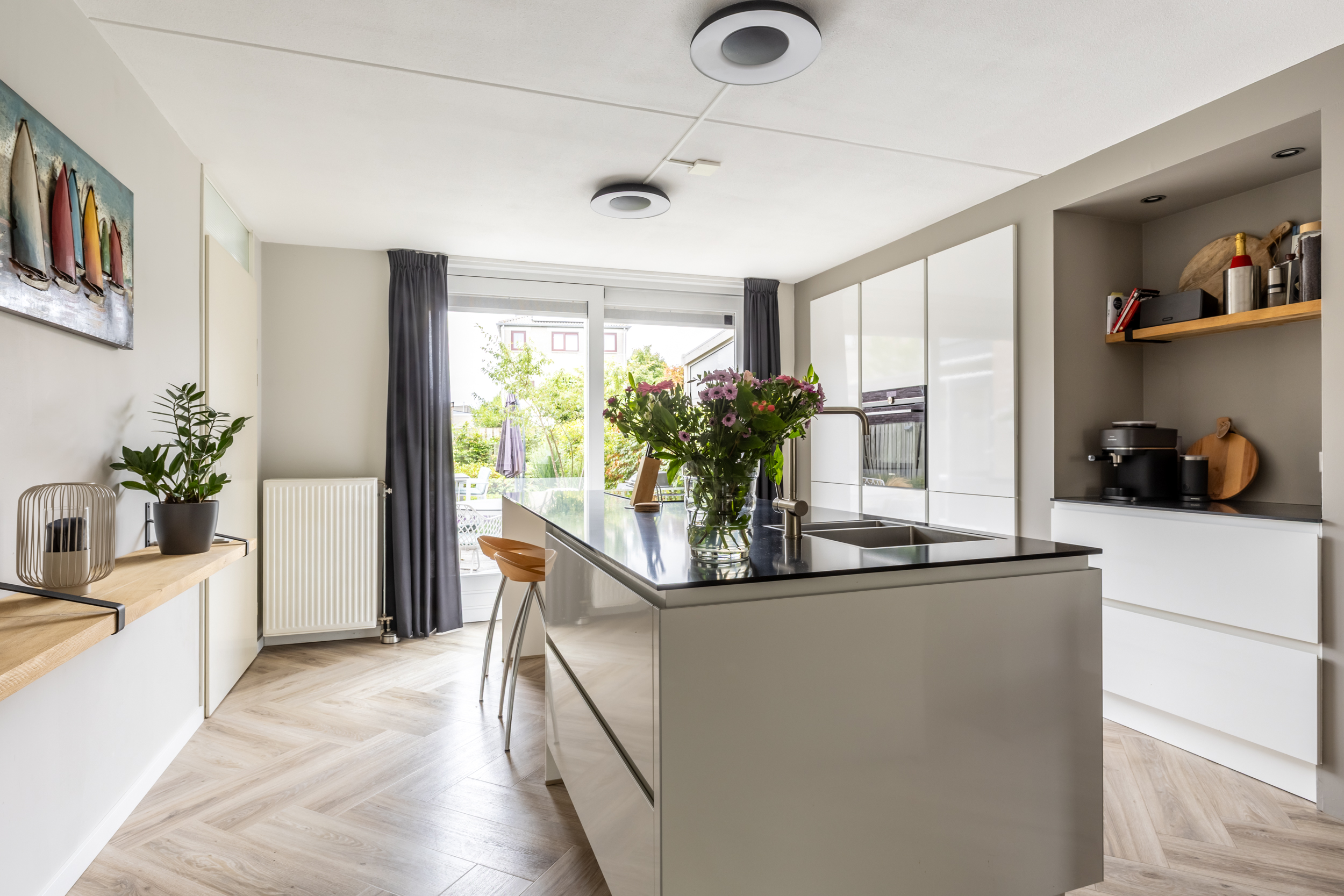 Bij binnenkomst in deze prachtige woning valt direct de royale en lichte woonkamer op. De woonkamer staat in open verbinding met de moderne keuken, waardoor een heerlijk ruimtelijk geheel ontstaat. De absolute eyecatcher op de begane grond is de luxe keuken met praktisch kookeiland. Deze keuken is voorzien van hoogwaardige inbouwapparatuur, waaronder een Siemens combi-oven, een Bora inductiekookplaat met geïntegreerde afzuiging, een koelkast, vaatwasser en spoelbak. Dankzij de ruime werkbladen en de vele kastruimte is dit de ideale plek voor kookliefhebbers. Een leuk extra detail is het ingebouwde koffiehoekje, waar u uw koffie- of theeservies stijlvol kunt presenteren. De woon- en eetkamer biedt volop ruimte voor een grote eettafel en een comfortabele zithoek. De erker zorgt niet alleen voor extra daglicht, maar geeft de ruimte ook een sfeervolle uitstraling. Het is de perfecte plek om te ontspannen of gasten te ontvangen. Daarnaast vindt u op de begane grond nog een aparte toiletruimte met fonteintje en toegang tot de meterkast vanuit de hal.