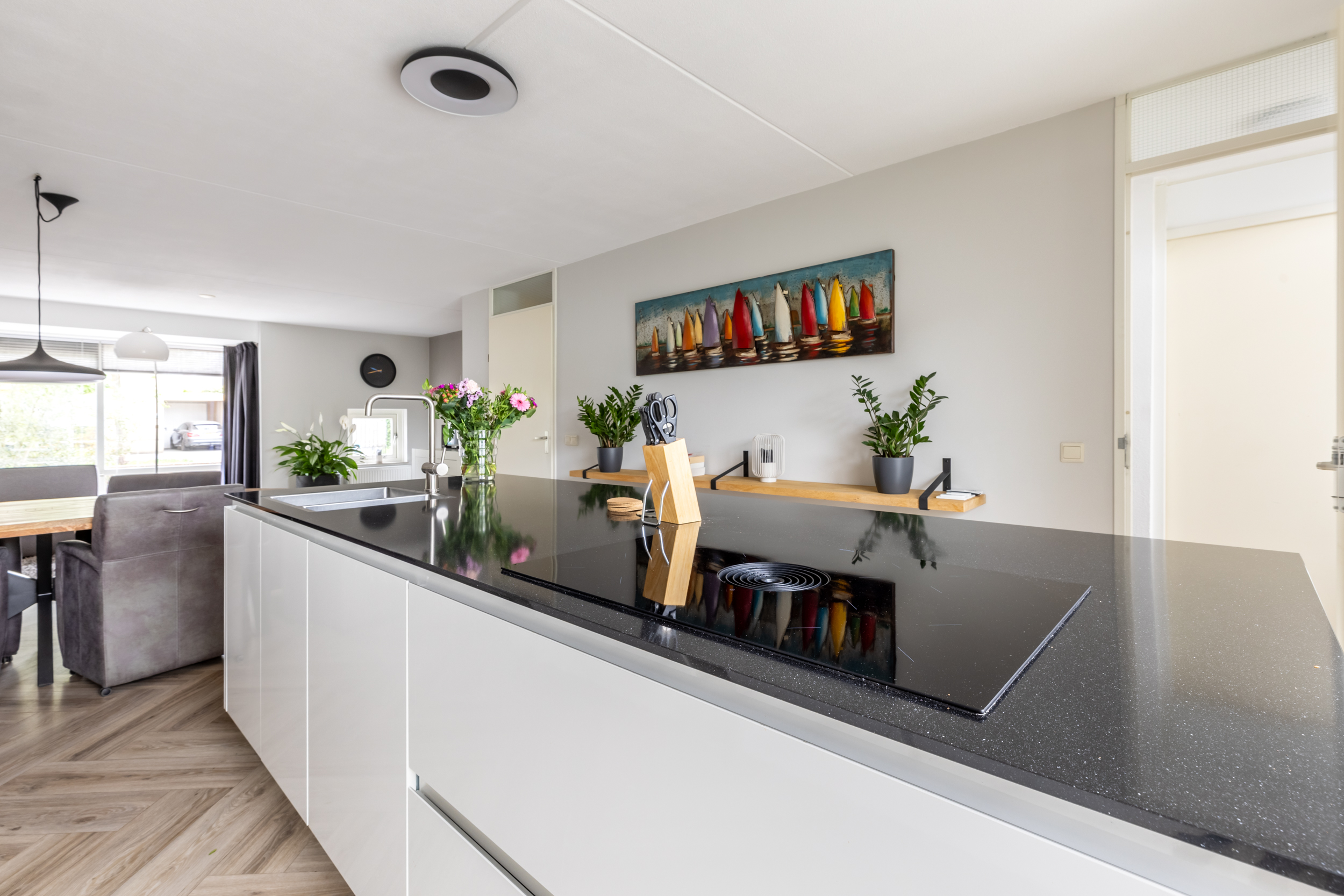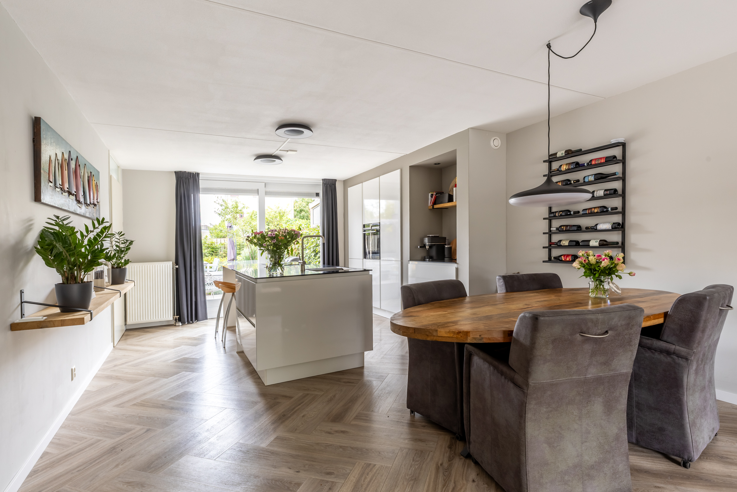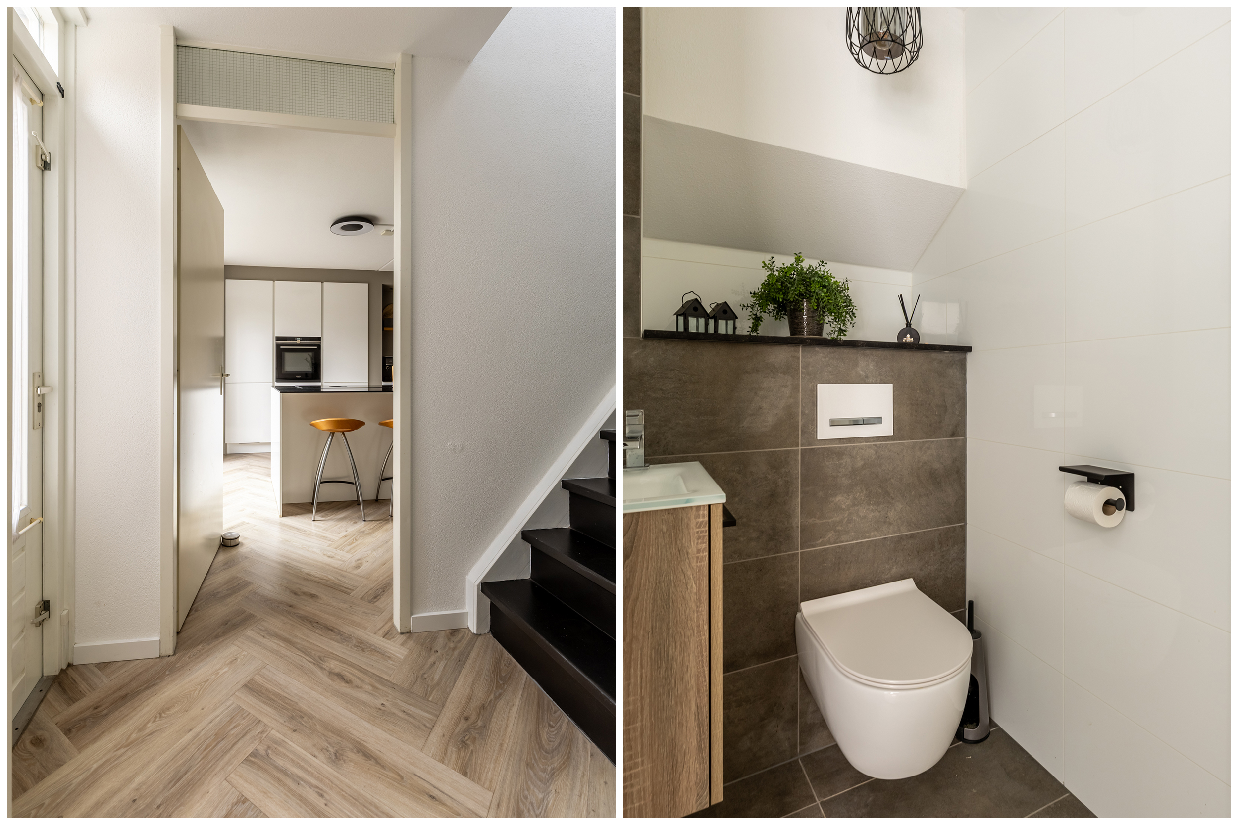 Bij binnenkomst in deze prachtige woning valt direct de royale en lichte woonkamer op. De woonkamer staat in open verbinding met de moderne keuken, waardoor een heerlijk ruimtelijk geheel ontstaat. De absolute eyecatcher op de begane grond is de luxe keuken met praktisch kookeiland. Deze keuken is voorzien van hoogwaardige inbouwapparatuur, waaronder een Siemens combi-oven, een Bora inductiekookplaat met geïntegreerde afzuiging, een koelkast, vaatwasser en spoelbak. Dankzij de ruime werkbladen en de vele kastruimte is dit de ideale plek voor kookliefhebbers. Een leuk extra detail is het ingebouwde koffiehoekje, waar u uw koffie- of theeservies stijlvol kunt presenteren. De woon- en eetkamer biedt volop ruimte voor een grote eettafel en een comfortabele zithoek. De erker zorgt niet alleen voor extra daglicht, maar geeft de ruimte ook een sfeervolle uitstraling. Het is de perfecte plek om te ontspannen of gasten te ontvangen. Daarnaast vindt u op de begane grond nog een aparte toiletruimte met fonteintje en toegang tot de meterkast vanuit de hal.