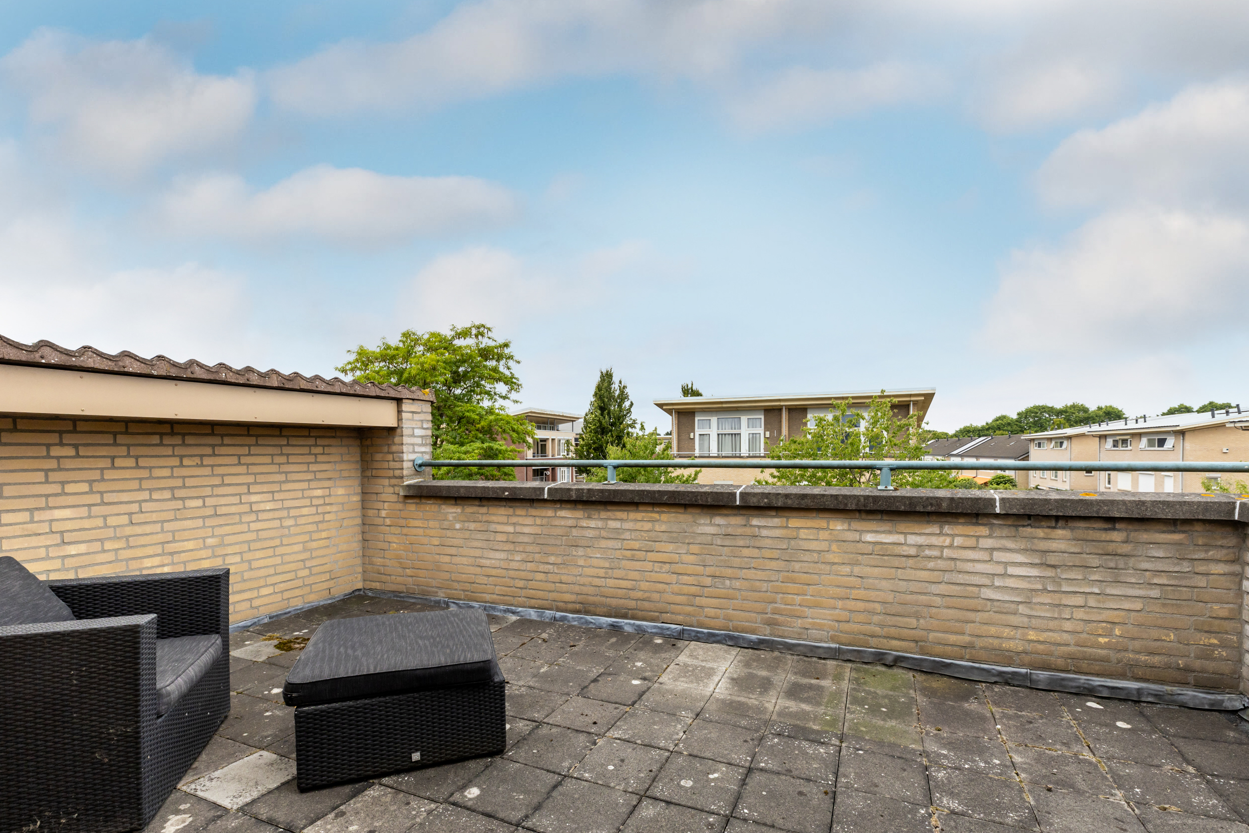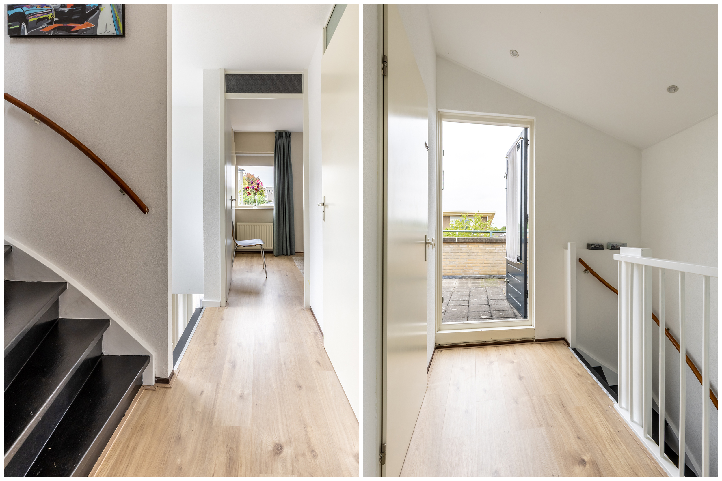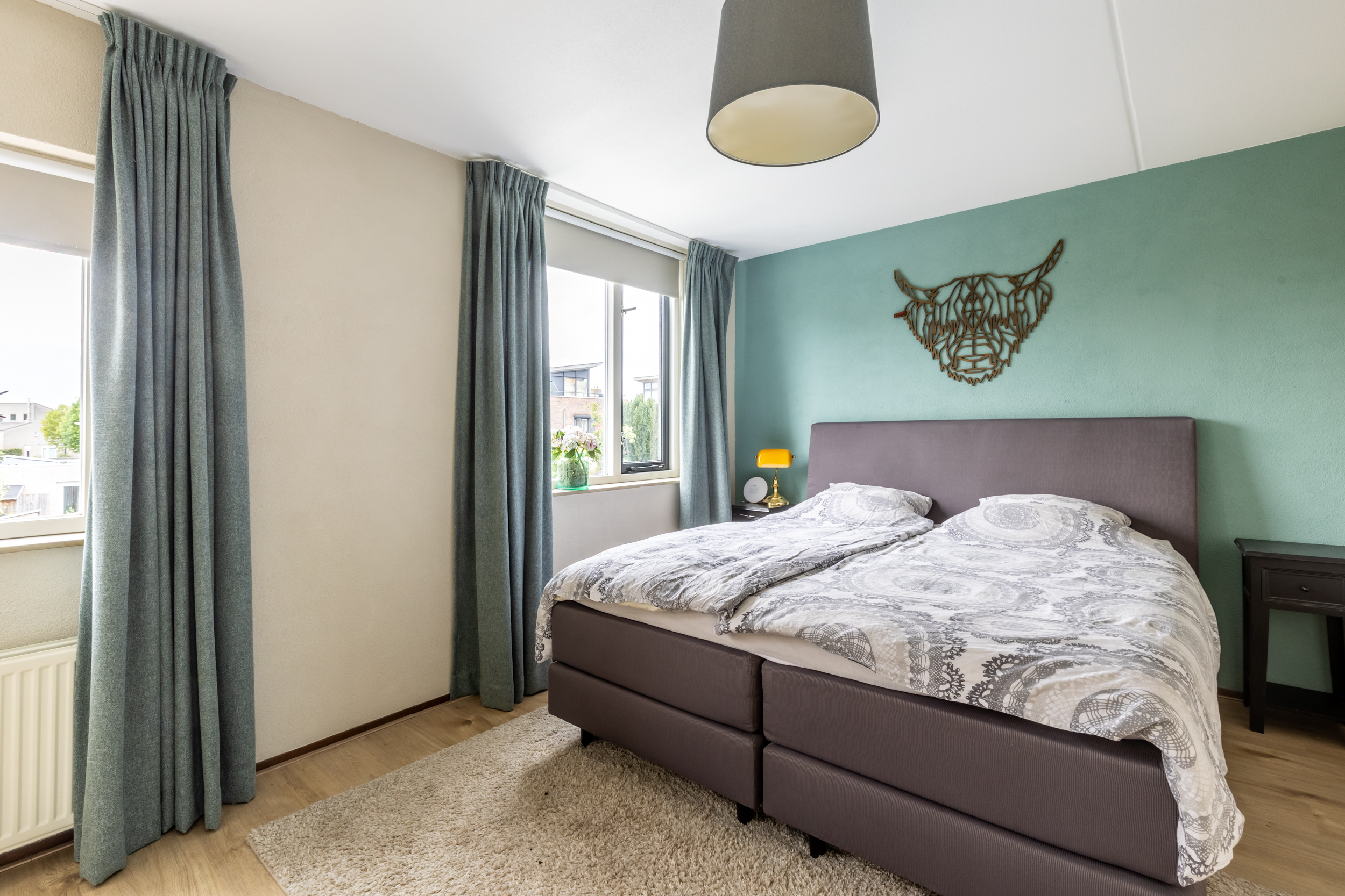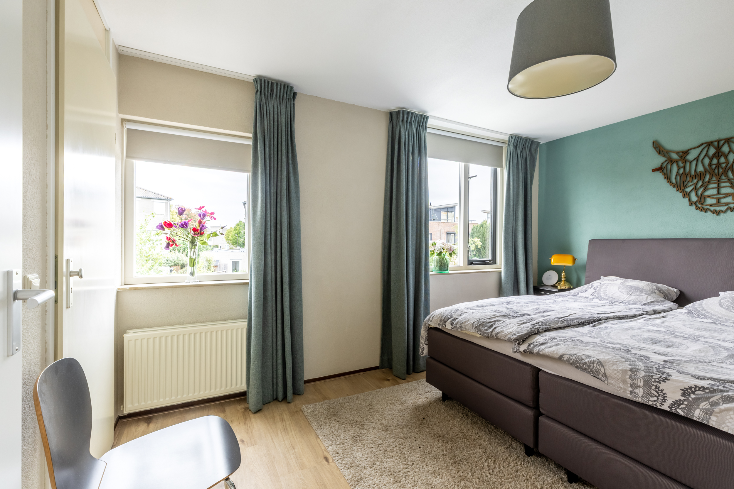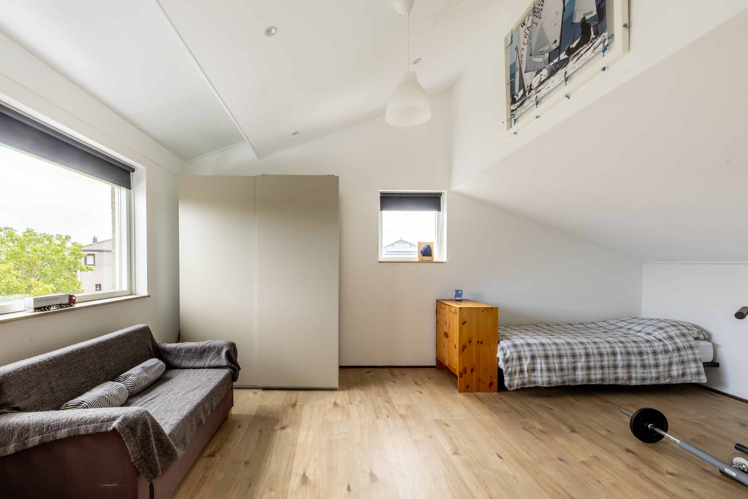 Een bijzonder pluspunt is het dakterras, bereikbaar vanuit deze kamer. Dit terras ligt aan de voorzijde van de woning en is georiënteerd op het zonnige westen – dé perfecte plek om in de namiddag en avond te genieten van een drankje in de zon. Hier is voldoende ruimte voor een sfeervolle loungeset.