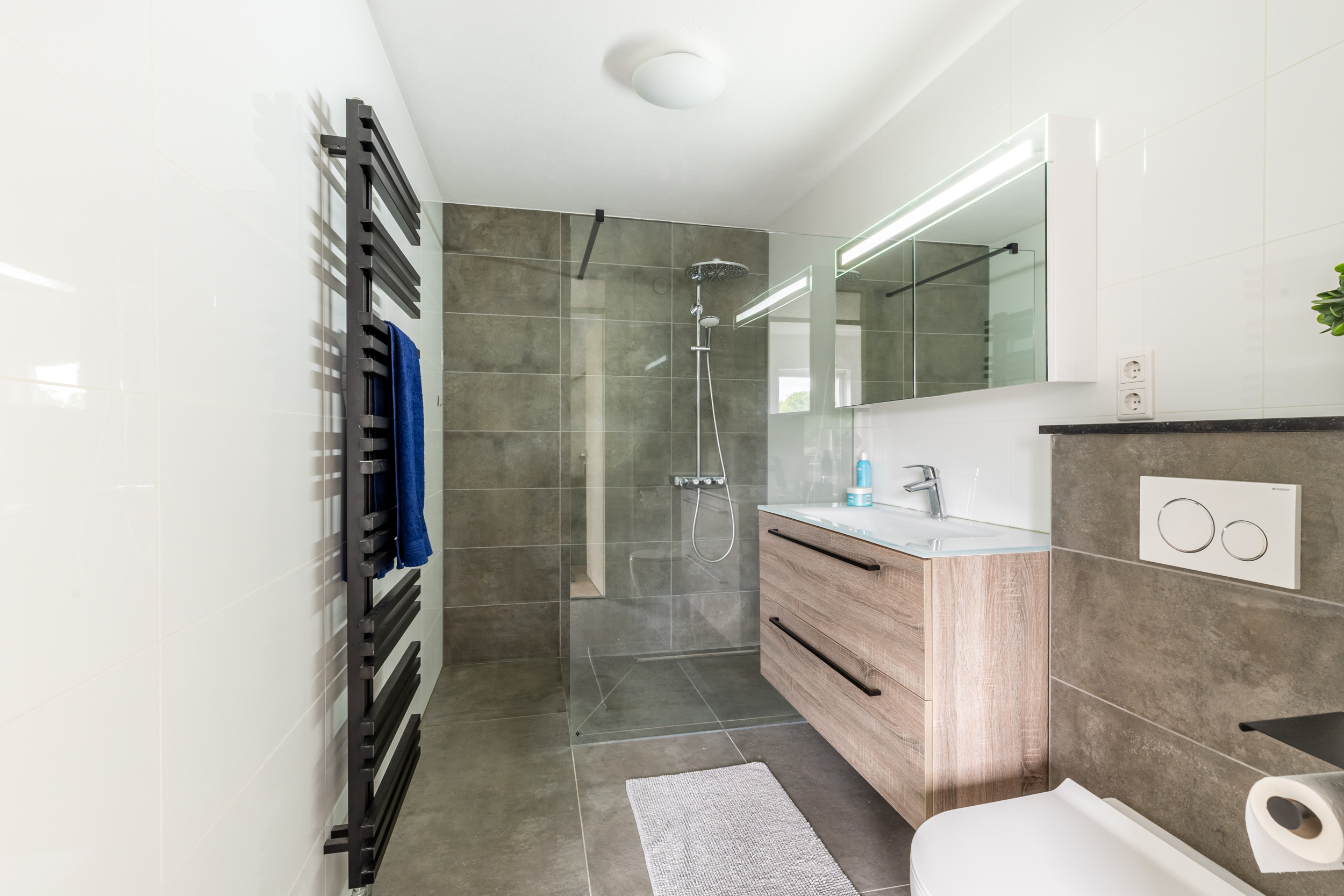 Alle slaapkamers en de overloop zijn netjes afgewerkt met een lichte houtlook laminaatvloer, wat zorgt voor een frisse uitstraling. De badkamer is modern en stijlvol ingericht en voorzien van alle gemakken: een ruime inloopdouche, een wastafel met meubel, een toilet en een designradiator. De grote grijsgetinte tegels versterken het eigentijdse karakter van de ruimte.