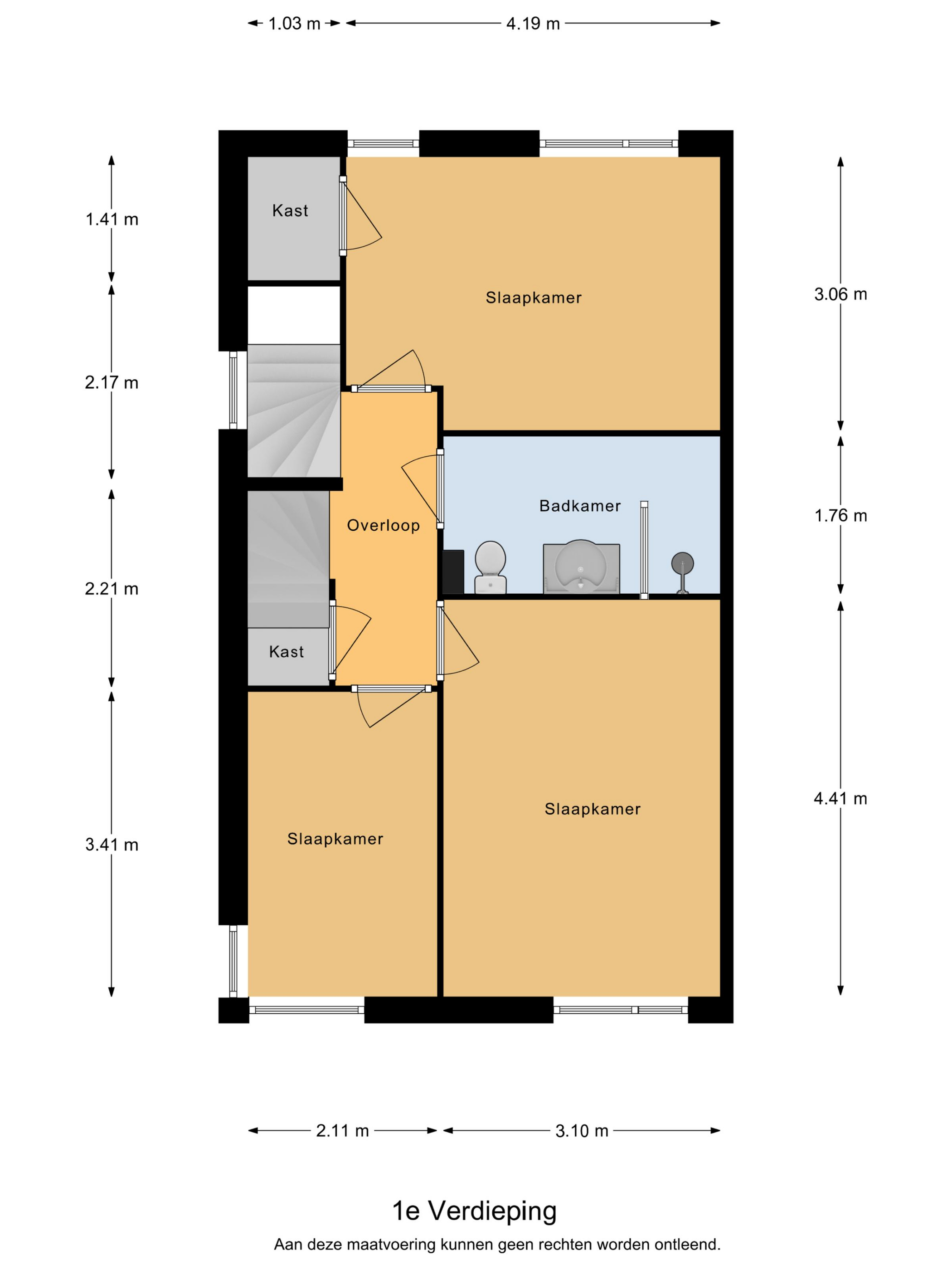 De eerste verdieping is bereikbaar via de vaste trap en komt uit op een ruime overloop. Vanaf hier zijn drie volwaardige slaapkamers en de moderne badkamer toegankelijk. De hoofdslaapkamer ligt aan de achterzijde van de woning en biedt een prettige, lichte ruimte. Hier is voldoende plaats voor een royaal tweepersoonsbed, nachtkastjes en een grote kledingkast. Daarnaast beschikt deze kamer over een praktische ingebouwde kast, ideaal voor extra opbergruimte.