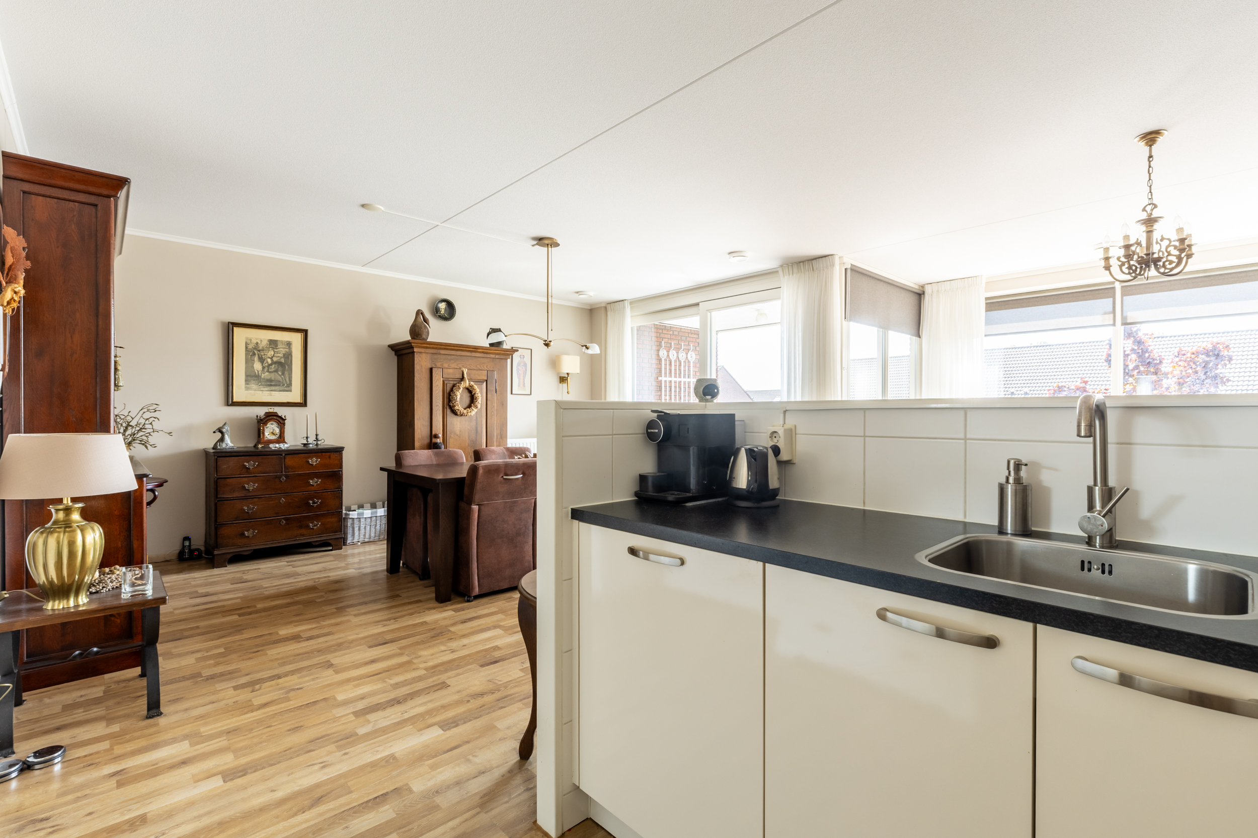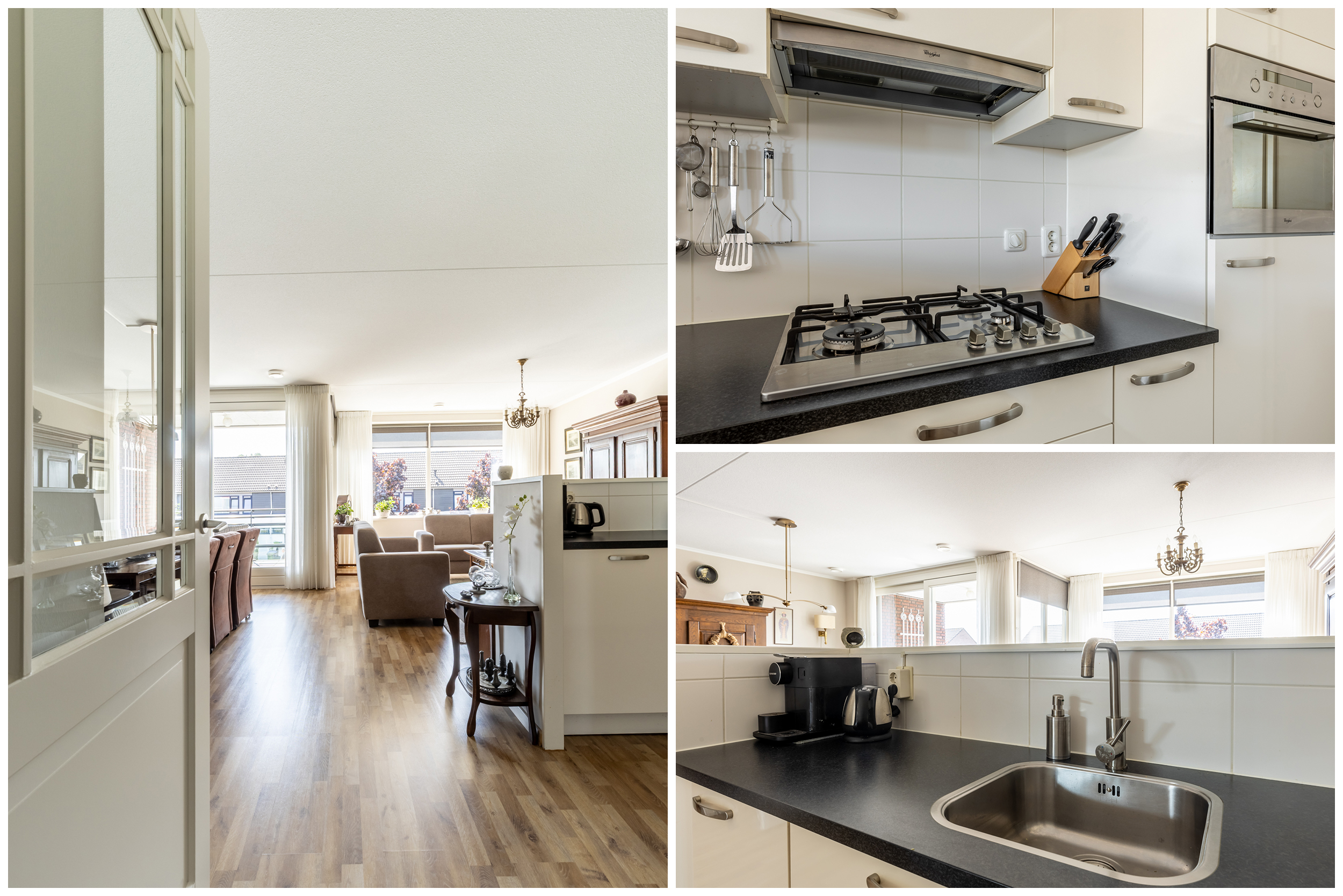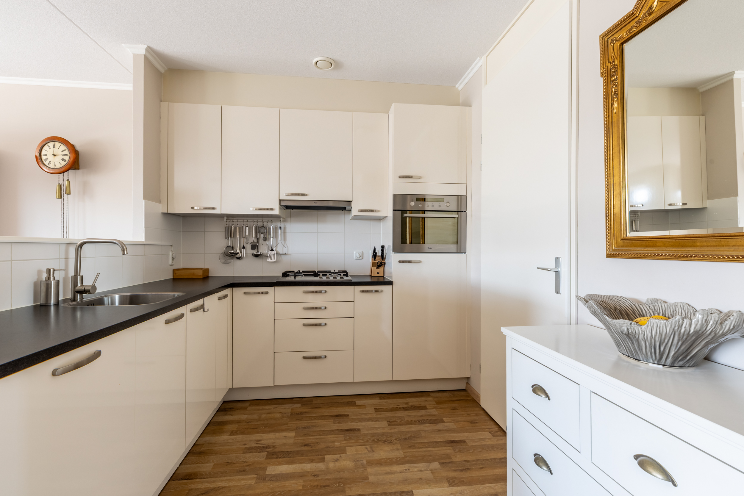 De half open keuken staat in verbinding met de woonkamer en heeft een moderne uitstraling. De keuken is van alle gemakken voorzien, waaronder een gaskookplaat, oven, afzuigkap, vaatwasmachine en koelkast. Vanuit de keuken is een inpandige berging toegankelijk. Hierin vindt u o.a. de wasmachineaansluiting, cv-ketel en unit van de mechanische ventilatie.