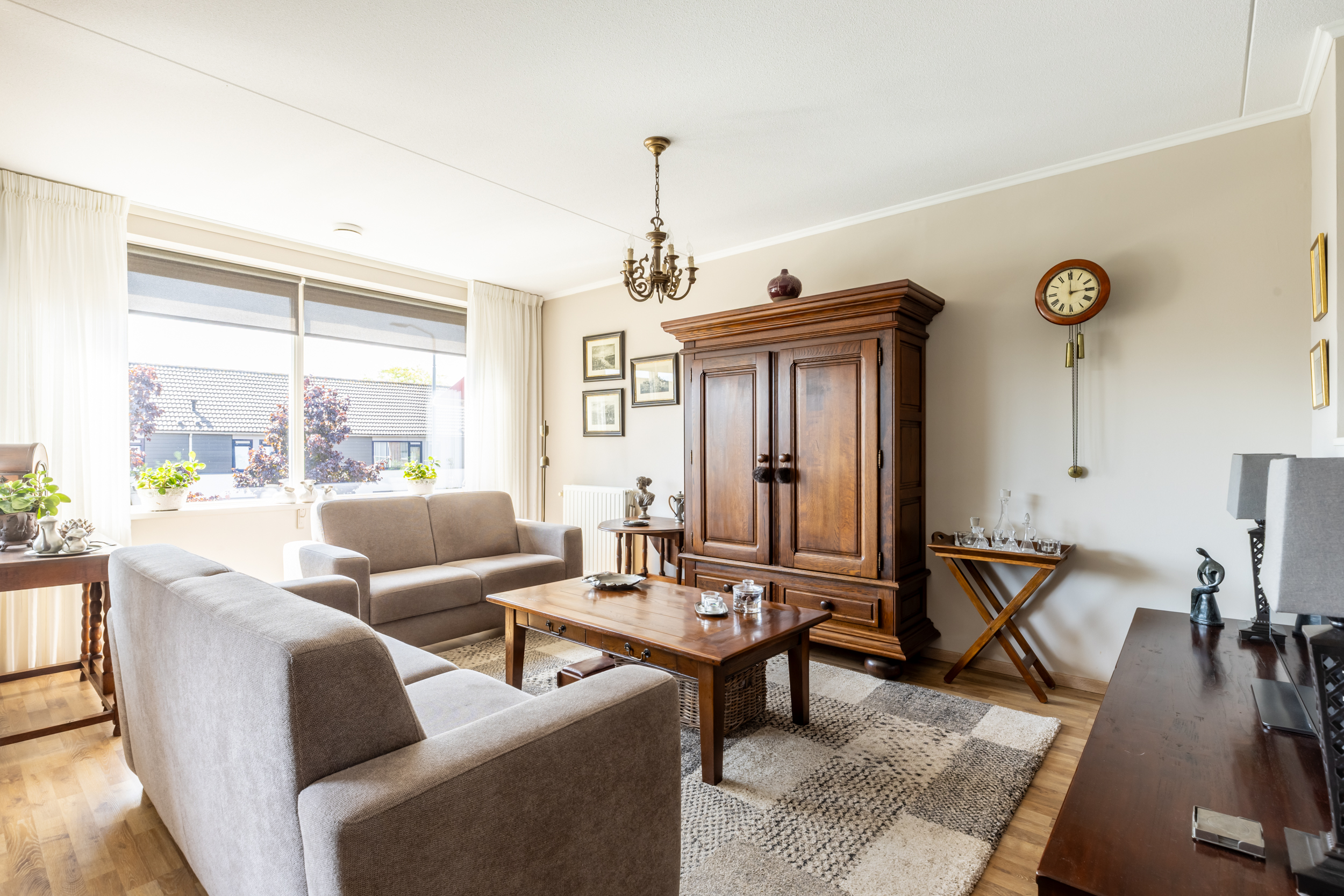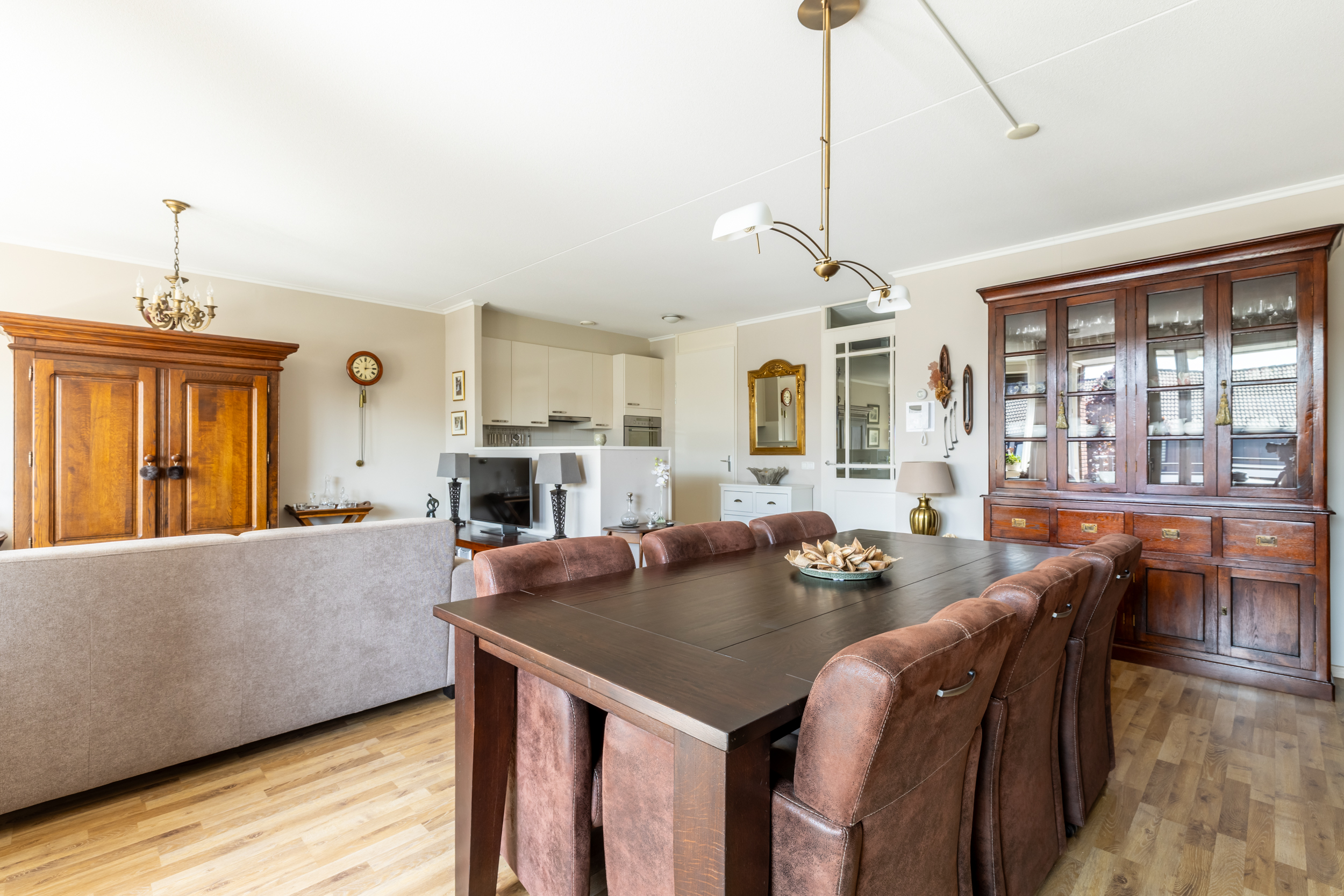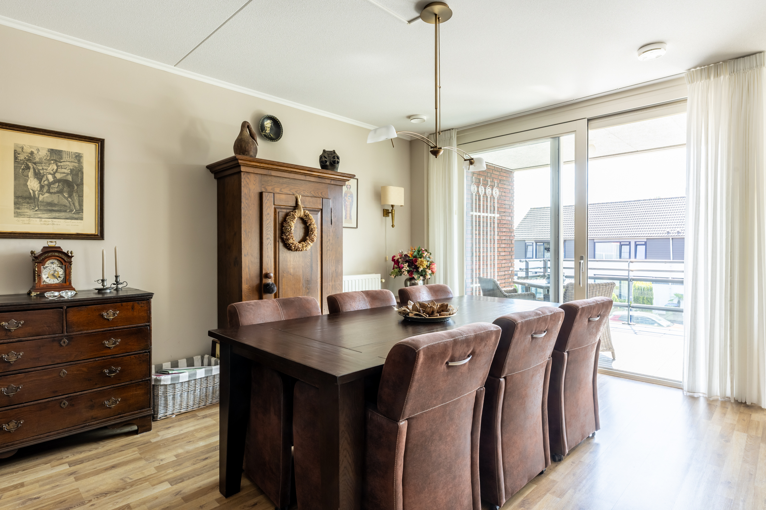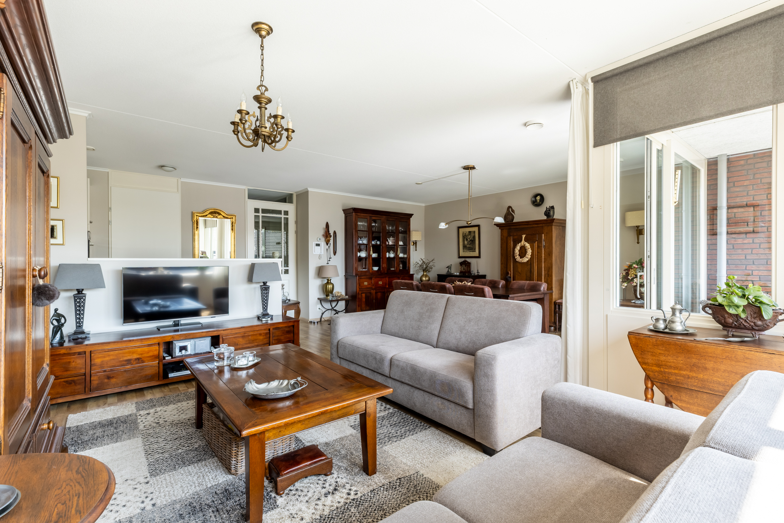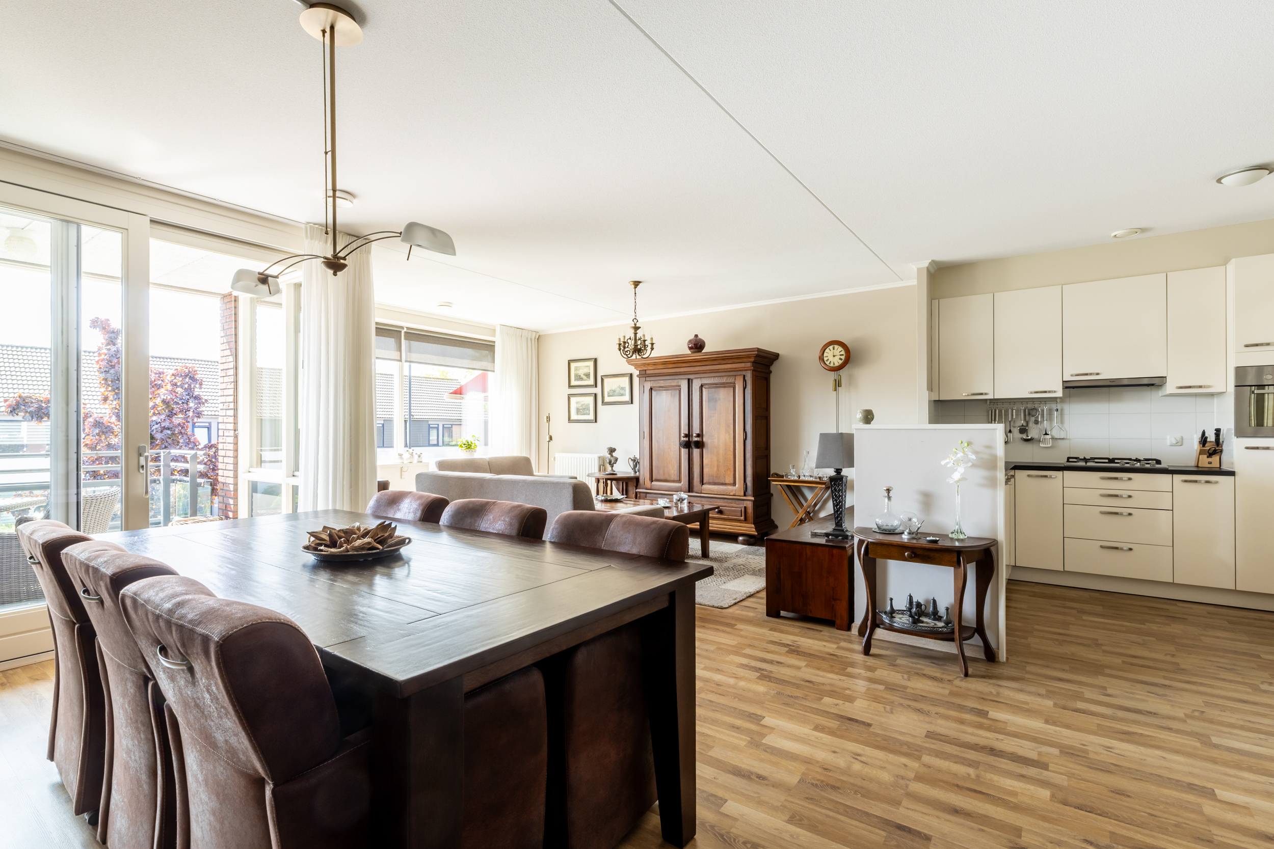 De woonkamer is royaal opgezet en voorzien van grote raampartijen, waardoor er veel natuurlijk licht naar binnen valt. Er is voldoende ruimte voor zowel een gezellige zithoek als een grote eettafel. Vanuit de woonkamer heeft u toegang tot het ruime, half overdekte balkon.