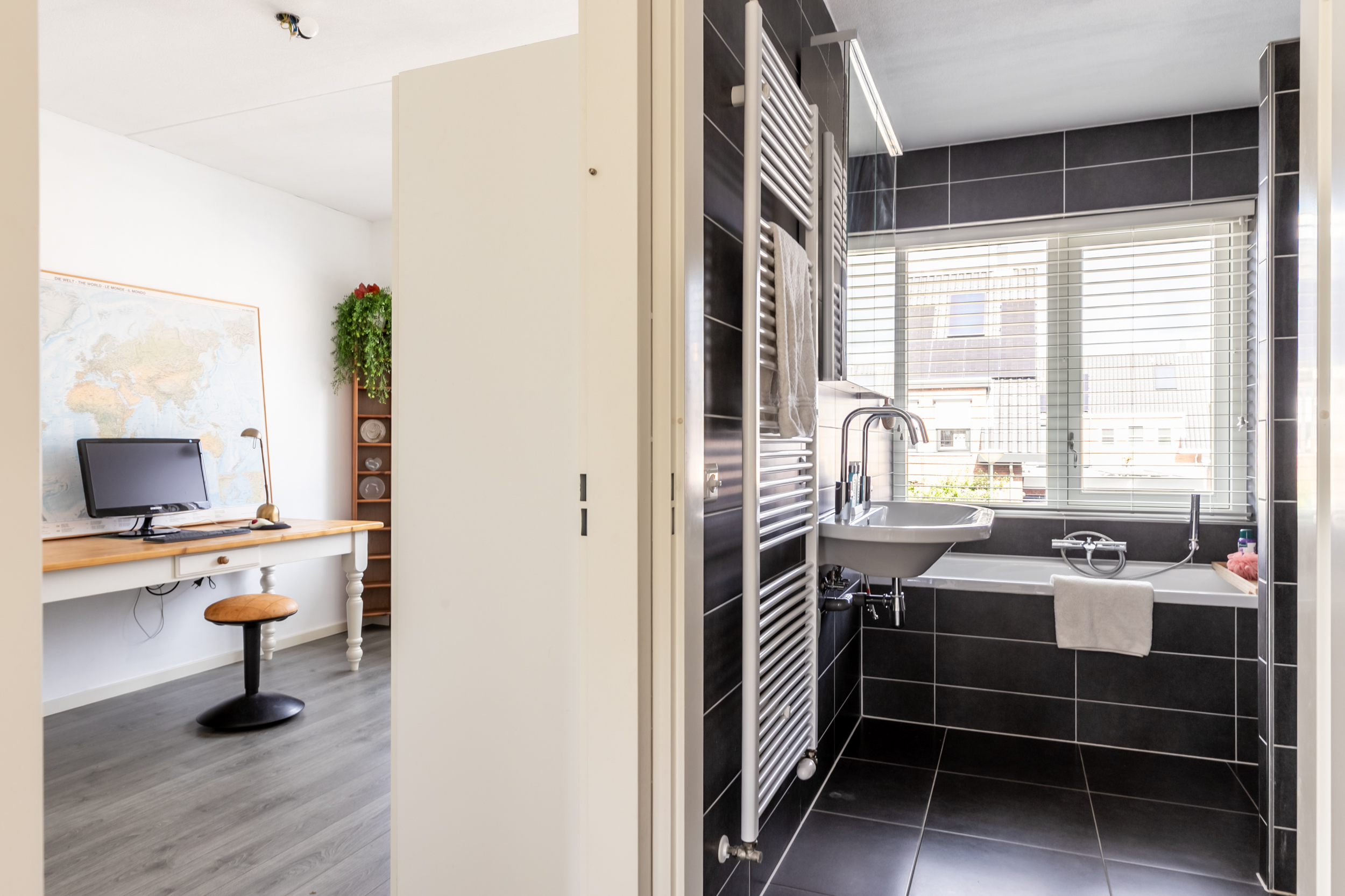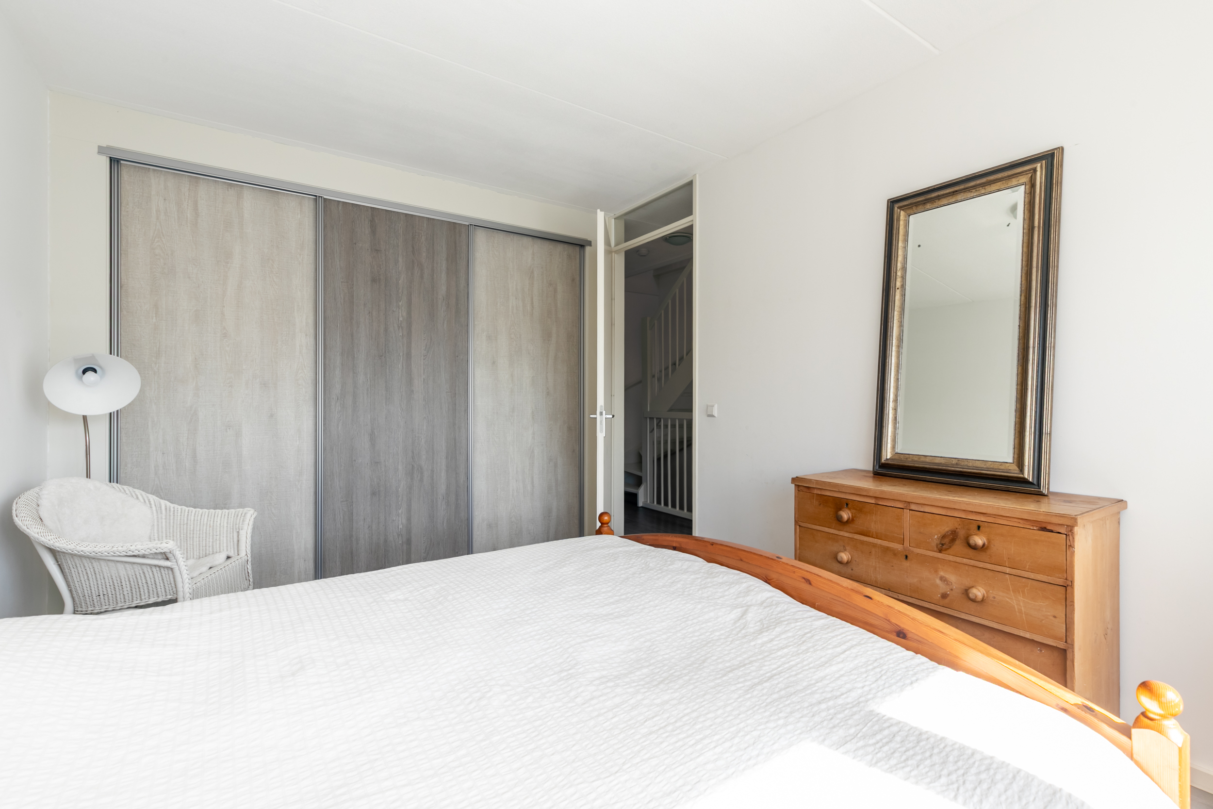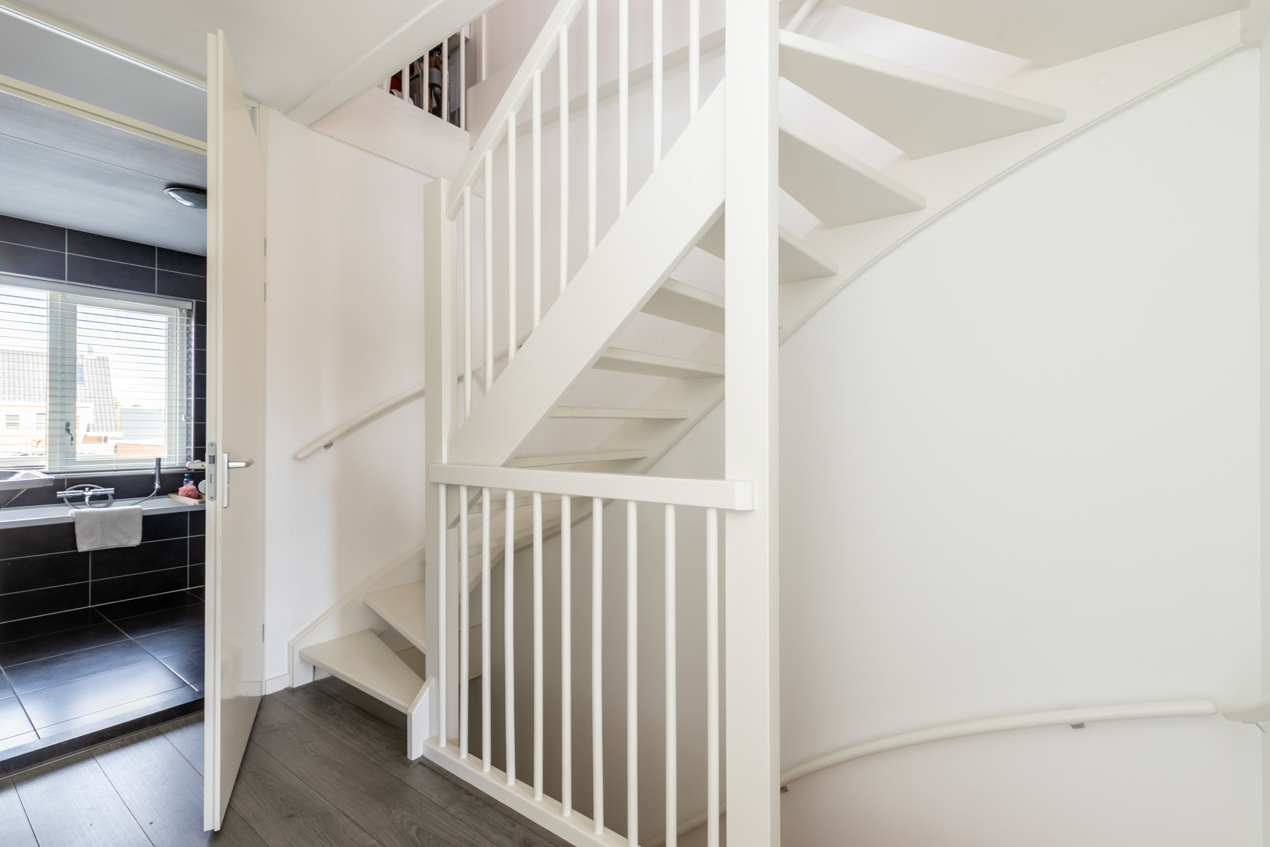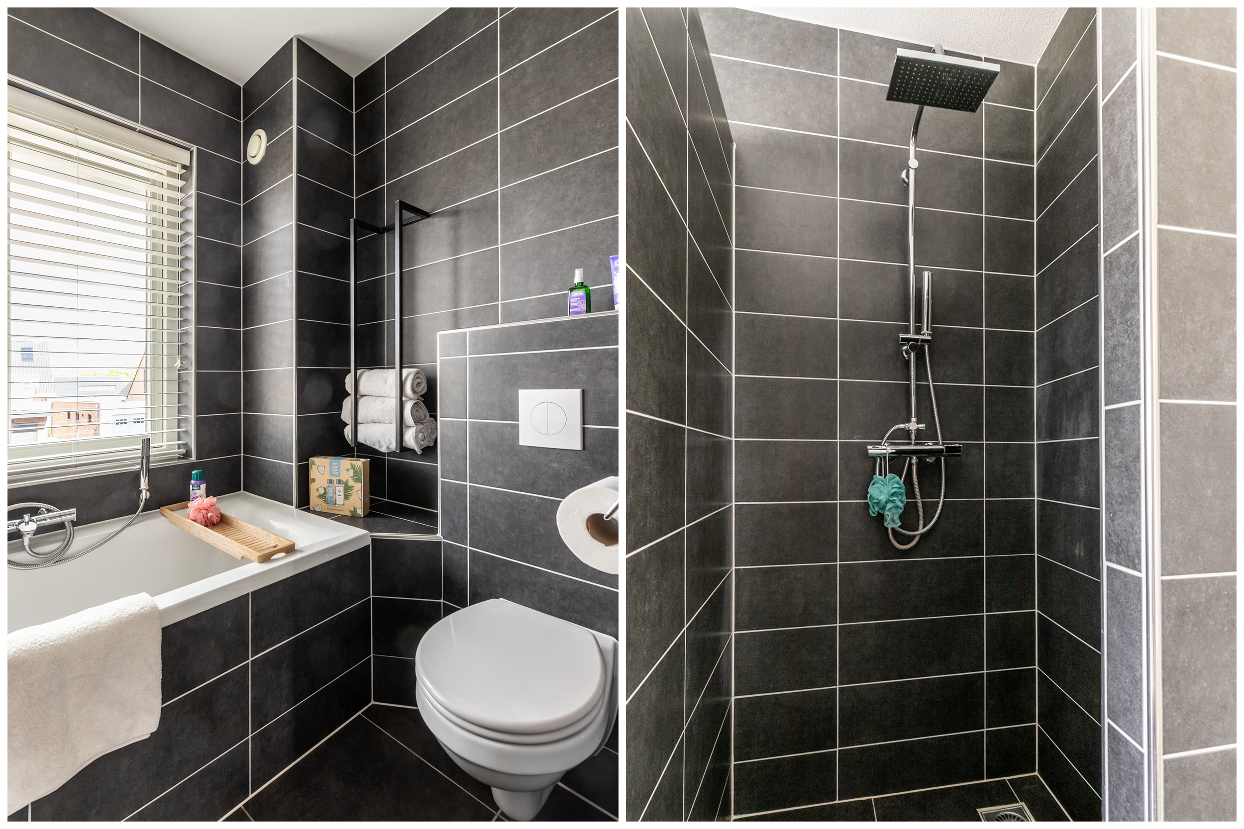 Via de trap in de entree bereik je de overloop van de eerste verdieping. Hier bevinden zich drie slaapkamers en de badkamer. De ruime hoofdslaapkamer aan de achterzijde is voorzien van een praktische inbouwkast over de volledige breedte. Aan de voorzijde ligt de tweede, eveneens ruime slaapkamer, groot genoeg voor een tweepersoonsbed. De derde kamer aan de achterzijde is ideaal als kinderkamer, werkkamer of inloopkast. De moderne badkamer maakt het geheel compleet en biedt alle comfort met een ligbad, een inloopdouche, een dubbele wastafel en een toilet.