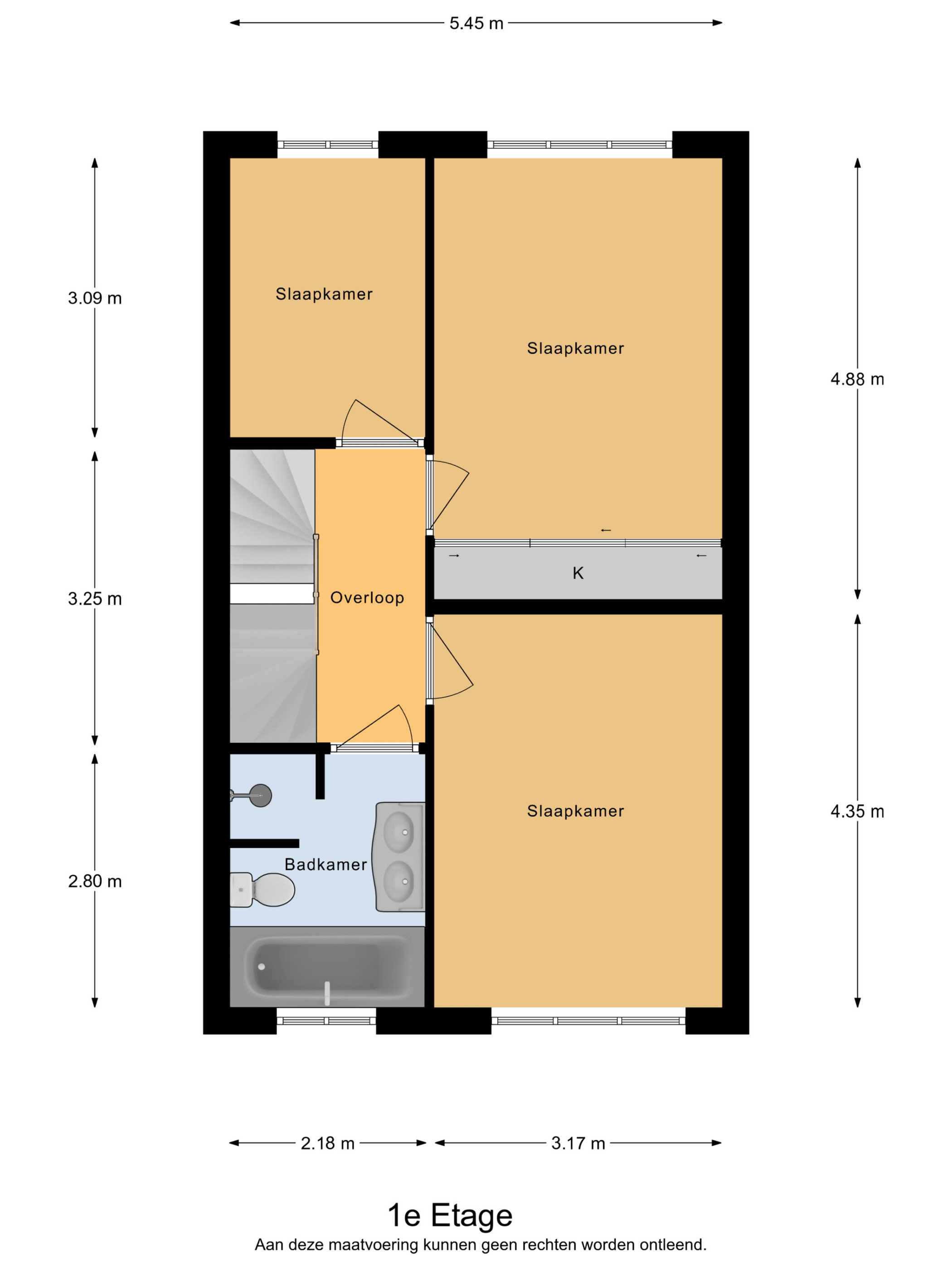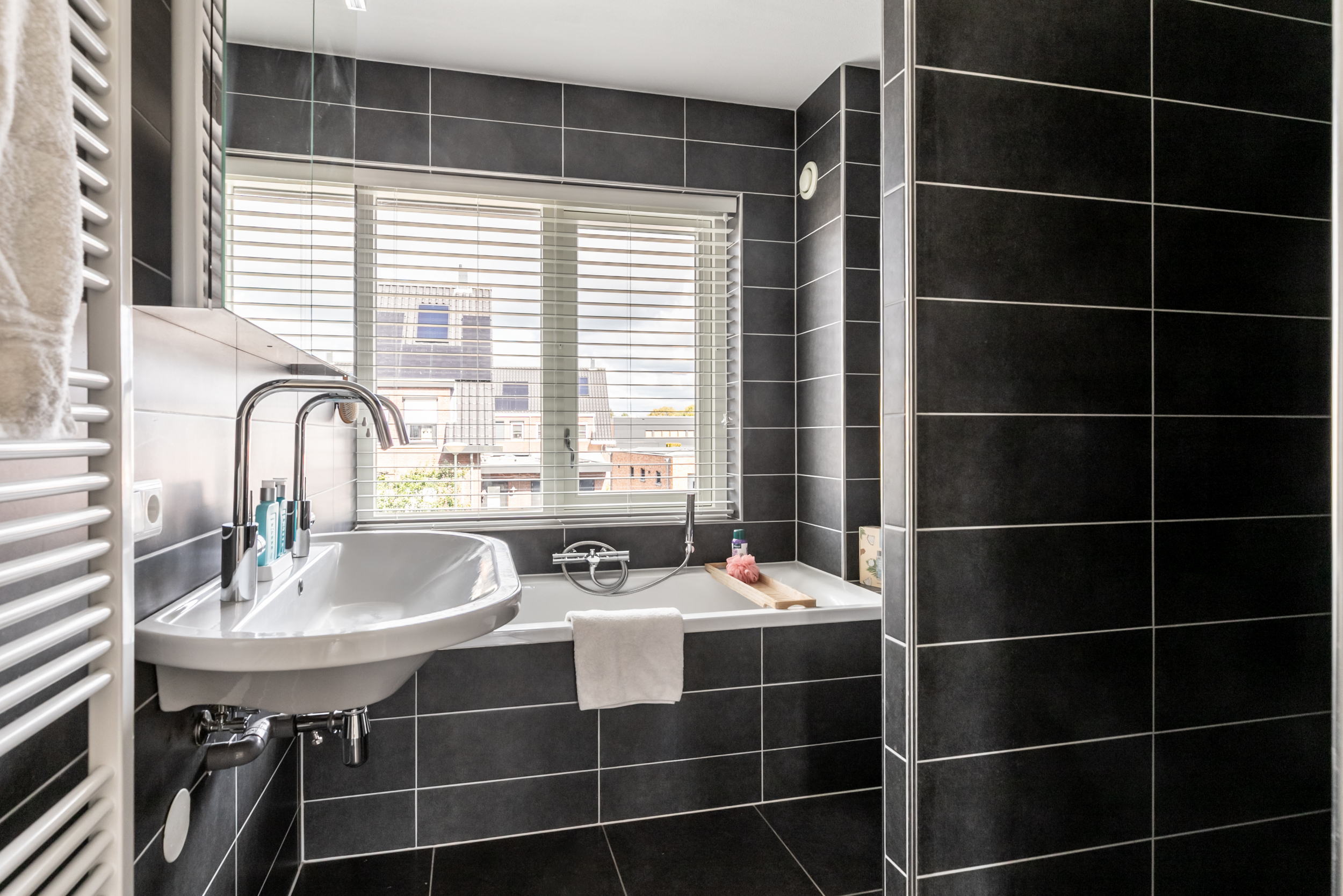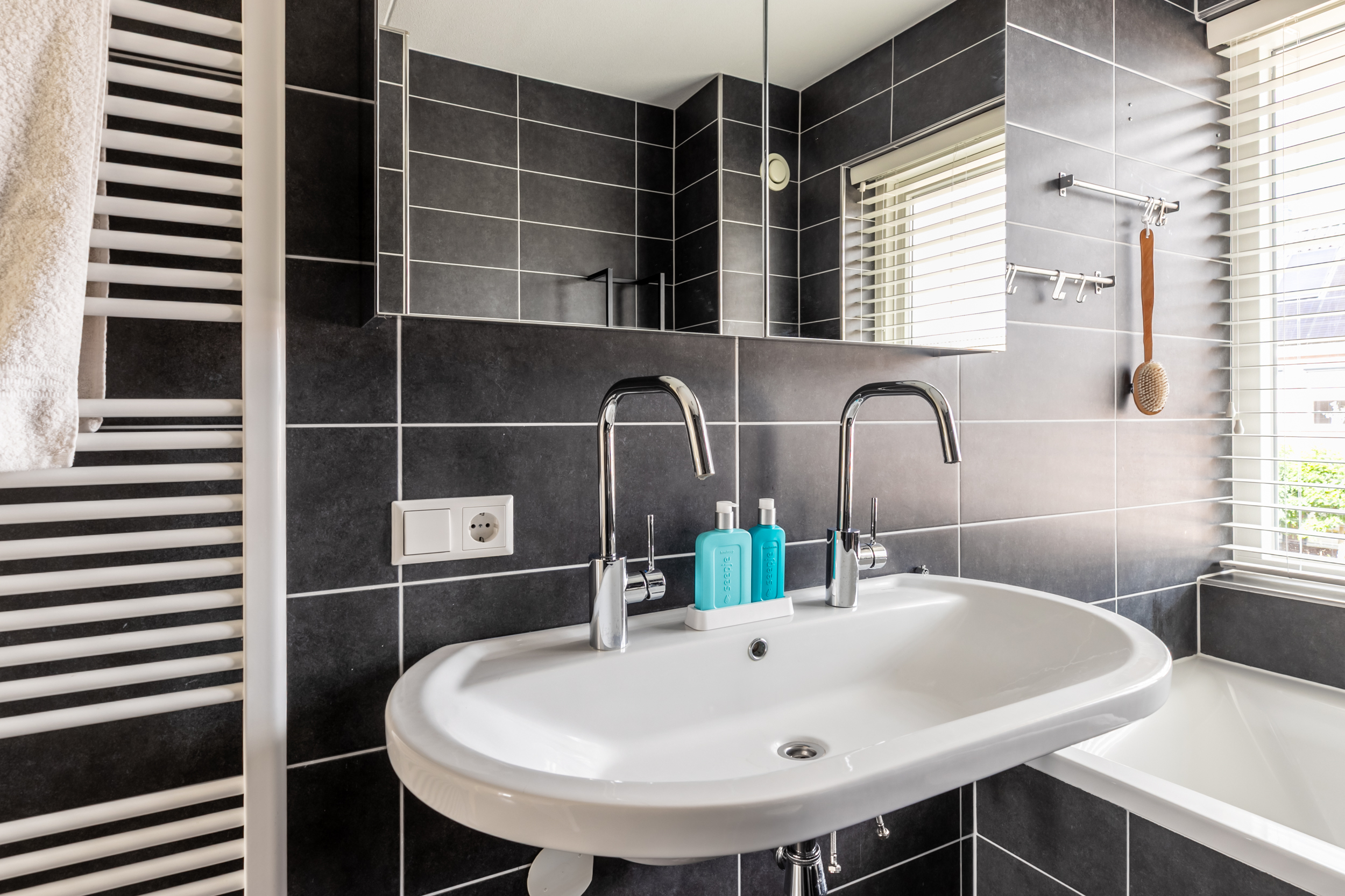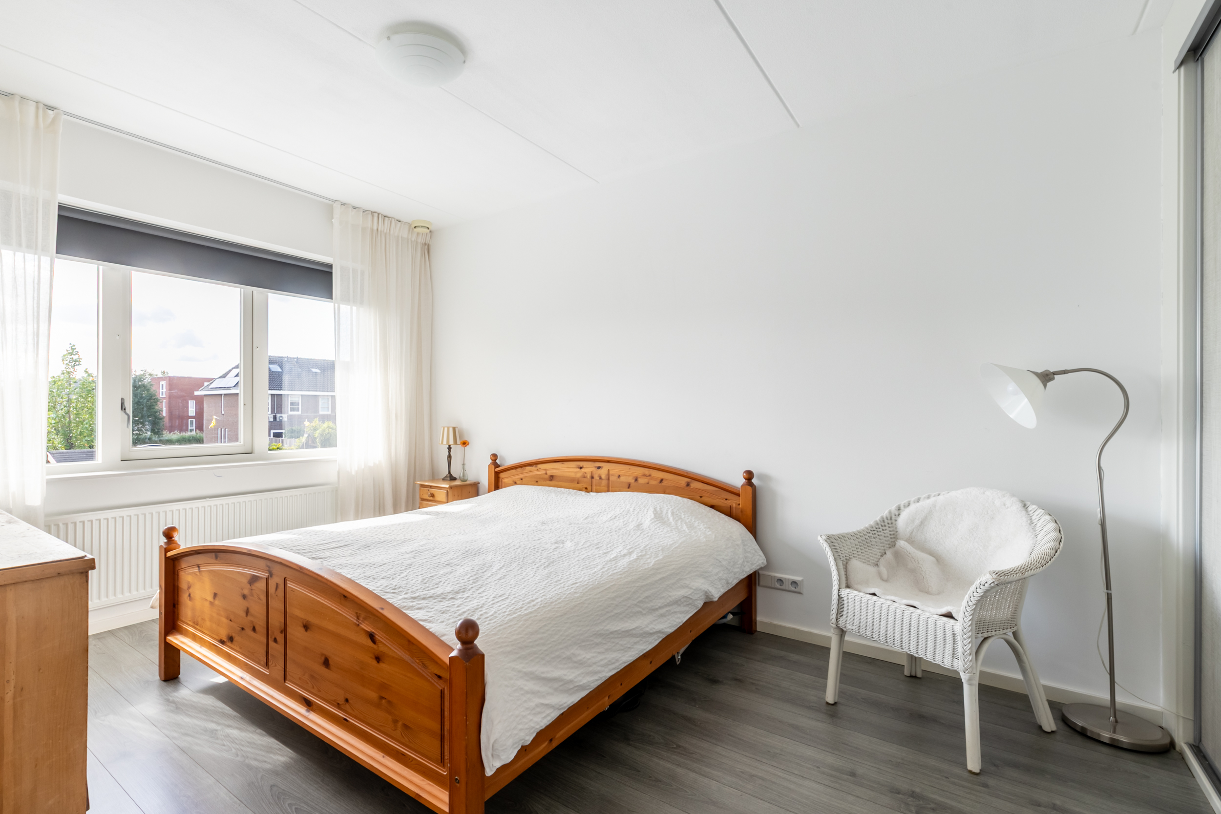 Via de trap in de entree bereik je de overloop van de eerste verdieping. Hier bevinden zich drie slaapkamers en de badkamer. De ruime hoofdslaapkamer aan de achterzijde is voorzien van een praktische inbouwkast over de volledige breedte. Aan de voorzijde ligt de tweede, eveneens ruime slaapkamer, groot genoeg voor een tweepersoonsbed. De derde kamer aan de achterzijde is ideaal als kinderkamer, werkkamer of inloopkast. De moderne badkamer maakt het geheel compleet en biedt alle comfort met een ligbad, een inloopdouche, een dubbele wastafel en een toilet.