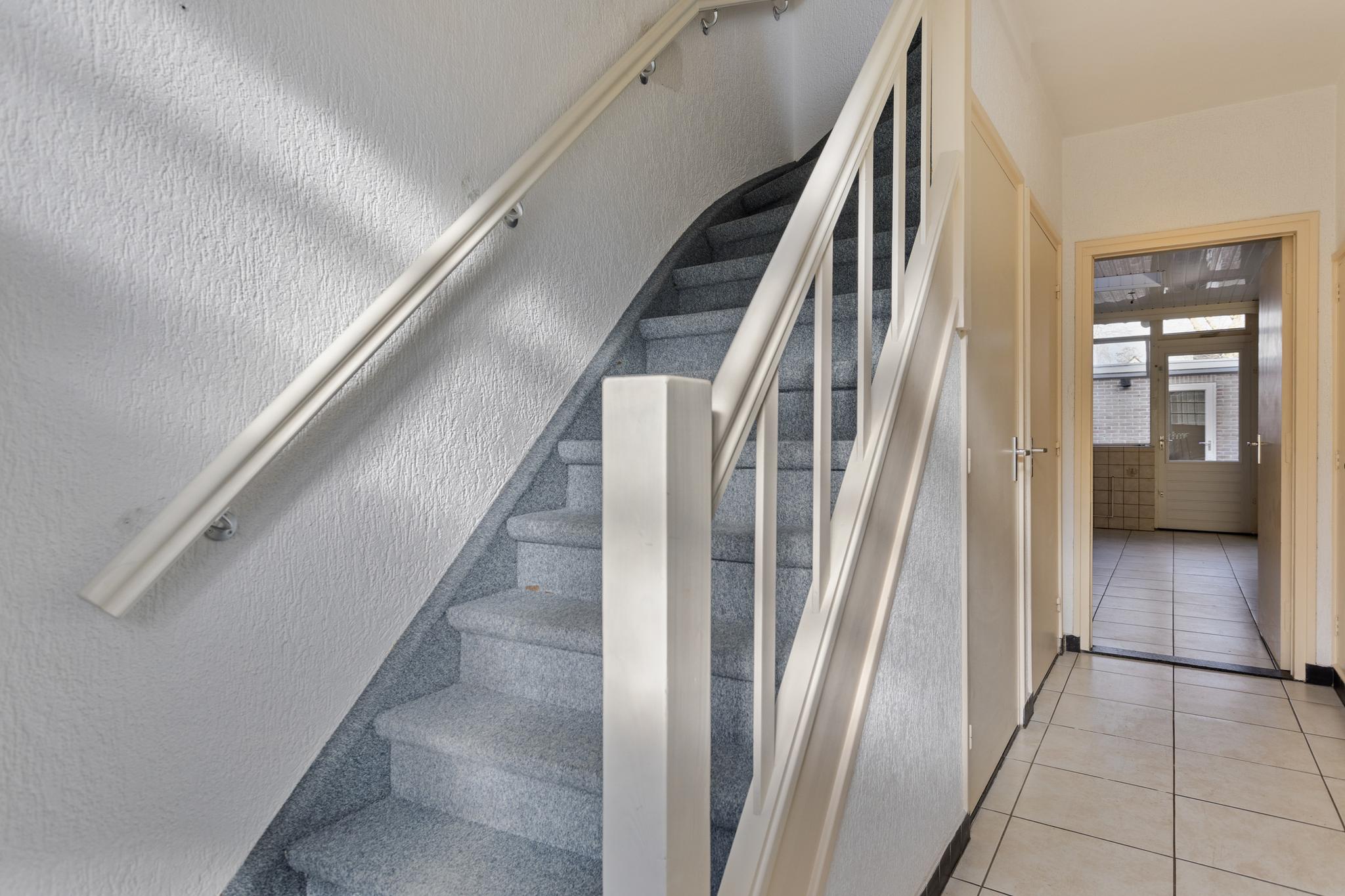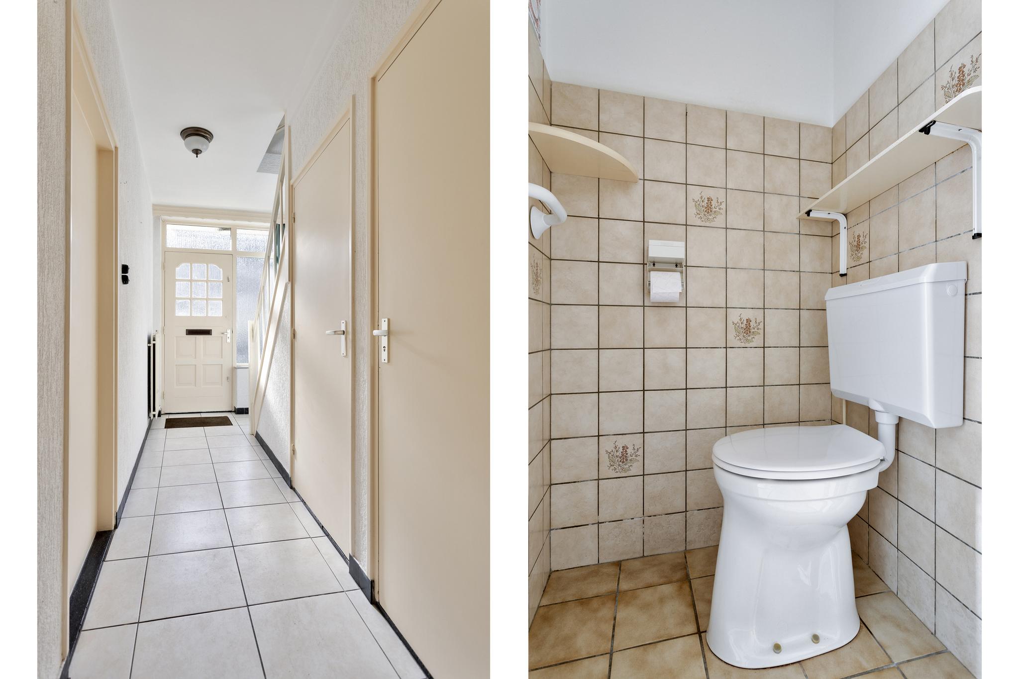 Bij binnenkomst word je verwelkomd in een ruime en lichte hal. Hier bevinden zich de meterkast, de vaste trap naar de eerste verdieping, een toilet, een voorraadkast en de doorgangen naar zowel de keuken als de woonkamer. De gehele begane grond is voorzien van een fraai aangelegde tegelvloer.