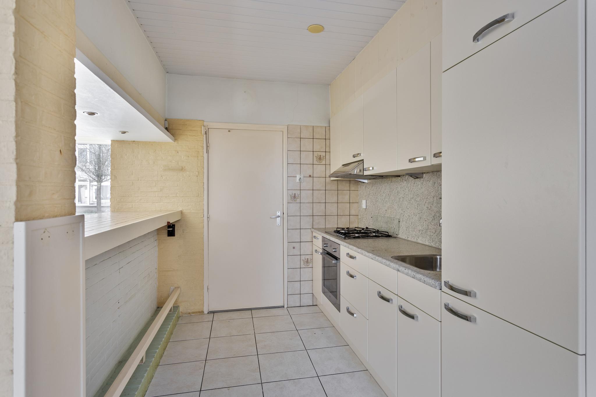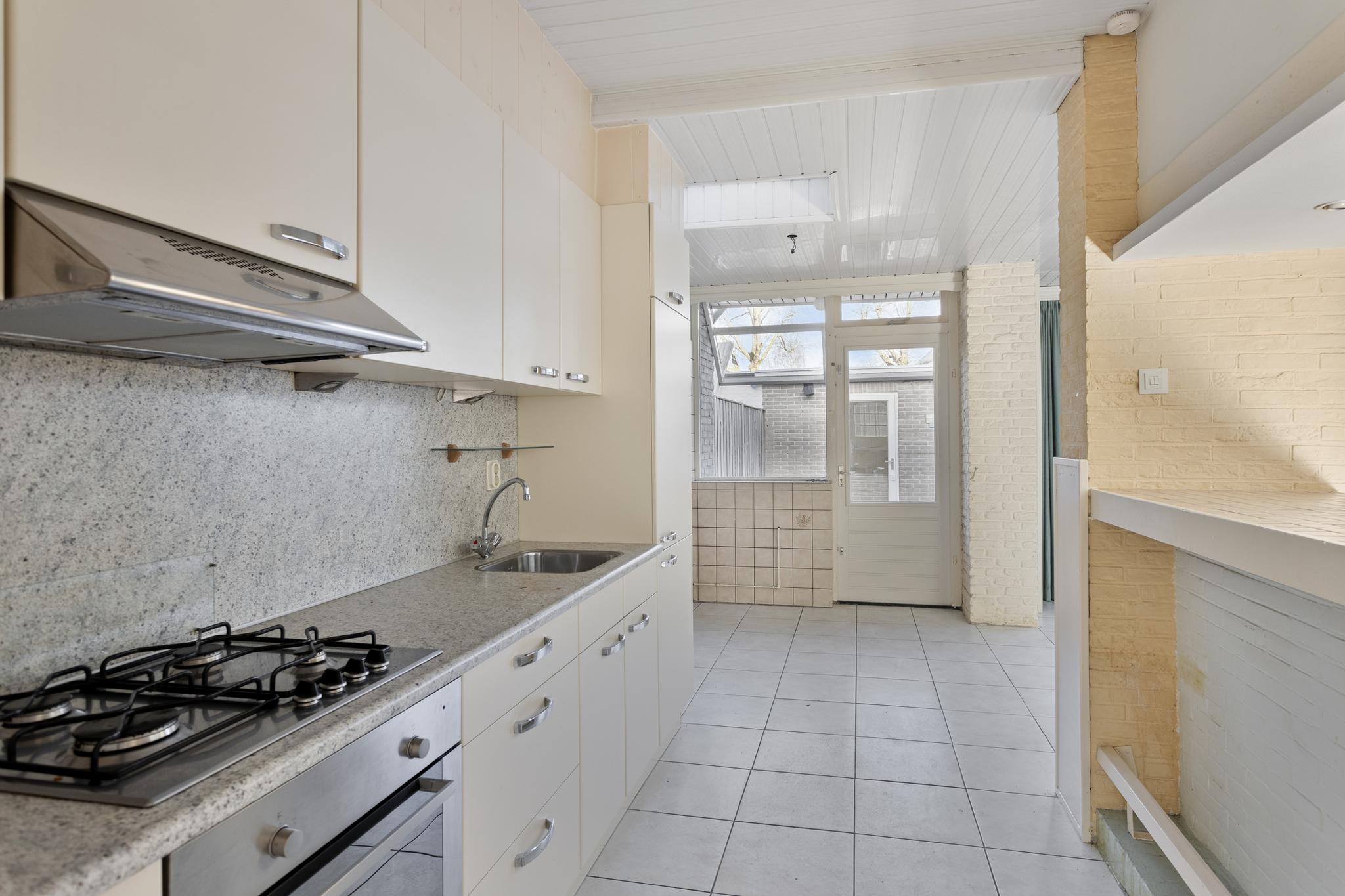De huidige opstelling van de keuken is voorzien van een gasfornuis, een oven, een ingebouwde koelkast en een afzuigkap. Deze functionele indeling biedt alles wat je nodig hebt voor het bereiden van heerlijke maaltijden. De keuken biedt volop mogelijkheden om naar wens te moderniseren of in te richten, afhankelijk van je voorkeuren.