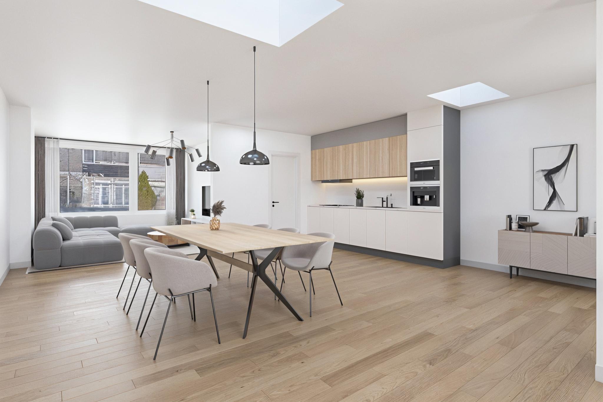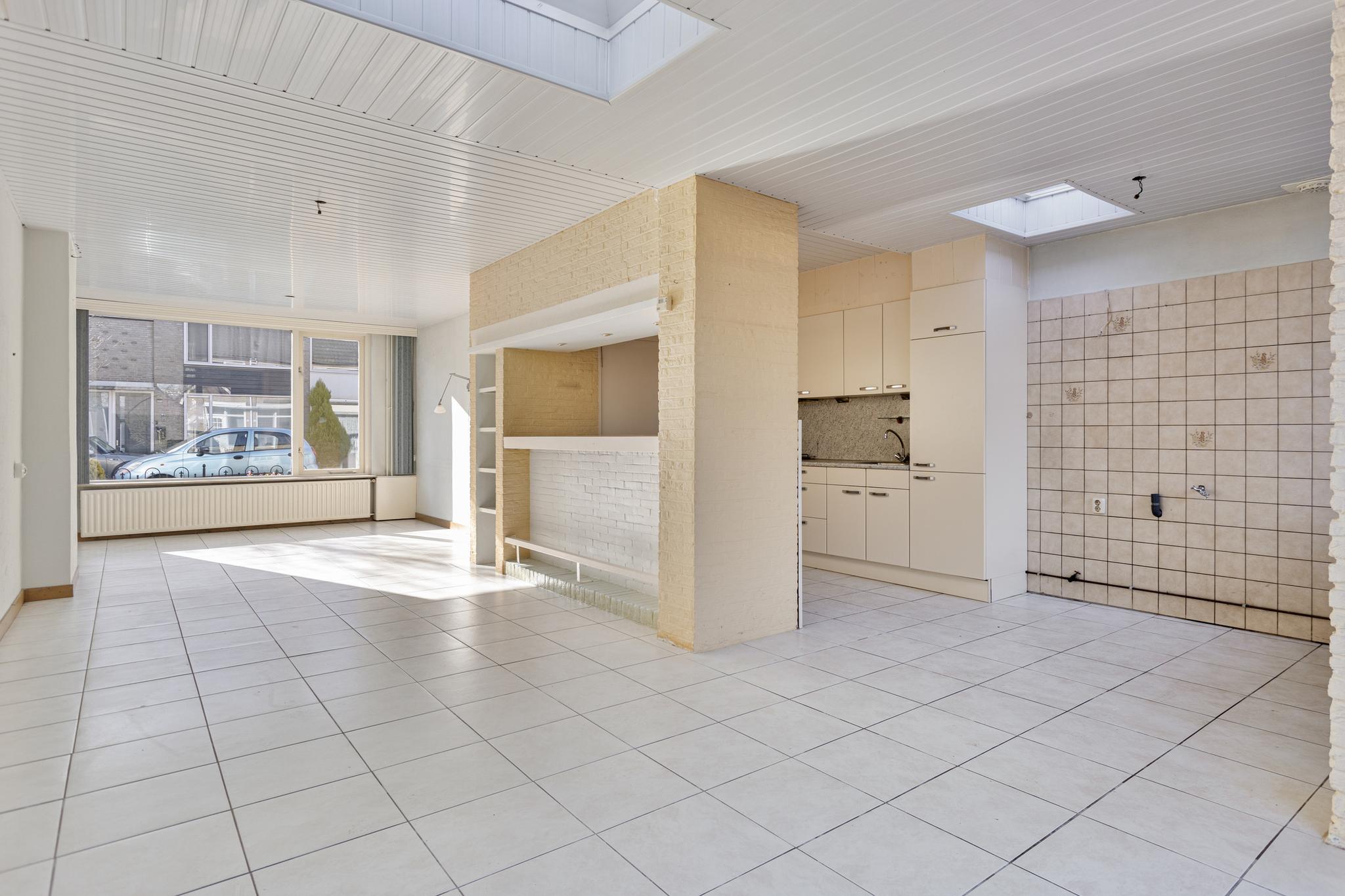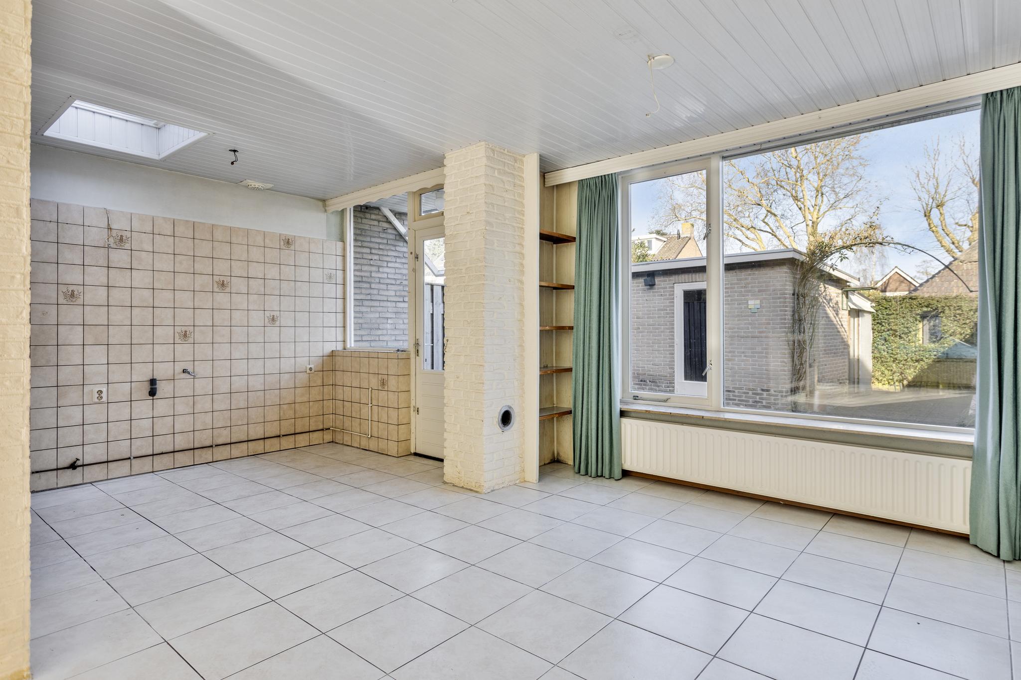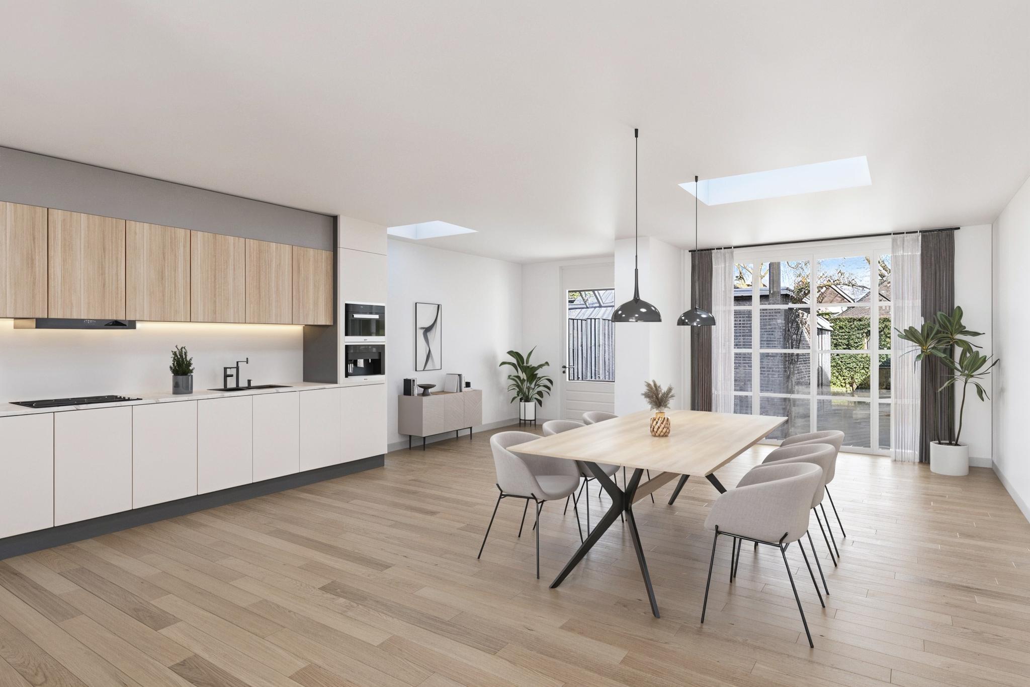 Deze ruime woonkamer met uitbouw kenmerkt zich door de grote raampartijen, waardoor er veel natuurlijk licht naar binnen stroomt. De ruimte biedt volop mogelijkheden voor een mooie inrichting. Aan de voorzijde kun je een gezellig woongedeelte creëren, terwijl je in het midden een open keuken met een fraai keuken eiland kunt plaatsen. Het eetgedeelte kan perfect aan de achterzijde van de woning worden gepositioneerd. Via de loopdeur is er direct toegang tot de tuin, wat zorgt voor een mooie verbinding tussen binnen en buiten.