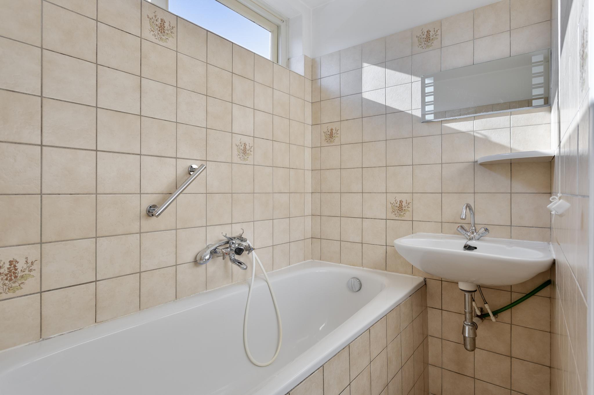 De kleine badkamer beschikt over een bad-douchecombinatie en een wastafel.
