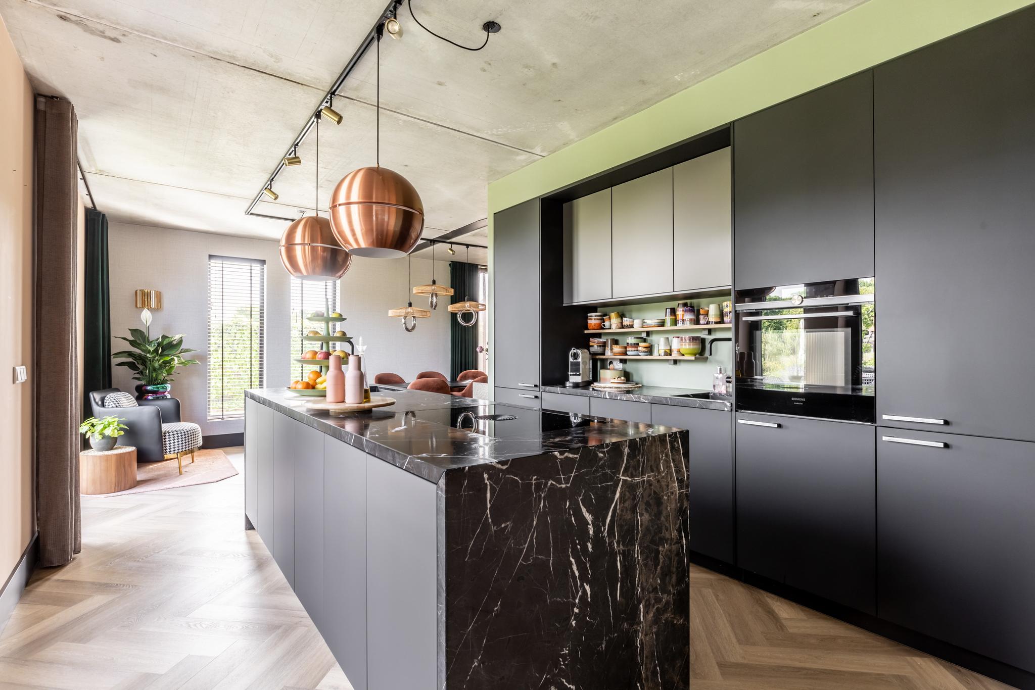 De moderne open keuken met kookeiland met marmeren afwerking is van alle gemakken voorzien. De open keuken is uitgerust met een Bora inductie kookplaat met geïntegreerde afzuiging, combi-stoom/magnetron, dubbele koel-vriescombinatie, vaatwasser en een Quooker kraan. Aansluitend aan de keuken vind je de tuinkamer, een lichte en rustige ruimte met een schuifdeur naar buiten.