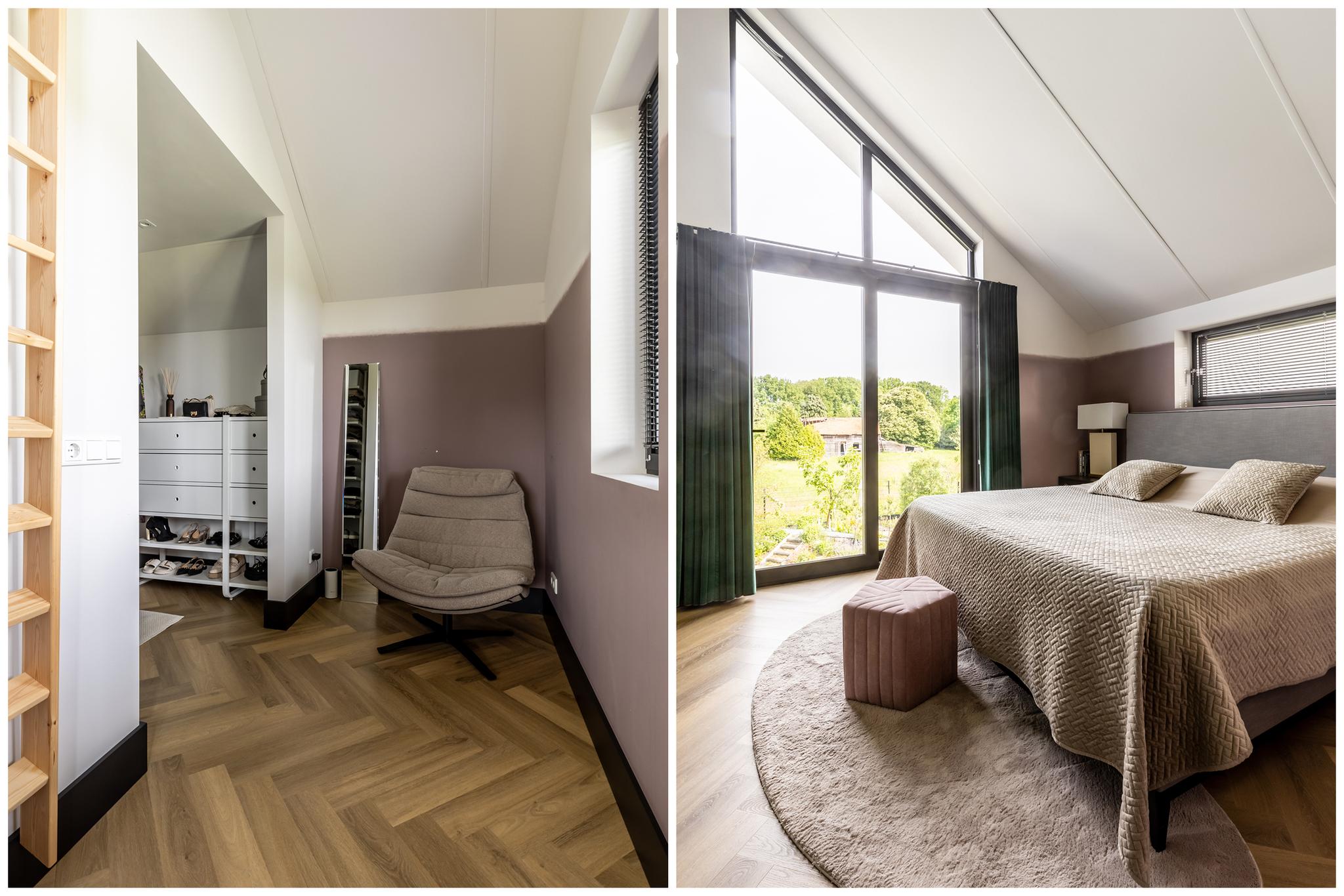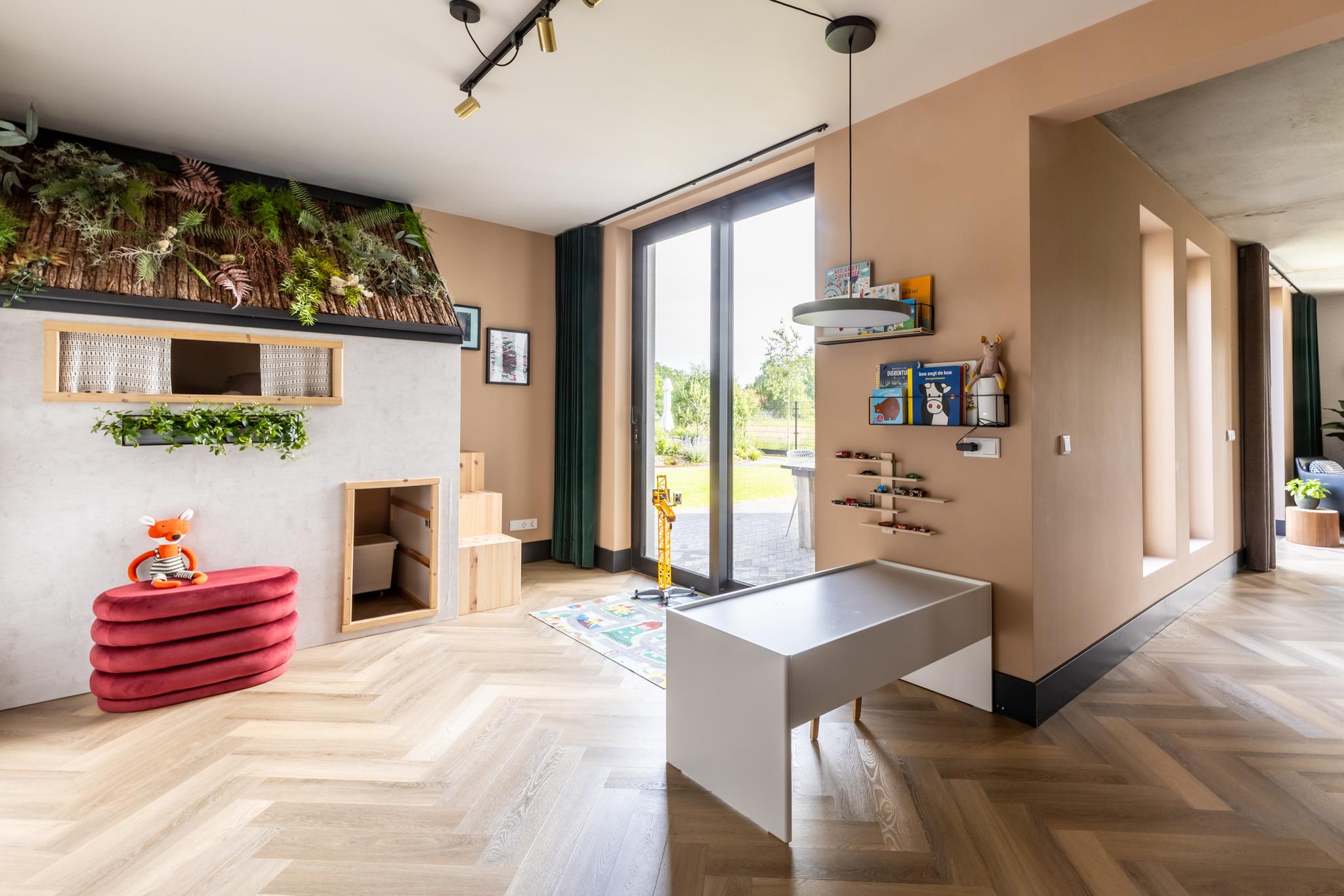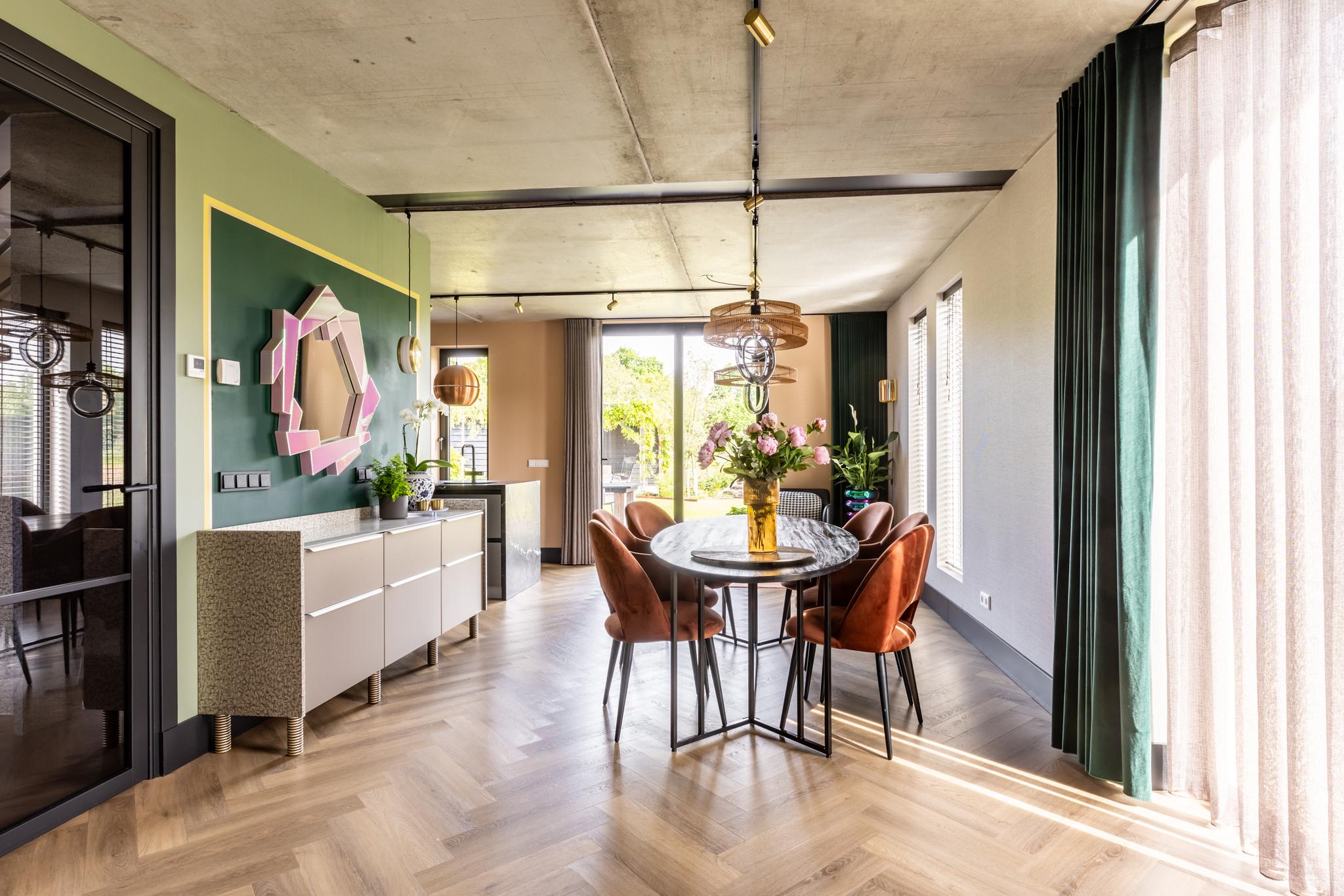 De gehele woning is voorzien van vloerverwarming en vloerkoeling, die per ruimte ingeregeld kan worden, wat zorgt voor een aangenaam binnenklimaat in alle seizoenen. De woonkamer is ruim opgezet en door een stijlvolle kast opgedeeld in een zitgedeelte en een eetkamer. Dankzij de grote raampartijen stroomt het daglicht rijkelijk naar binnen wat de ruimte een open en warme sfeer geeft. Het zitgedeelte biedt genoeg ruimte voor een royale hoekbank en extra stoelen, de perfecte plek. In het eetgedeelte is er voldoende ruimte voor een lange eettafel waar je met velen kunt tafelen. Via de schuifpui sta je hier direct op het terras, ideaal voor buiteneten zodra het weer het toelaat.