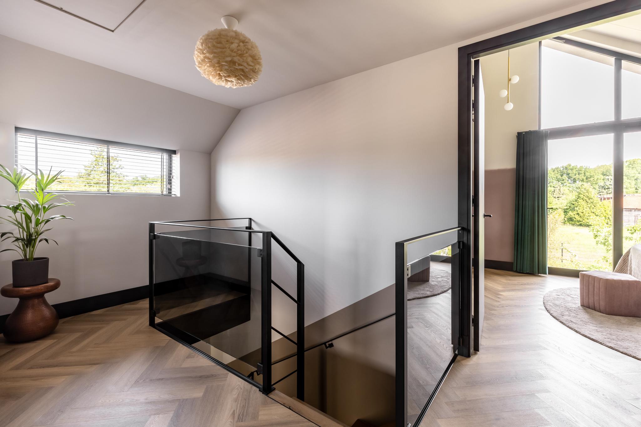 De luxe badkamer is modern en compleet ingericht. Hier vind je een ligbad, een inloopdouche, toilet en een wastafel met stijlvol wastafelmeubel. Dit is de plek vanwaar je ook weer een prachtig uitzicht hebt over de weilanden.