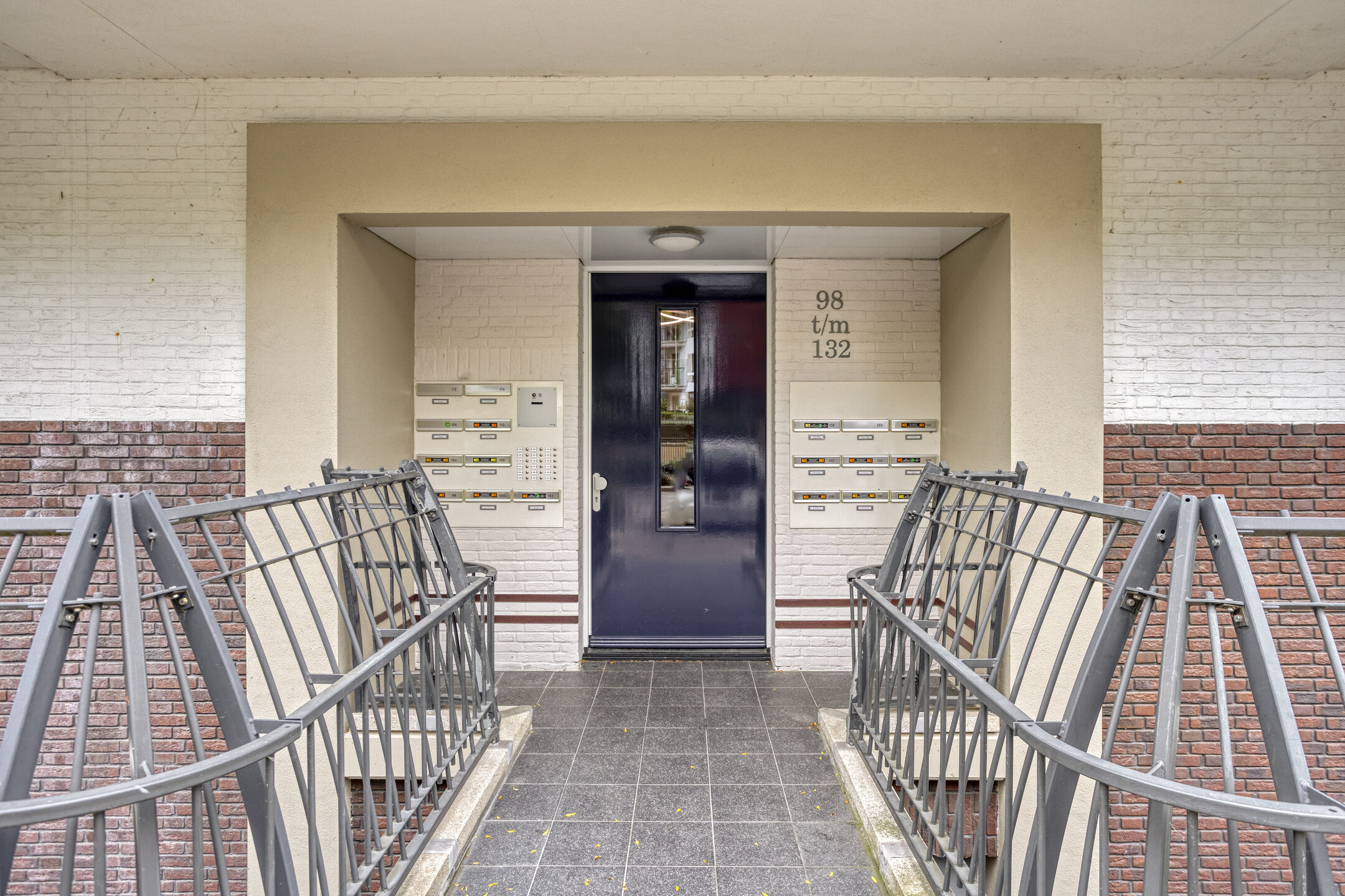 Centrale entree met bellentableau en brievenbussen, lift en trappenhuis. Vanuit hier is zowel de gezamenlijke binnentuin als het souterrain met privéberging en de parkeergarage bereikbaar.